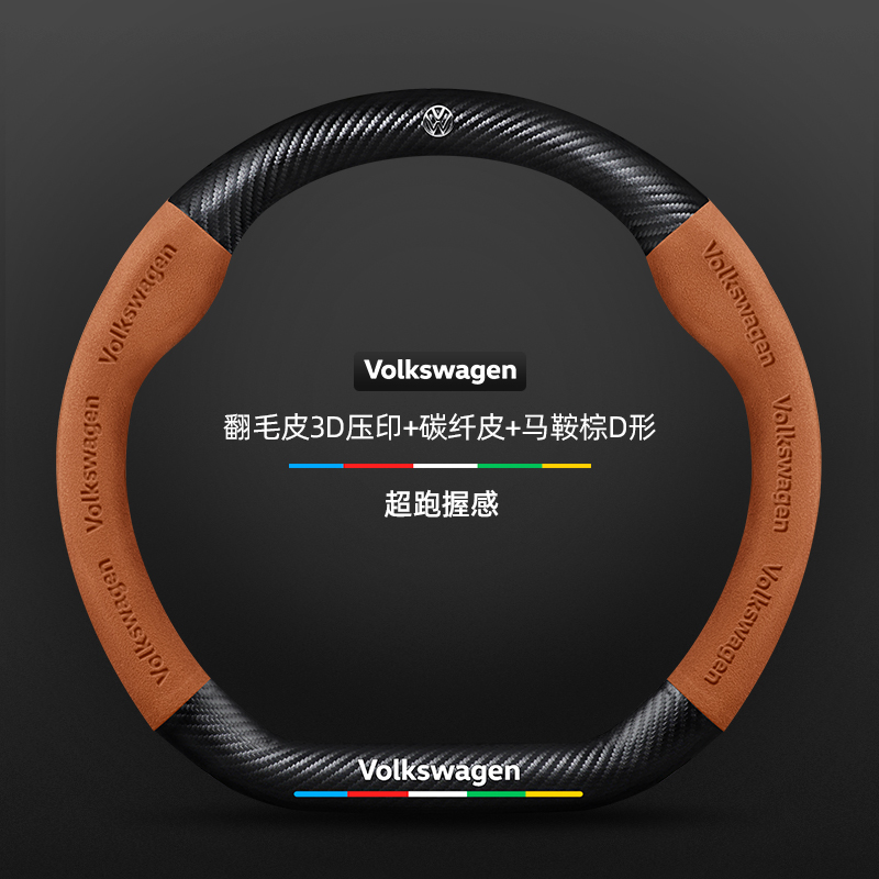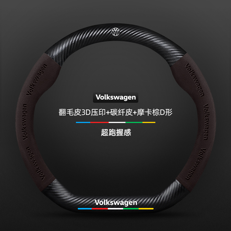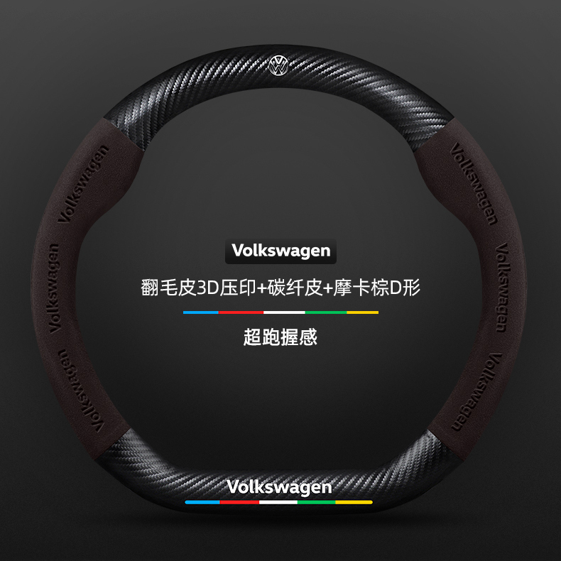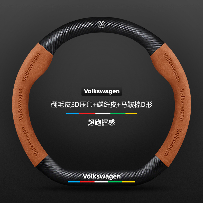 • 스웨이드 3D 엠보싱 탄소 섬유 가죽 모카 브라운 D자형 폭스바겐 로고