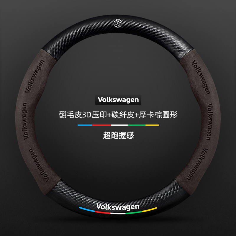 • 스웨이드 3D 엠보싱 탄소 섬유 가죽 모카 브라운 라운드 폭스바겐 로고