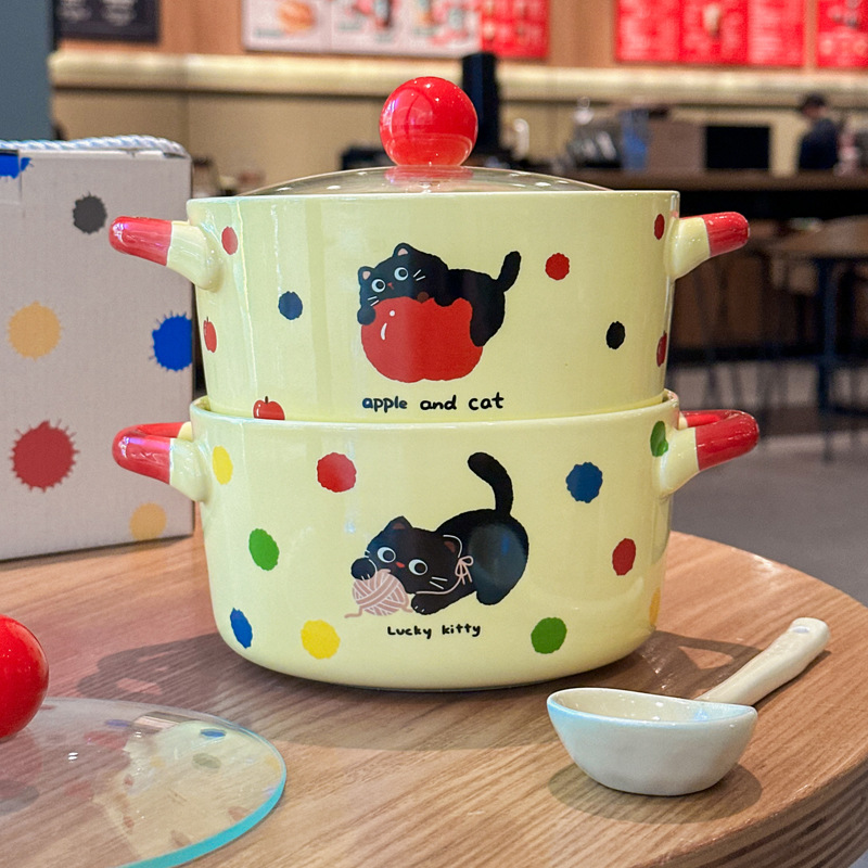 기숙사 학생들을위한 뚜껑이 달린 고가의 사과 고양이 즉석 국수 그릇 세라믹 달팽이 가루 그릇 특별한 그릇 큰 그릇 수프 그릇