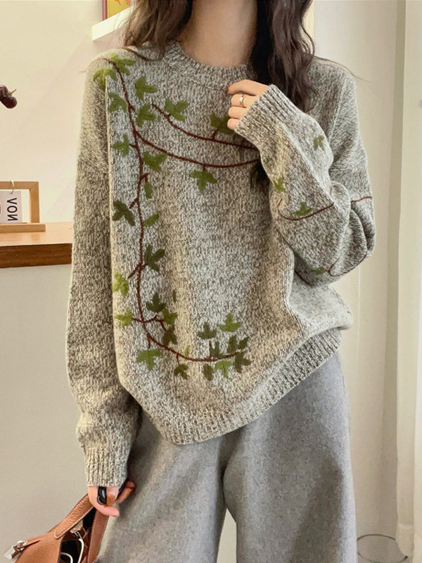 포도 나무 수놓은 캐시미어 니트 스웨터 여자 유럽 겨울 2024 새로운 유럽 여성의 느슨한 두꺼운 스웨터 트렌디