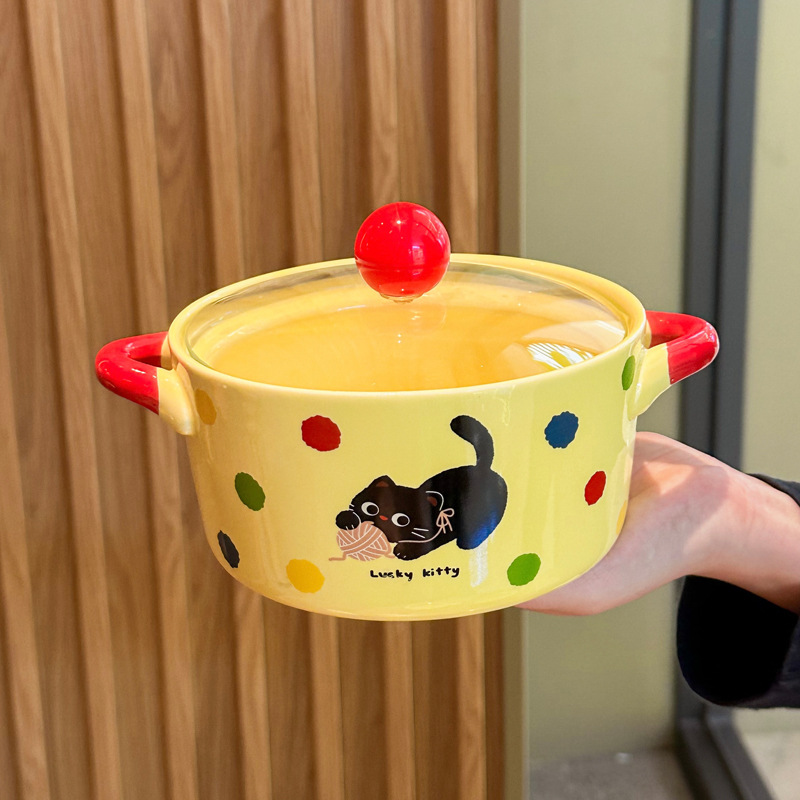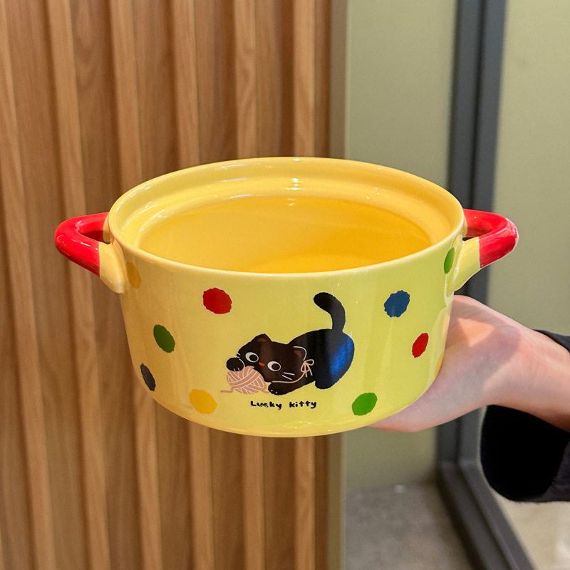 • 폴카 도트 컬러풀 고양이 라면 그릇(뚜껑 포함)