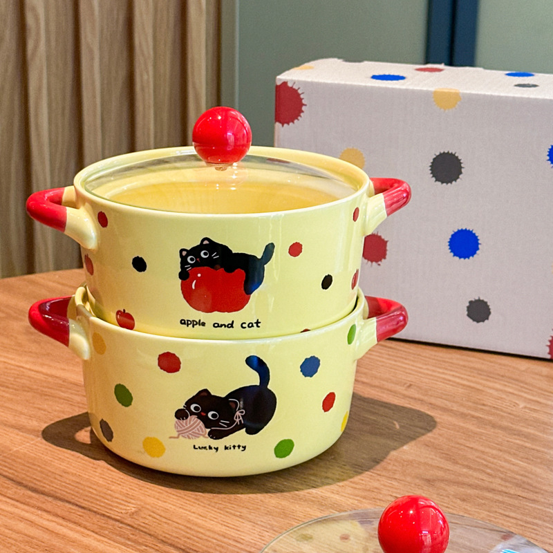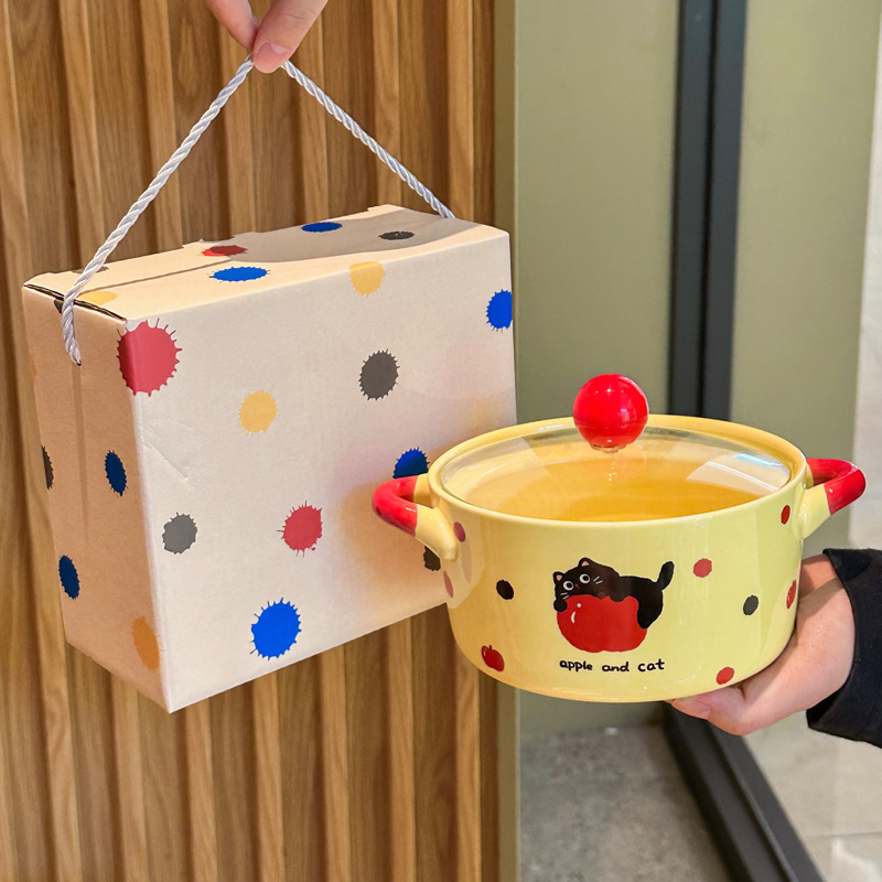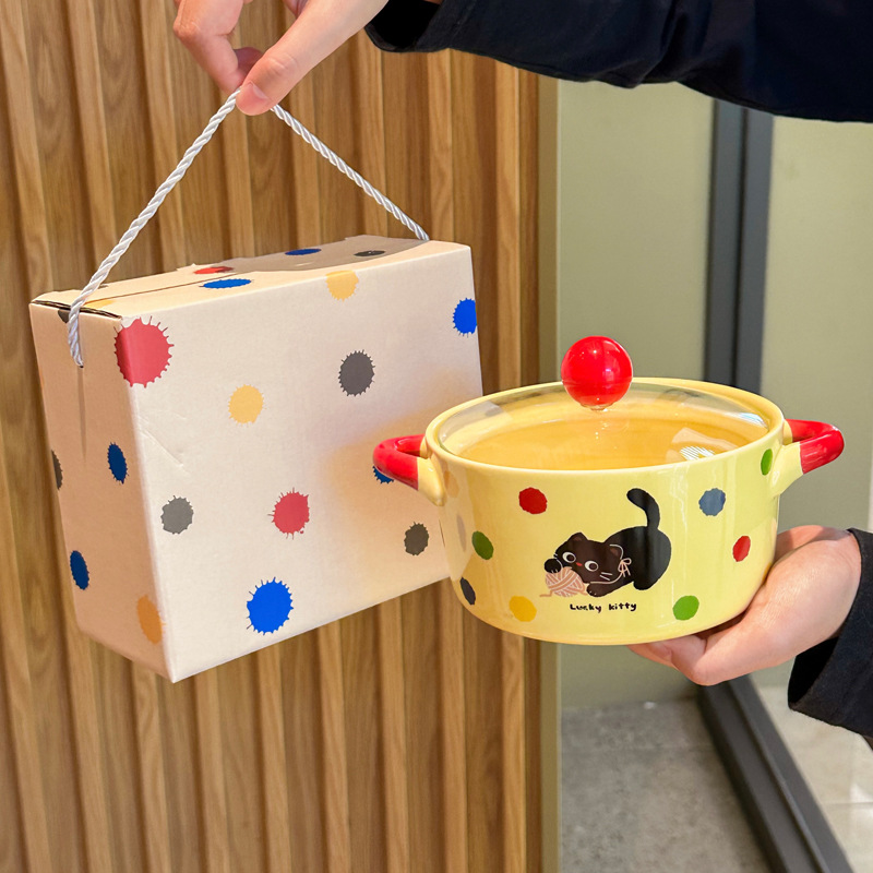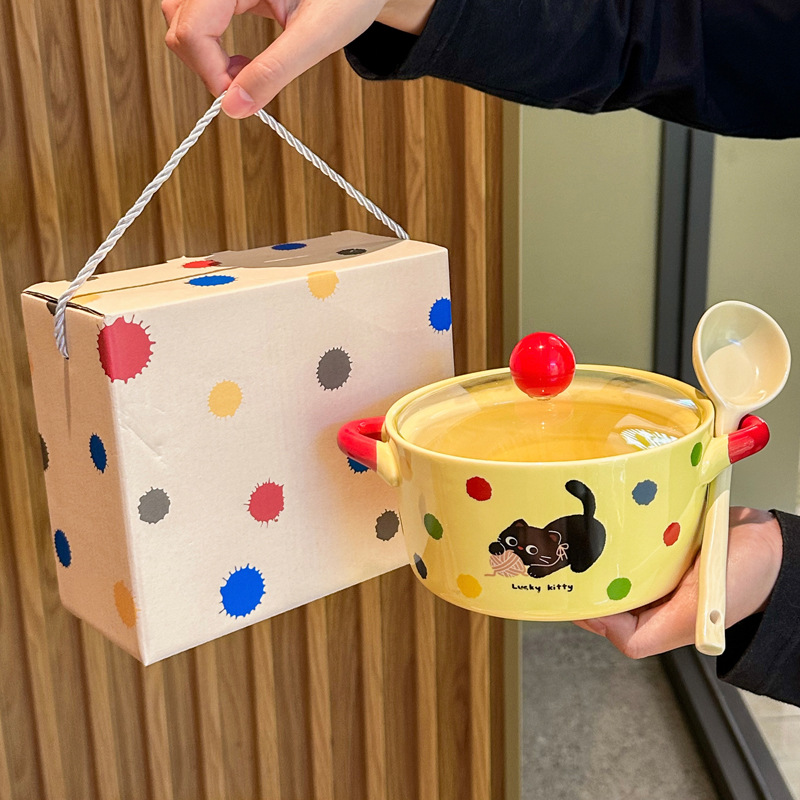 • 폴카 도트 컬러풀 고양이 라면 그릇(뚜껑 포함) + 폴카 도트 휴대용 선물 상자