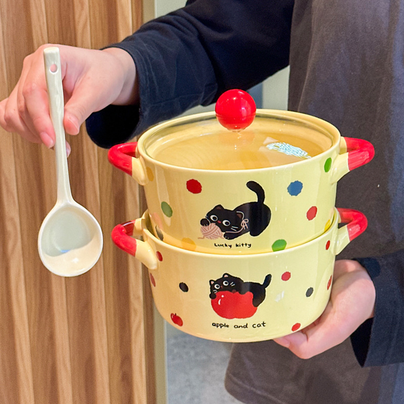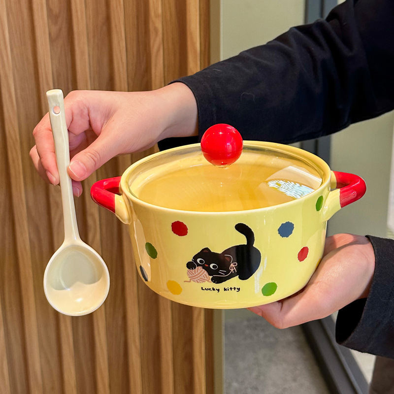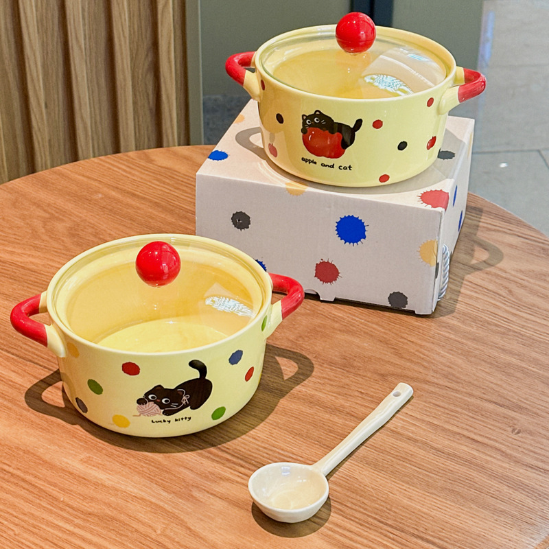 • 폴카 도트 컬러풀 고양이 라면 그릇(뚜껑 포함) + 전용 스푼