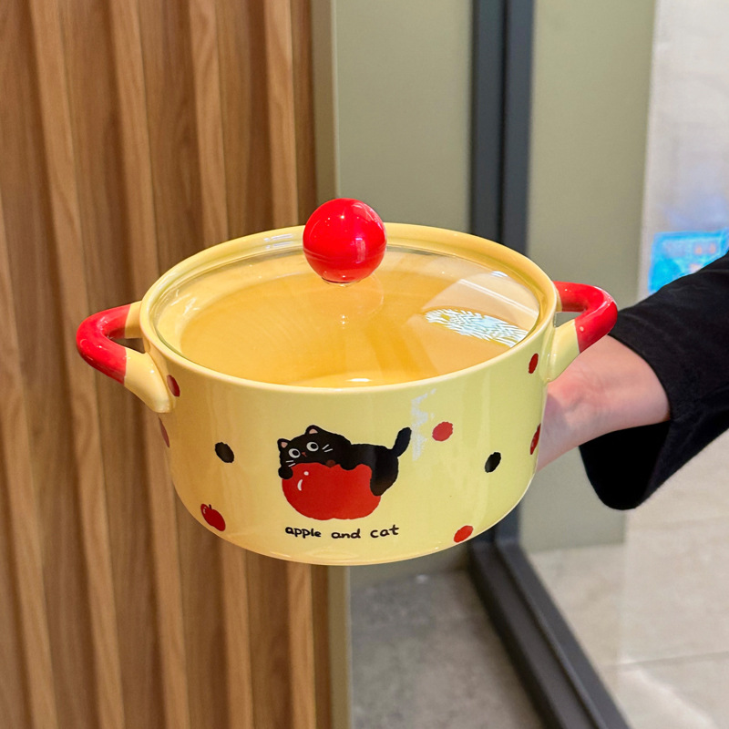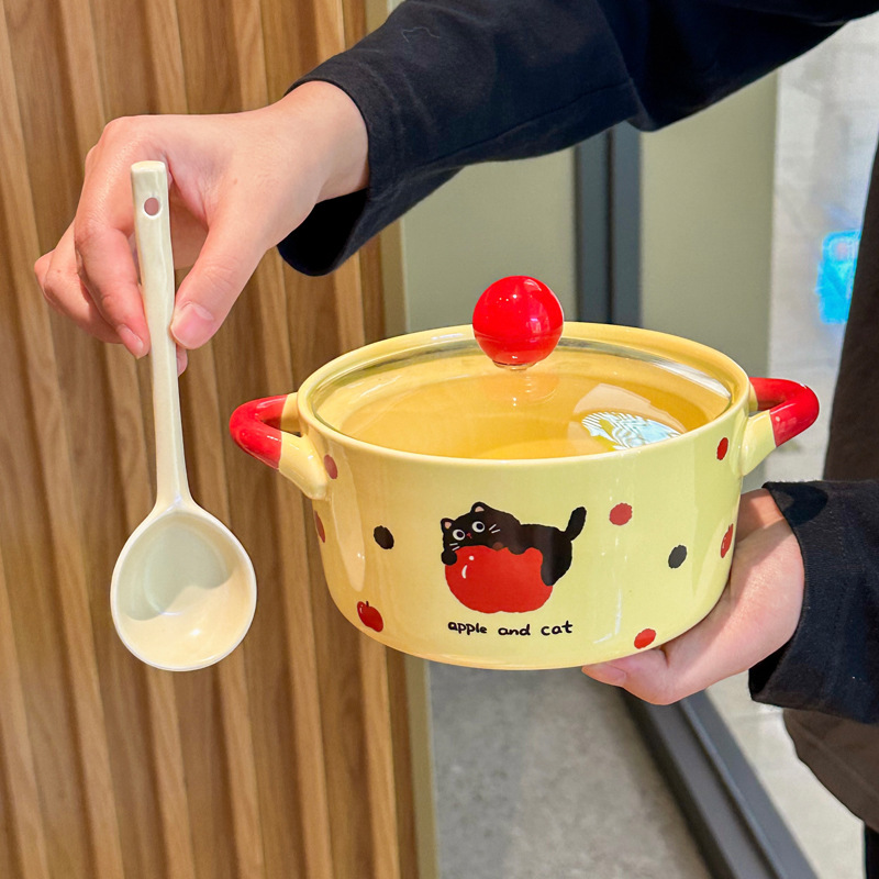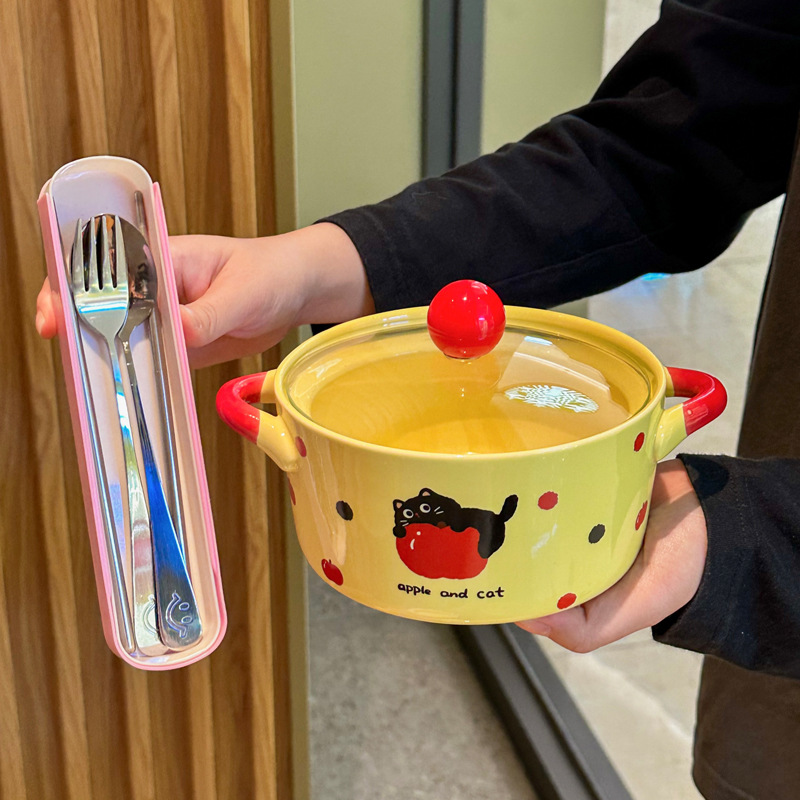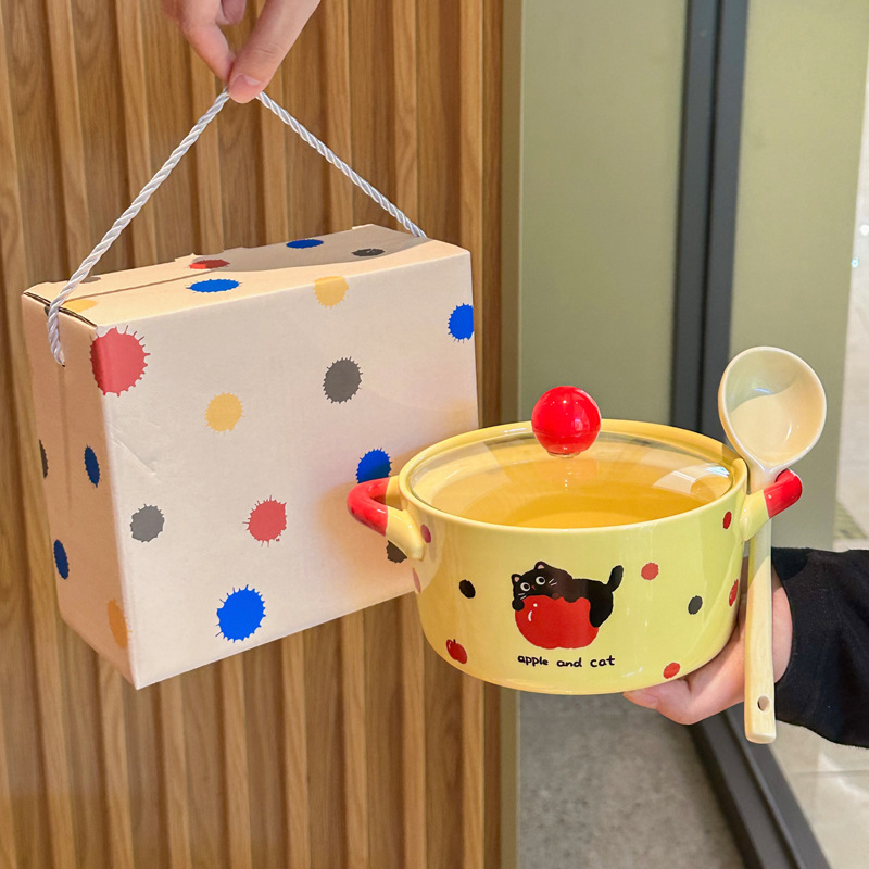생일 선물 귀여운 사과 키티 세라믹 귀 그릇 뚜껑 바이 노럴 가정용 수프 그릇 소녀 동반 선물 상자스토어 가기