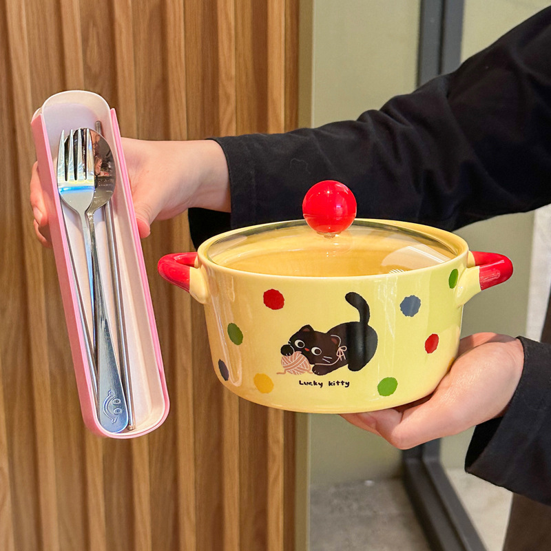 • 폴카 도트 컬러풀 고양이 라면 그릇(뚜껑 포함) + 식기
