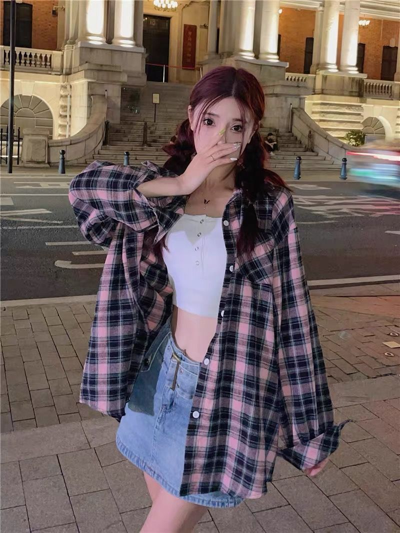 캐주얼 올 매치 파우더 체크 셔츠 재킷 여성의 봄과 여름 디자인 센스 새로운 선 스크린 셔츠 루즈 얇은 긴팔 탑스토어 가기