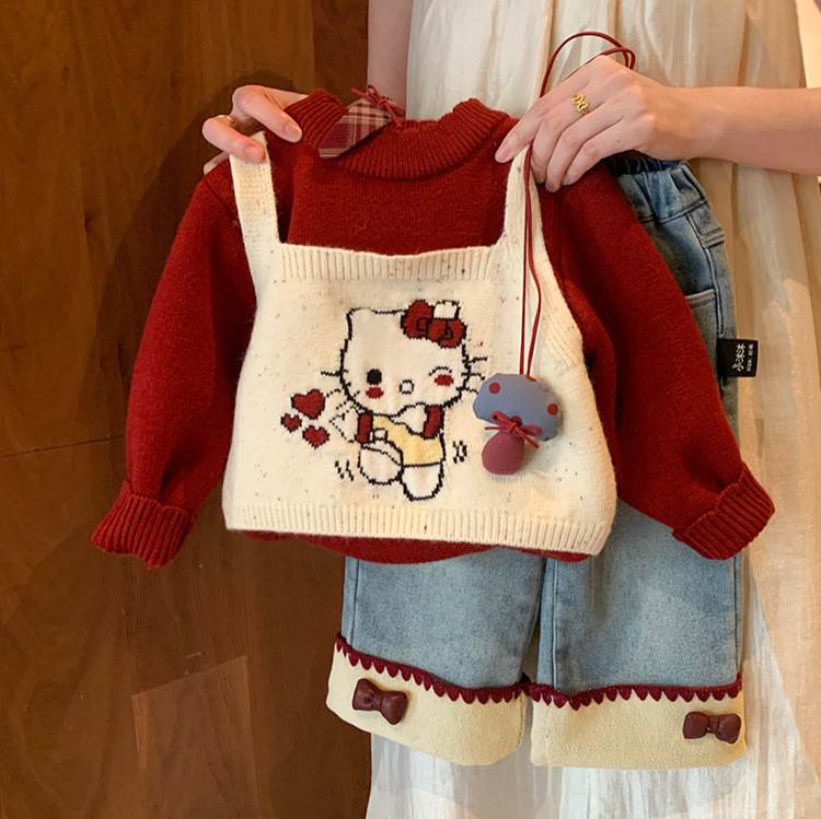 2024 새로운 가을과 겨울 원피스 중소 어린이 보물 두꺼운 니트 스웨터 소녀의 만화 니트 풀오버 스웨터 가짜 두 조각스토어 가기