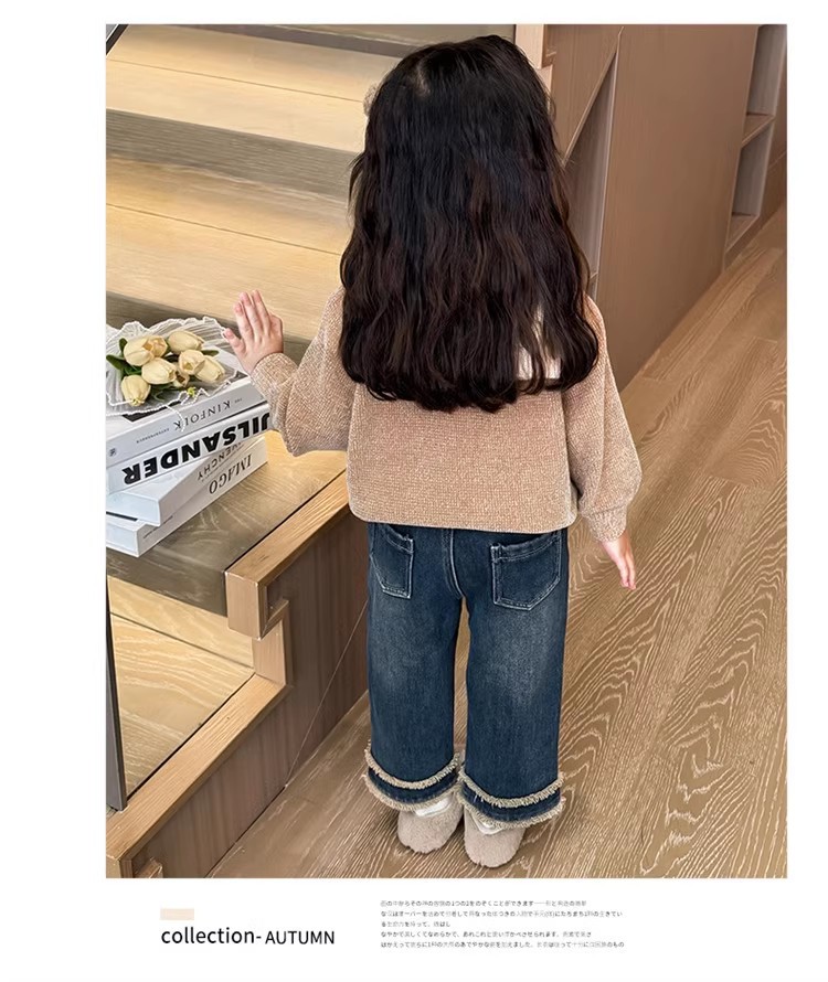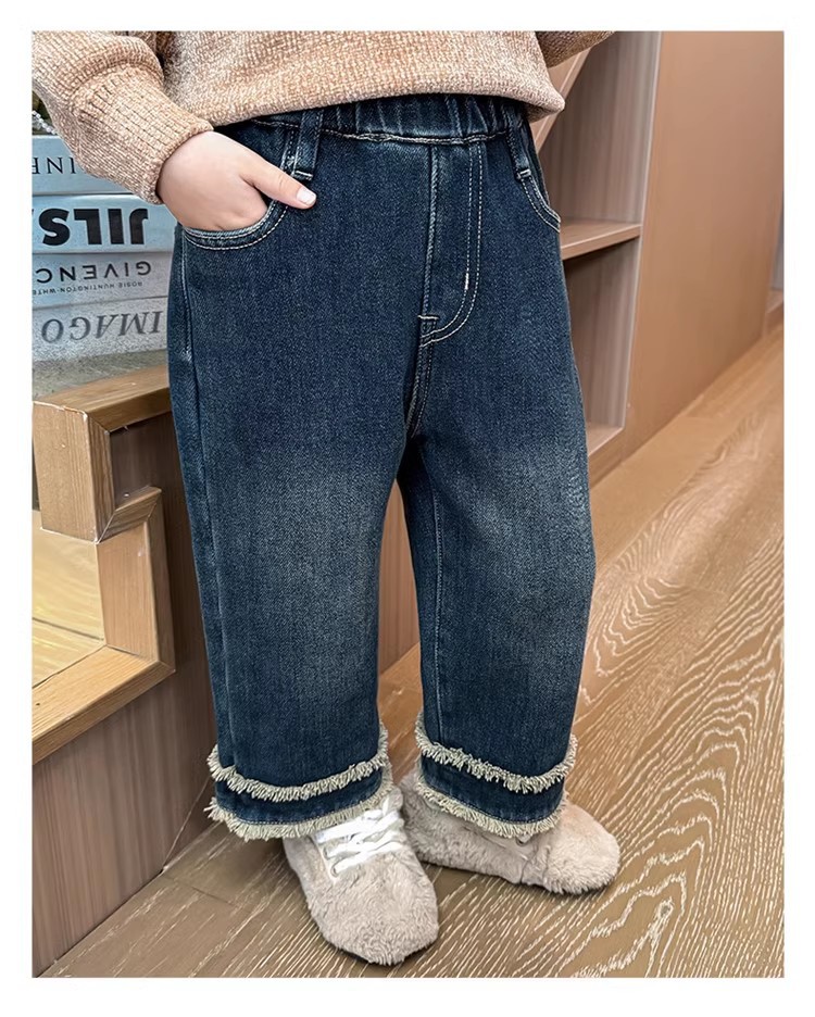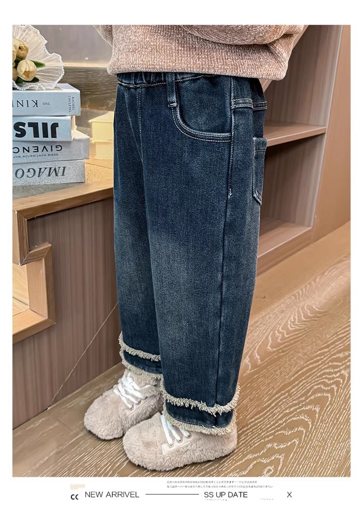 아동복 어린이 바지 소녀 기모 청바지 2024 새로운 세련된 패션 어린이 여성 보물 겨울 스트레이트 다리 바지