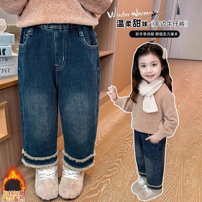 아동복 어린이 바지 소녀 기모 청바지 2024 새로운 세련된 패션 어린이 여성 보물 겨울 스트레이트 다리 바지스토어 가기