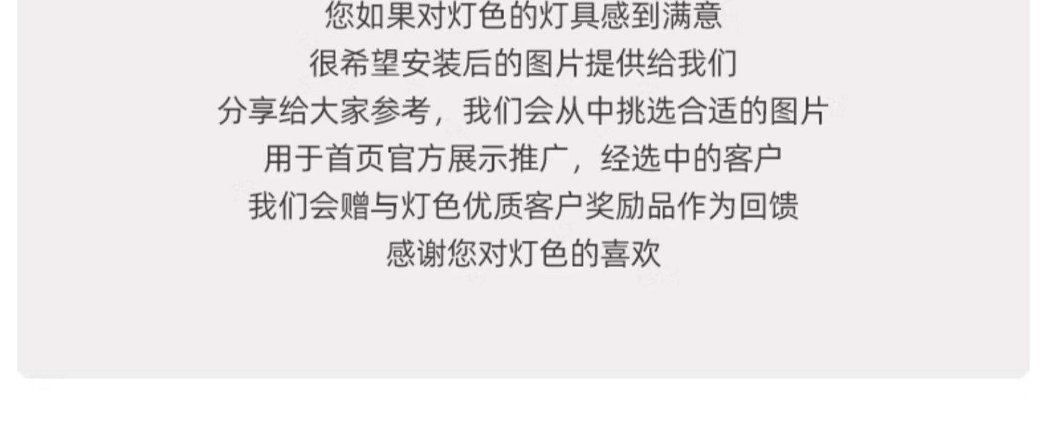 买家须知无忧购物(购买前请仔细阅读) 1.收到货品后安装前需先检查灯具,配件等是否收齐。安装前自己可在地面上先测试灯或风扇是否正常运行 本店没有支持七天无理由退货的商品或已经安装过的灯具如非质量问题,不支持任何理由退货退款,买家若坚持退货退款需扣除20%的折旧费作为货物折旧成本(因大多商品都设有去程包邮和需要更换包装,以及重新检测,才可以重新出厂销售),并自行承担拆卸灯具和退回运费(注:风扇有声音是正常的,灯不亮补发光源客户自己更换,这不属于质量问题)。 2.买家付款后,无特殊情况订单一般在48小时内发货,如遇特殊情况到货时间请实时关注物流信息,以快递到达时间为准。另外请留意,每个灯具一般采用独立包装,多件商品的订单,快递分拣装车时包裹分开,商品出现有先到和后到现象,正常间隔1-2天会收齐货,敬请耐心等候,如没到齐需要具体的快递信息可以联系在线客服帮您查询。 3.灯具均为易碎品,我们采用泡沫+硬纸箱包装,一般不会破损;签收后,如有破损,也可在签收后联系在线售后客服安排补寄,另外灯具运输破损不视为质量问题,一单多件产品,如存在部分产品在运输过程中破损 买家以此为由要求全部产品退换货,我们将只承担破损件退回运费,其余产 品拒签或退换货由买家自行承担退回运费。 4.本店所有产品自购买日起,以交易记录为准,质保1至3年,视不同产品而定(具体可咨询客服)。第1年,商家承担配件费用,并承担补寄运费;第2-3年、商家承担配件费用,但需由买家承担运费:(人为损坏或者安装不当、不可抗力因素如火灾雷击等、赠送的灯泡和赠品均不在保修范围内)(不亮并非灯具质量问题,通常是配件出现了故障,比如光源或者驱动补寄更换上即可解决) --感谢您的细心阅读!下单即代表同意以上约定,祝您购物愉快一