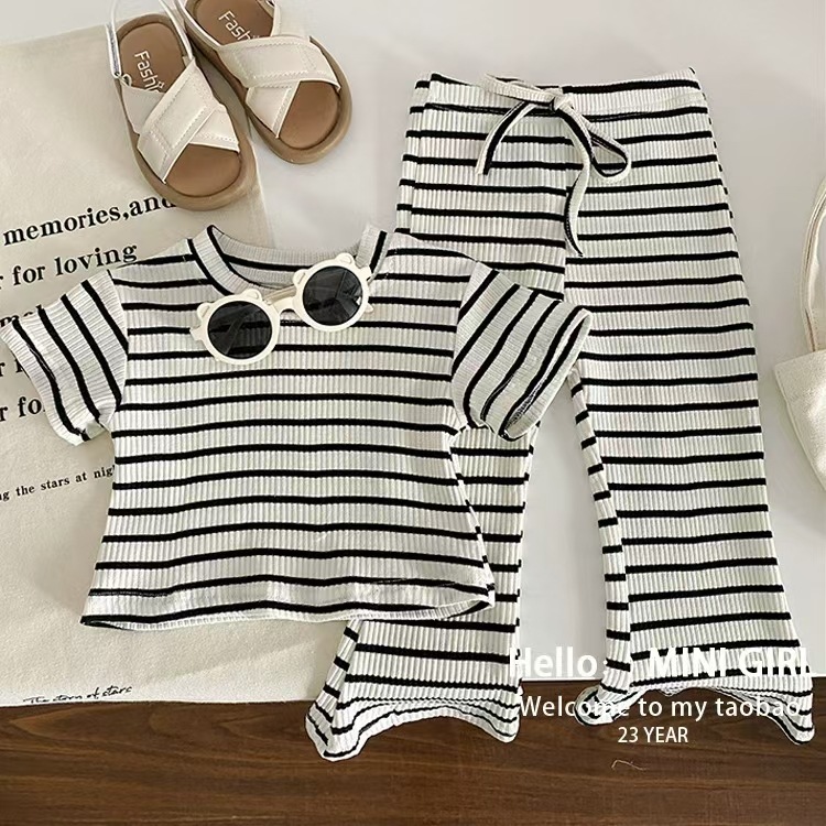 여름 소녀 세트 아기 세련된 어린이 성격 유행 한국 줄무늬 슬림 핏 아이스 실크 반팔 티셔츠 플래