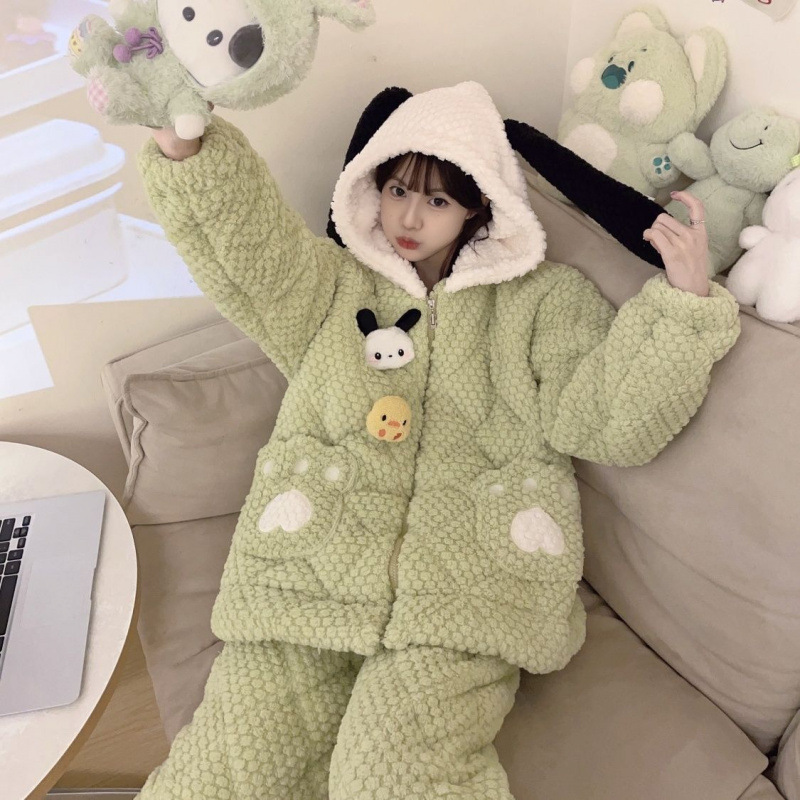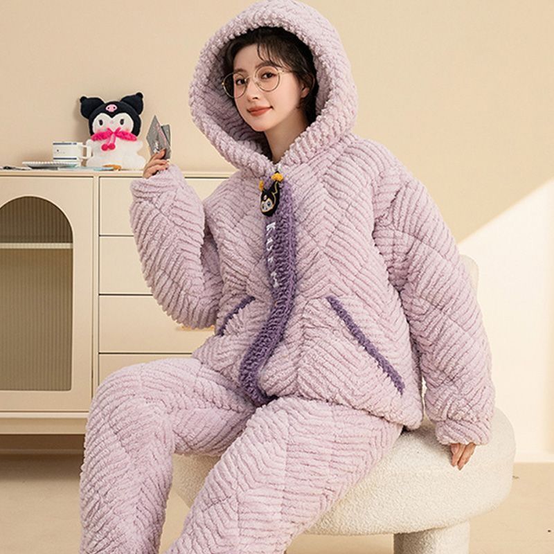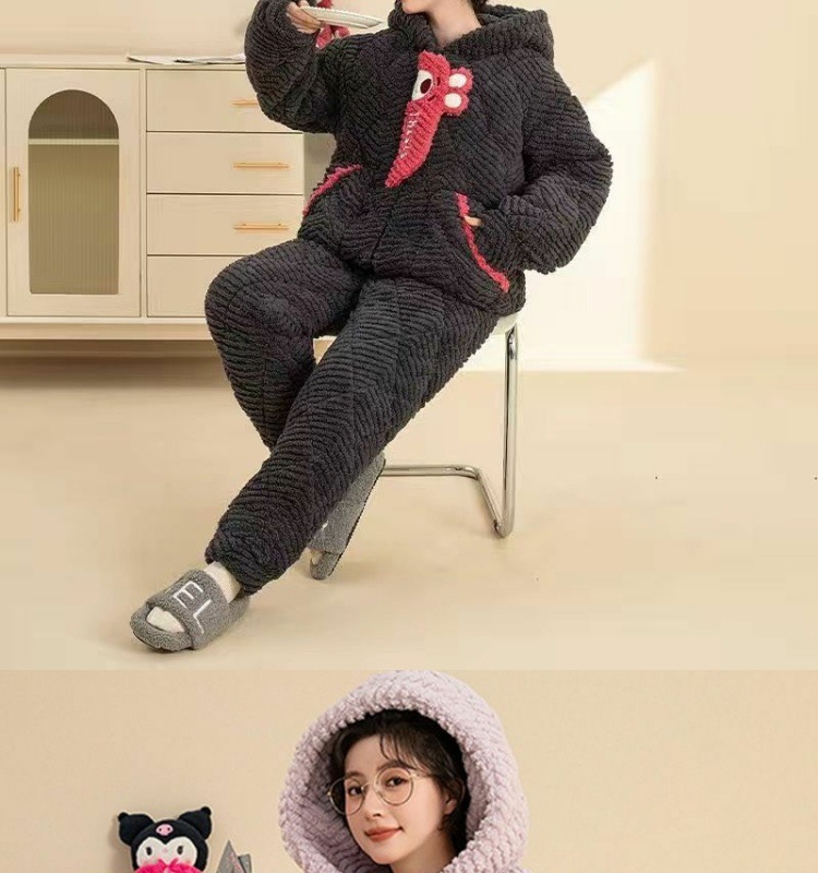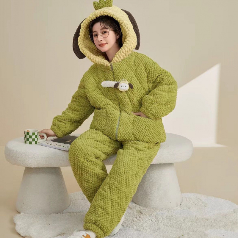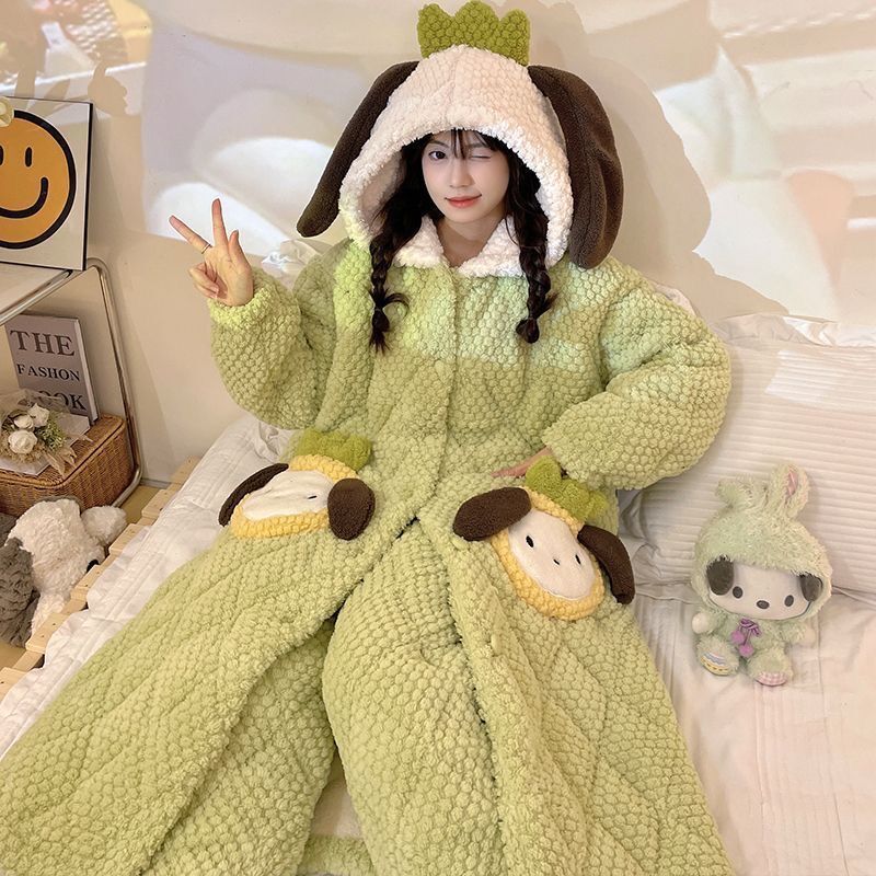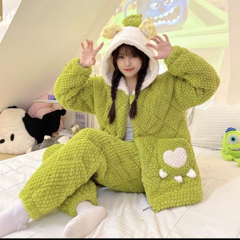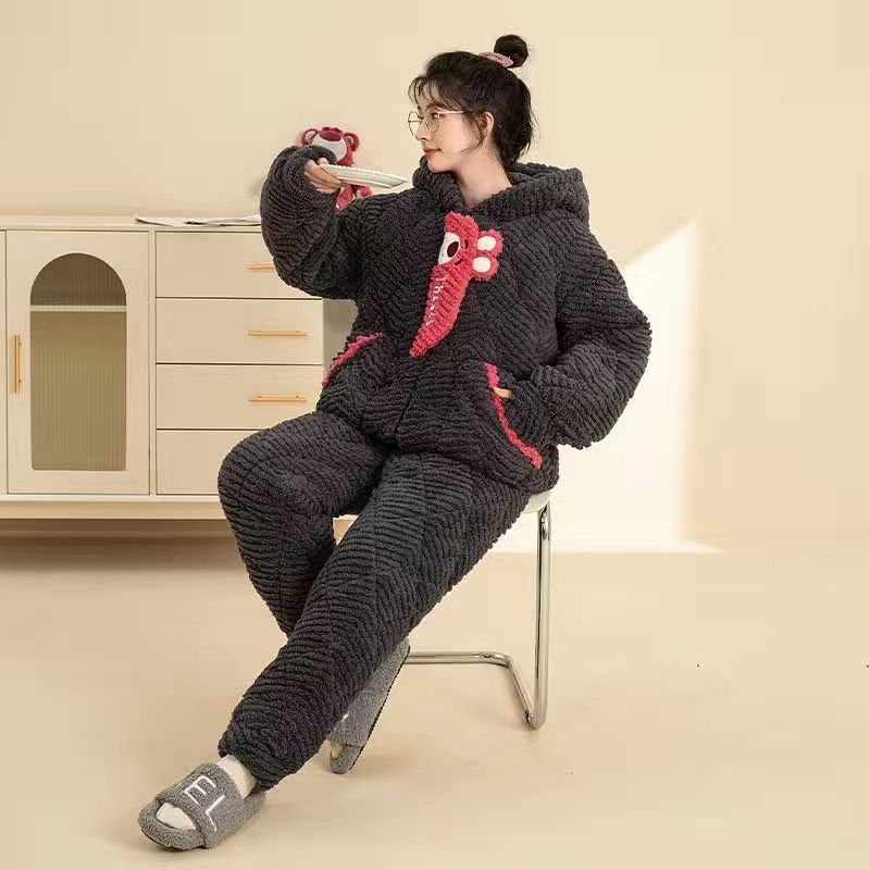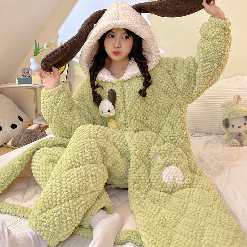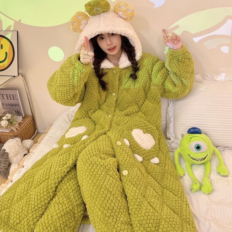 만화 3 층 퀼트 겨울 잠옷 여성의 따뜻한 세트 두꺼운 귀여운 홈 옷 산호 양털 로브 인 스타일