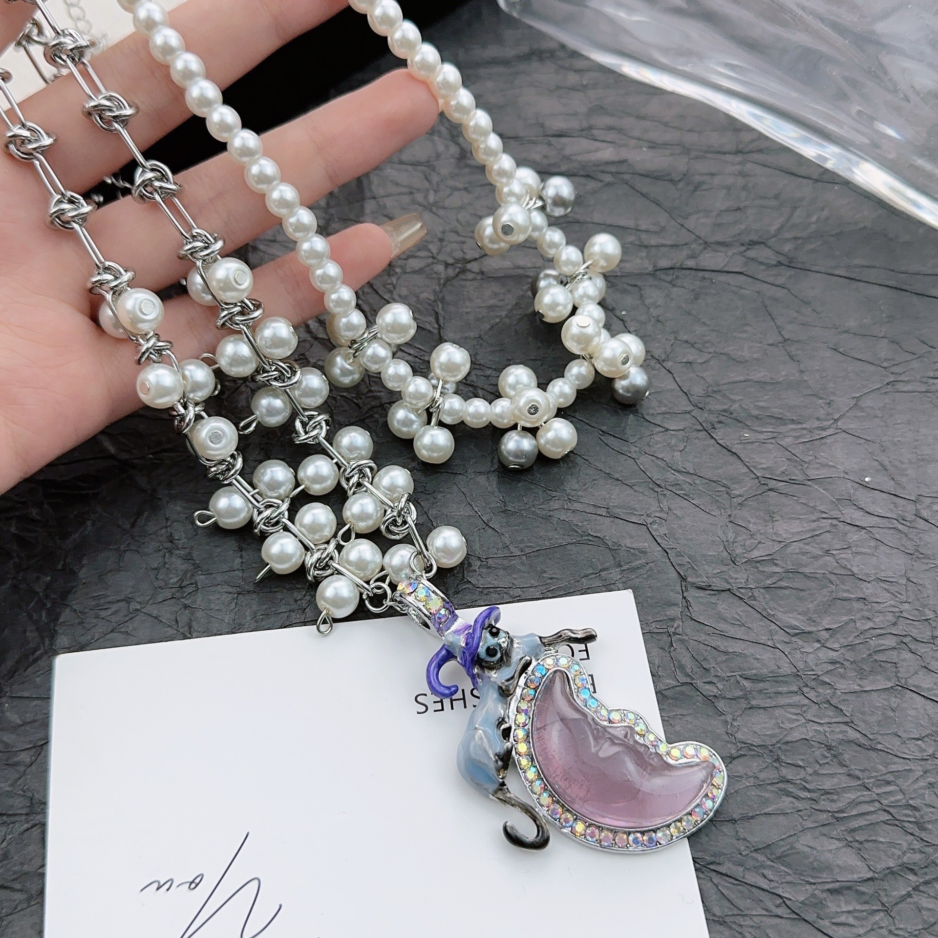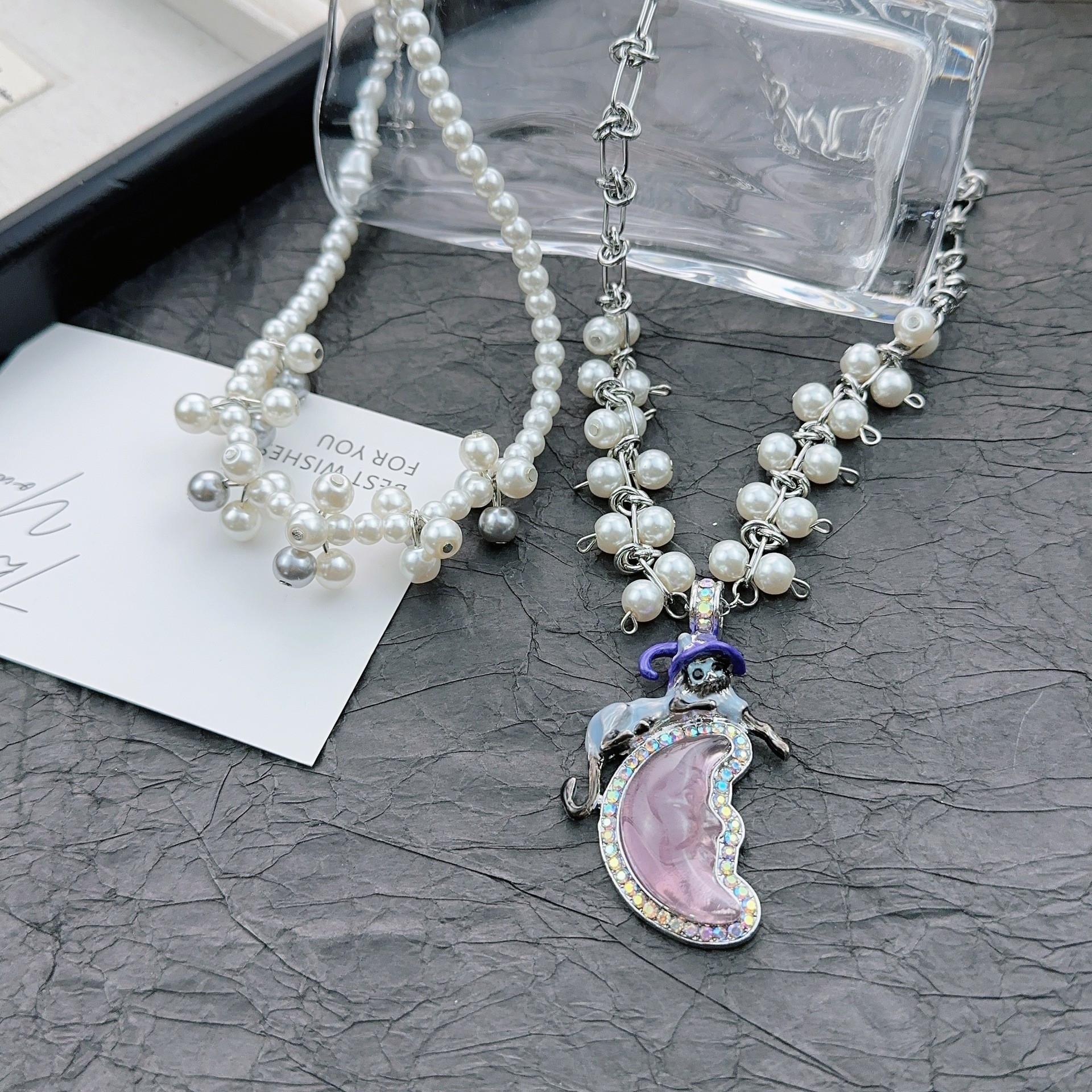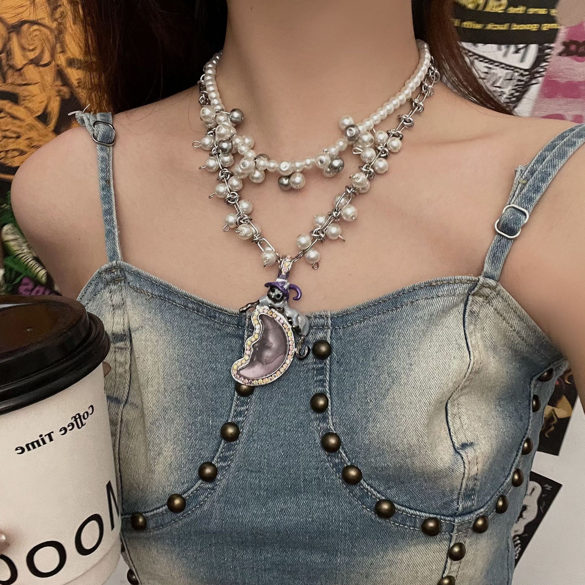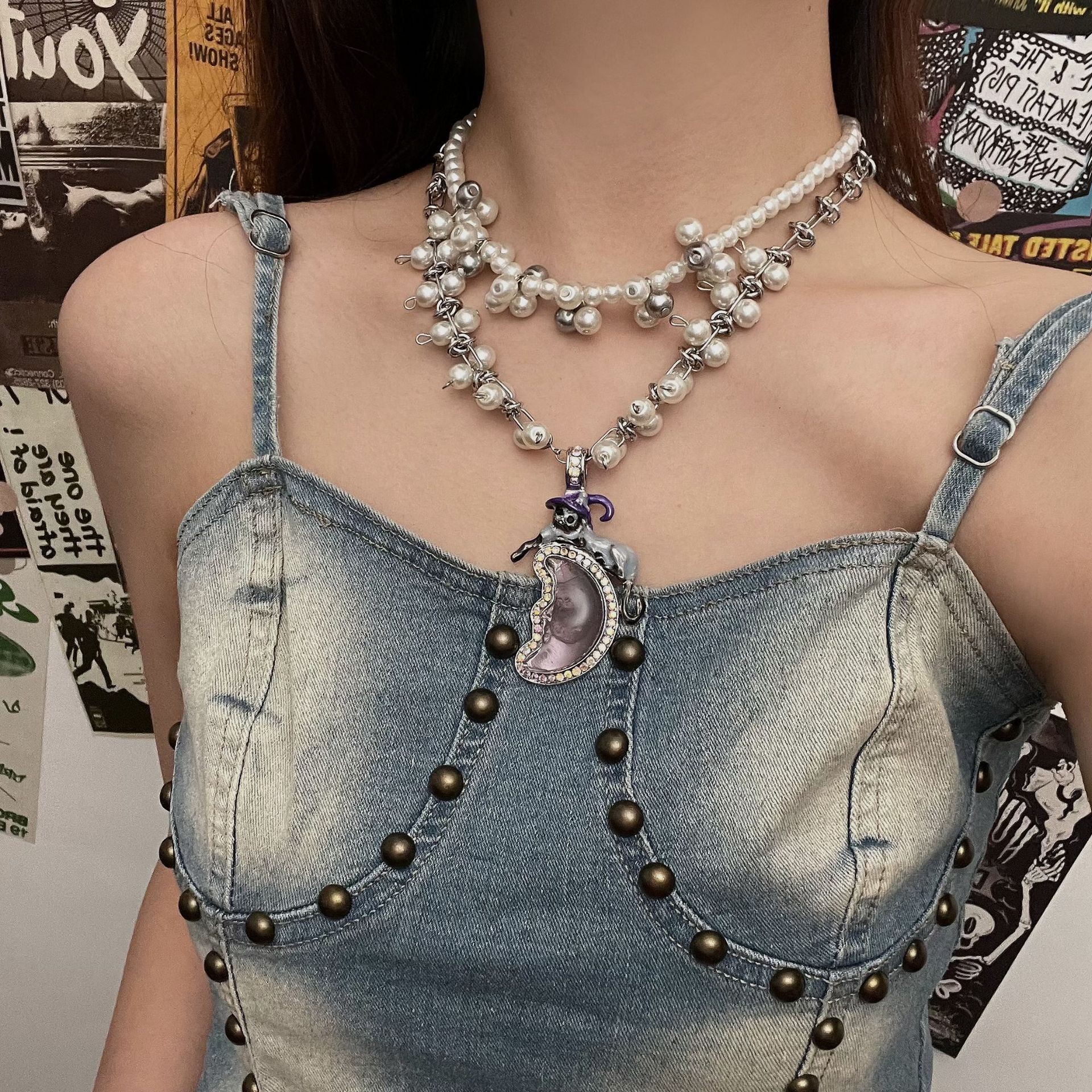 중공업 문 라인스톤 펜던트 비즈 더블 레이어 진주 목걸이 달콤한 쿨 스파이스 소녀 성격 패션 콜라본 체인 액세서리 트렌디