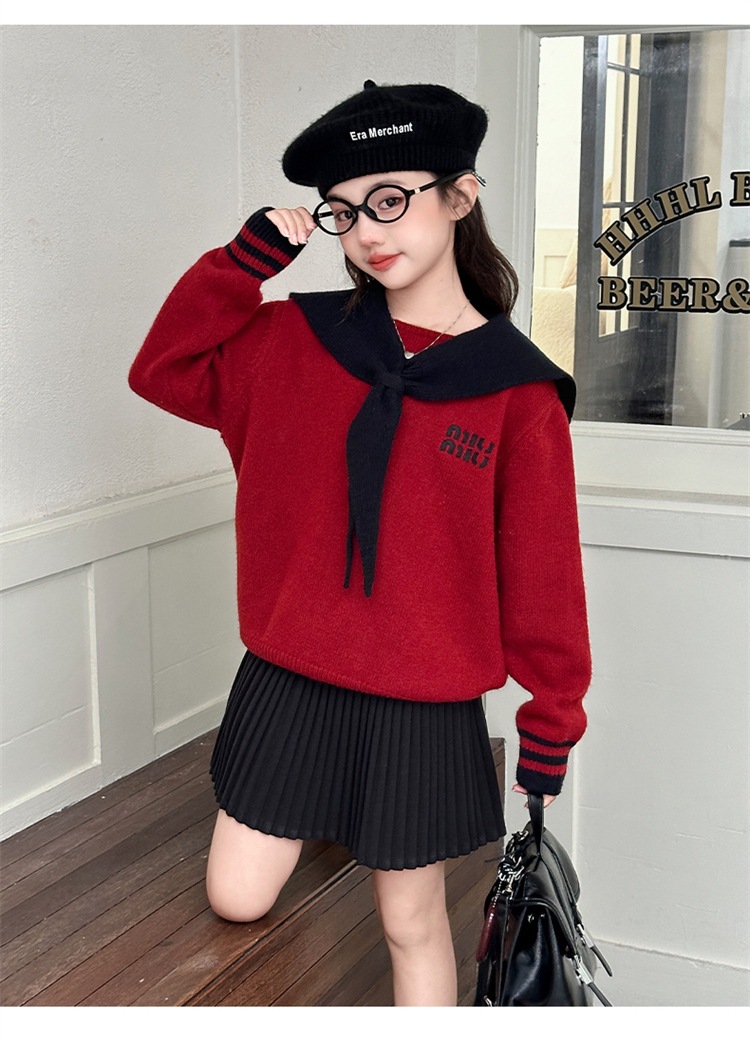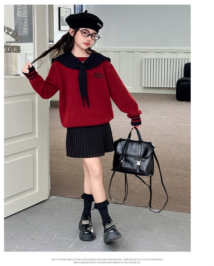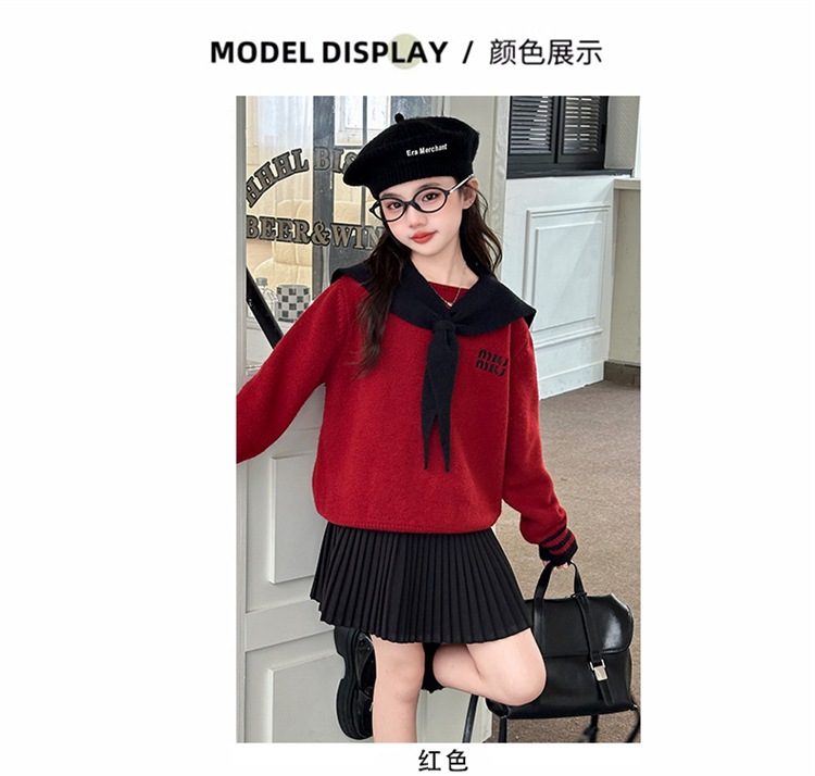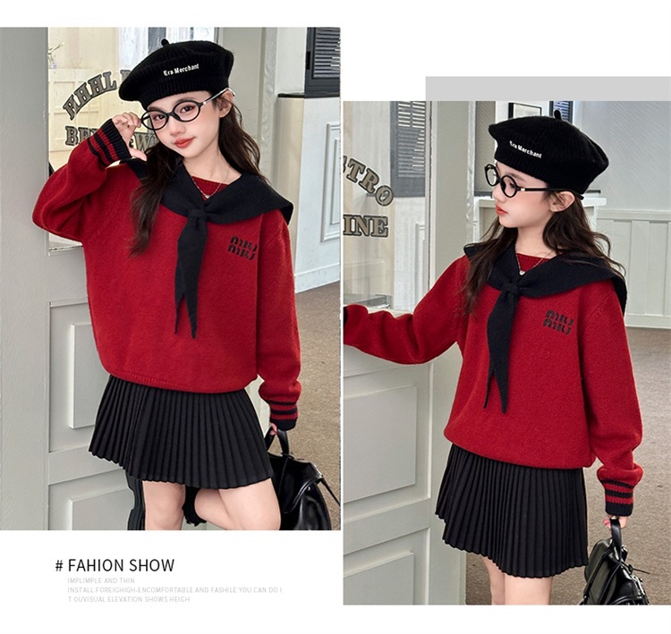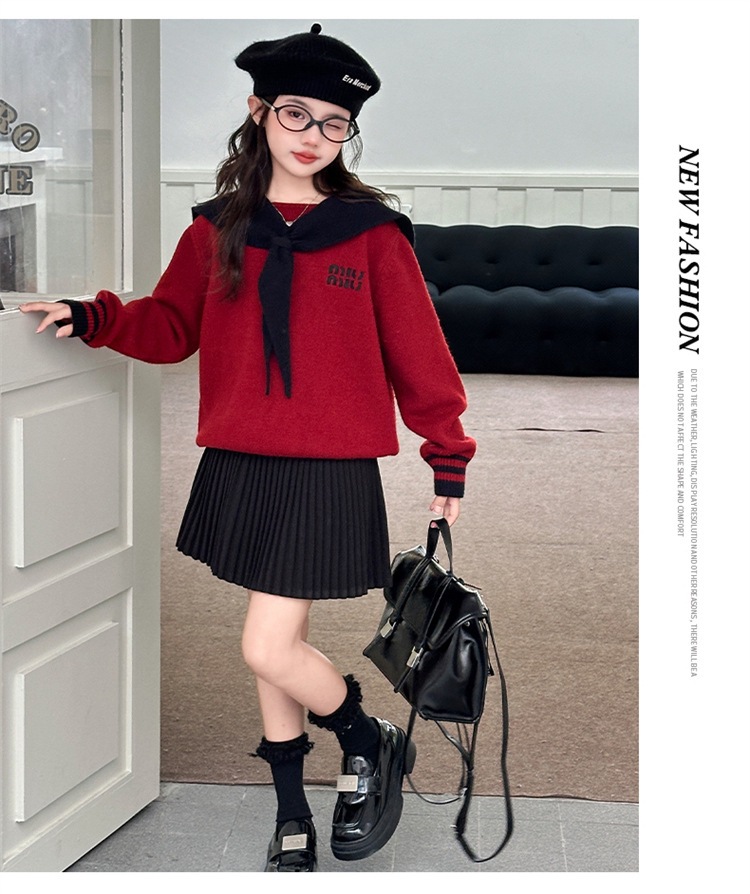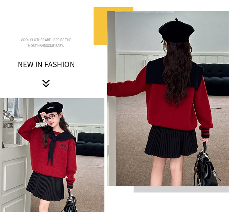 여자 해군 칼라 스웨터 세트 겨울 2024 새로운 여자 대학 스타일 JK 주름 치마 투피스 세트스토어 가기