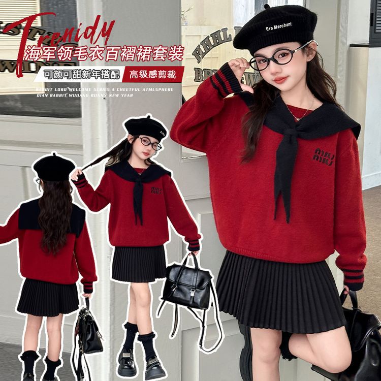 여자 해군 칼라 스웨터 세트 겨울 2024 새로운 여자 대학 스타일 JK 주름 치마 투피스 세트