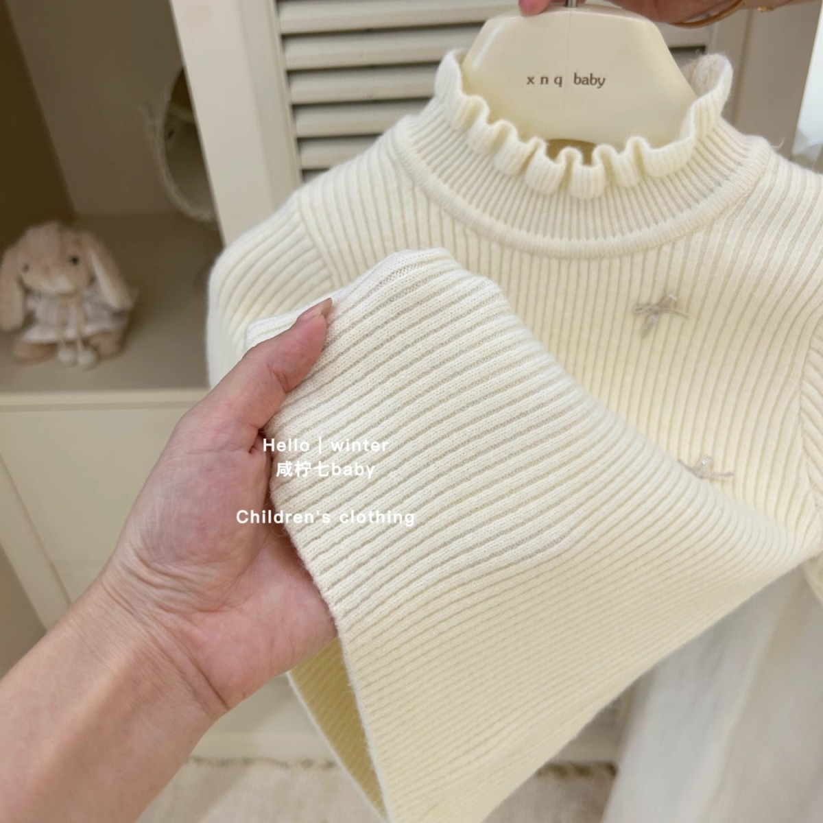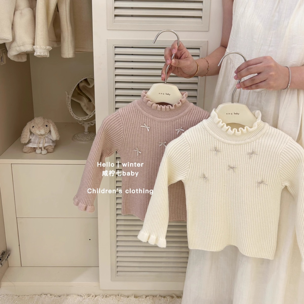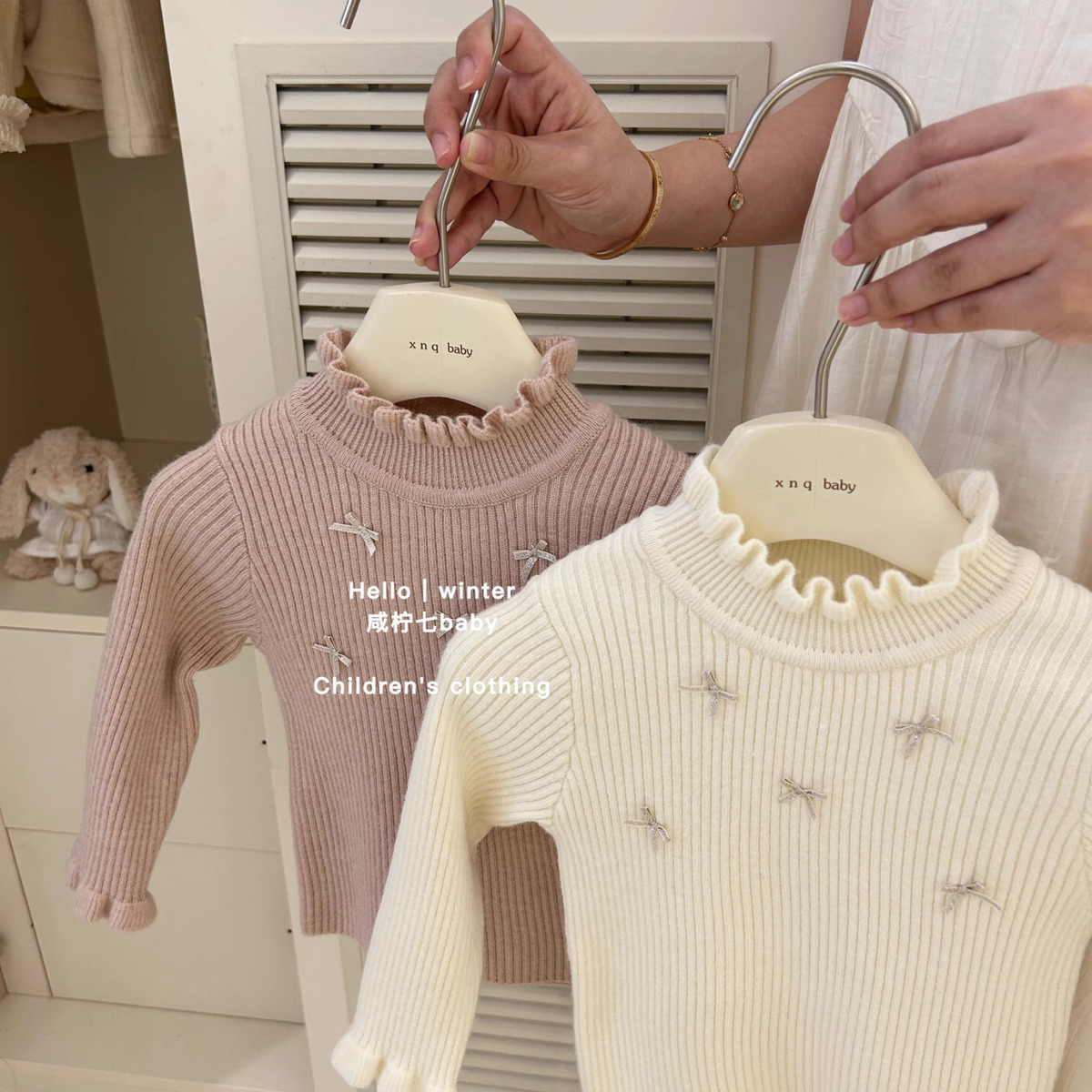가을과 겨울은 어린이 아기 솔리드 컬러 스웨터 웨스턴 스타일 긴 소매 Auricularius 칼라 풀오버 소녀 활 니트 베이스 셔츠