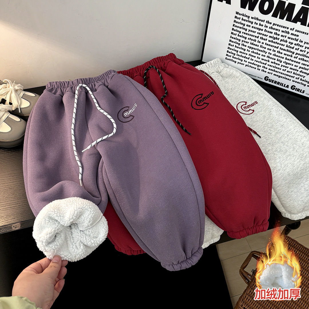 겨울철 남아 및 여아용 아동용 플리스 팬츠, 따뜻하고 두꺼운 스웨트팬츠, 중대형 아동용 클래식 자수, 남녀공용 패셔너블한 바지스토어 가기