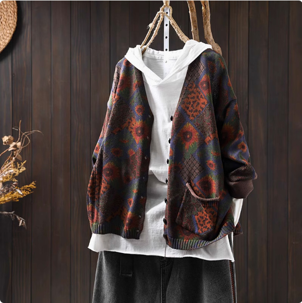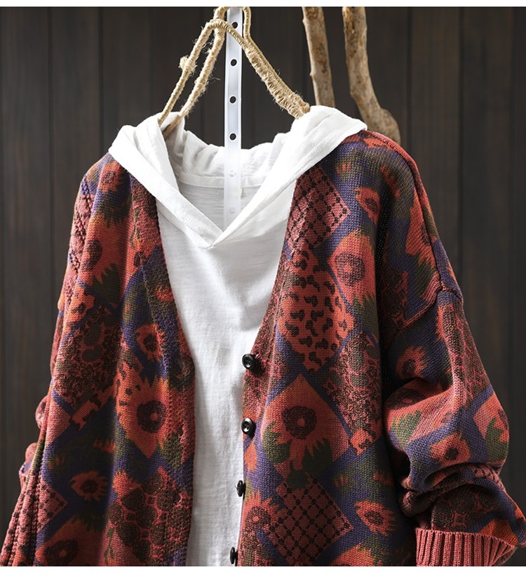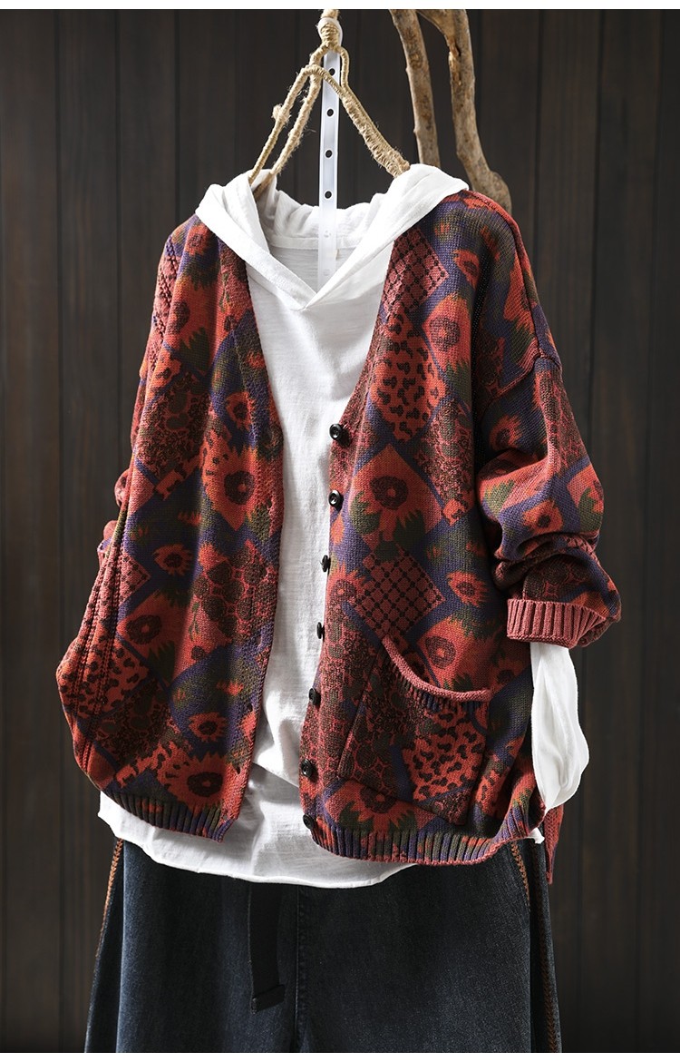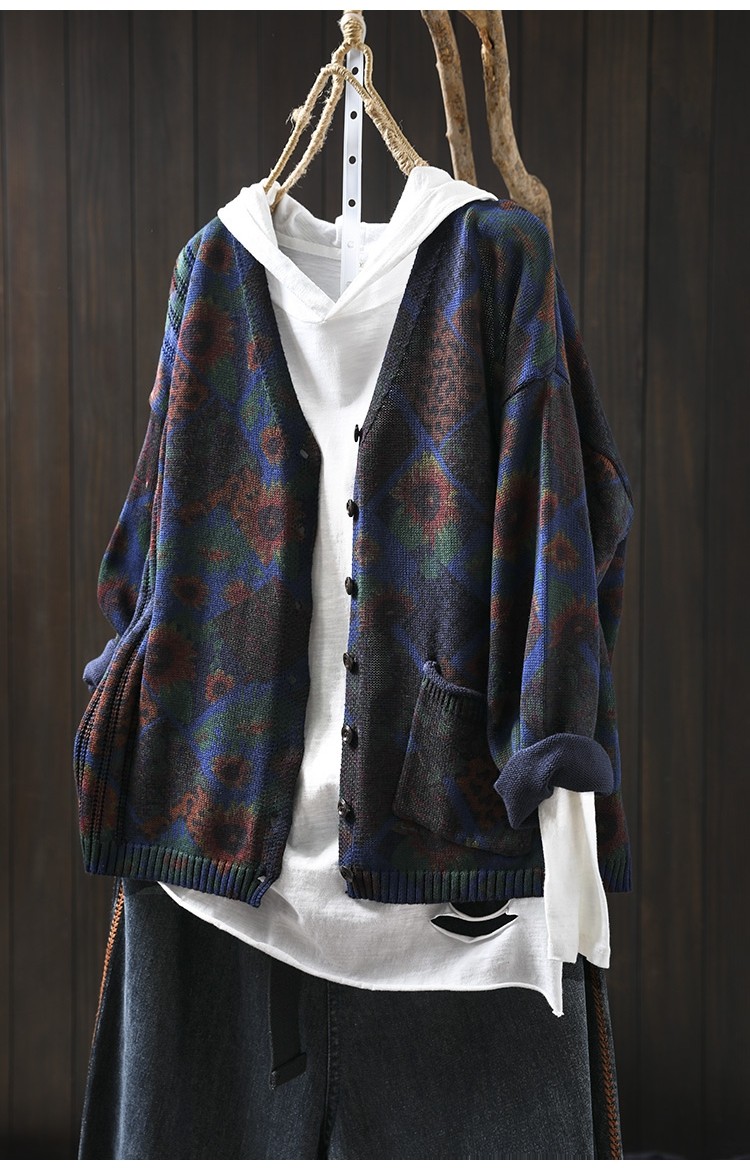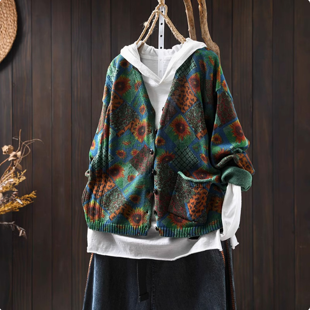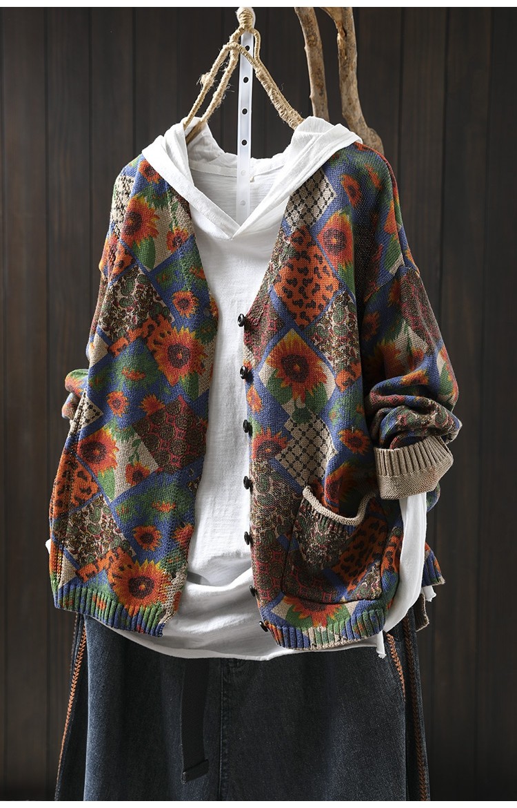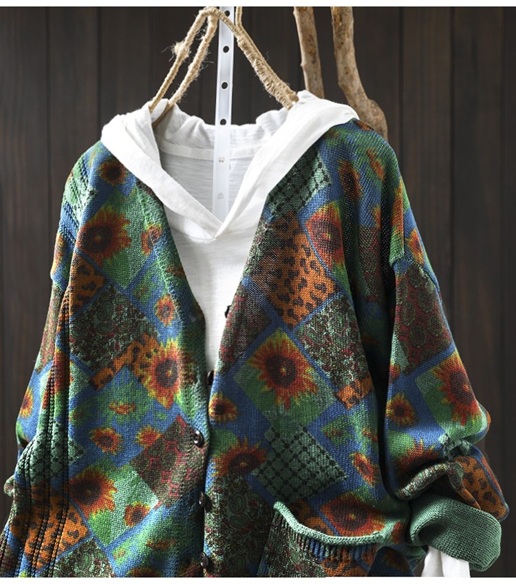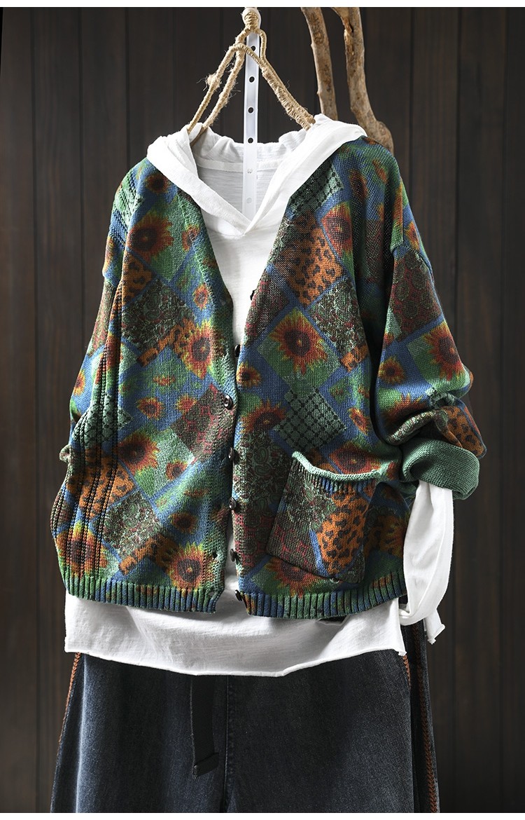 해바라기 인쇄 면 니트 카디건 여성 느슨한 고기 커버 2025 봄 새로운 복고풍 캐주얼 외부 재킷