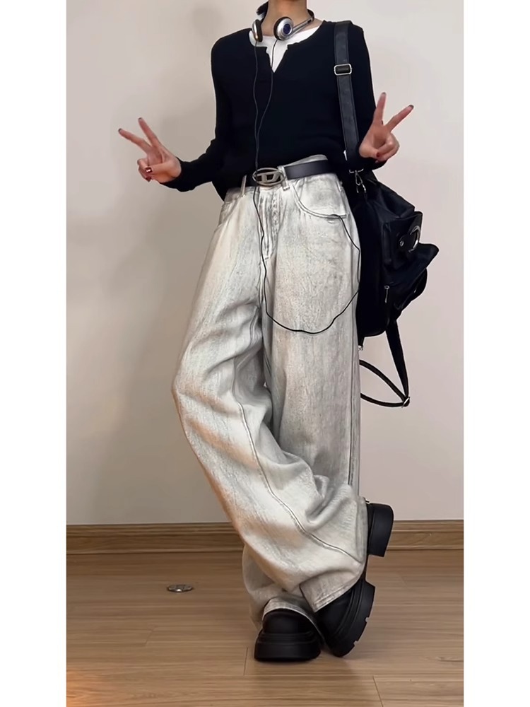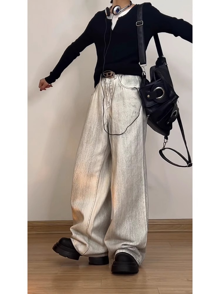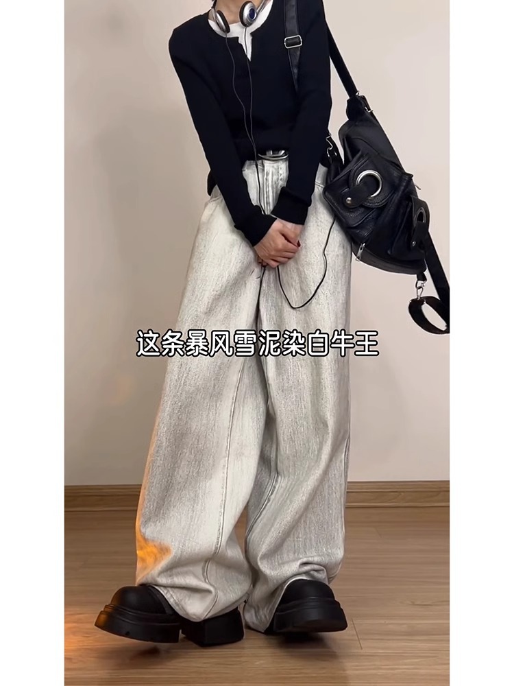 올드 더티 화이트 스플래시 잉크 청바지 남성용 아메리칸 스타일 하이 스트리트 폐기물 지구 스타일 루즈 스트레이트 캐주얼 더티 바지스토어 가기