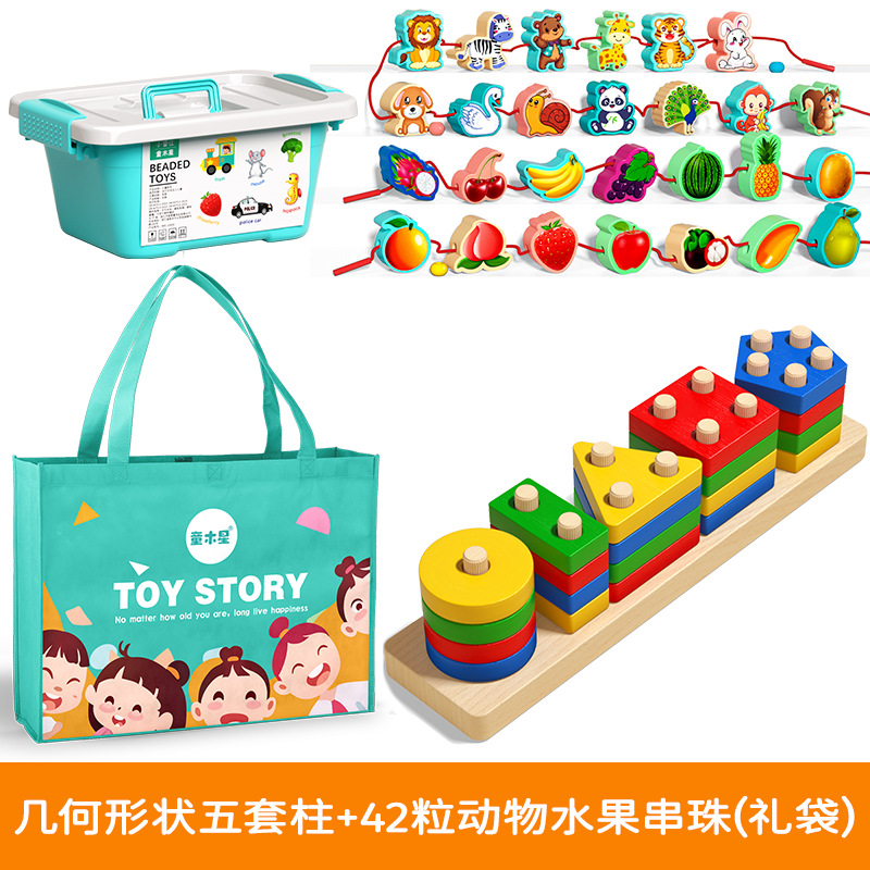 • [선물가방] 기둥 5세트의 기하학적 모양 + 구슬 42개 [동물 + 과일 + 둥근 구슬] 보관함