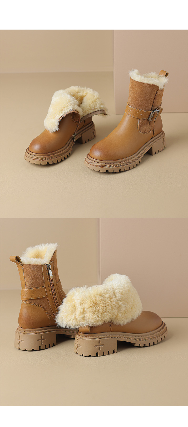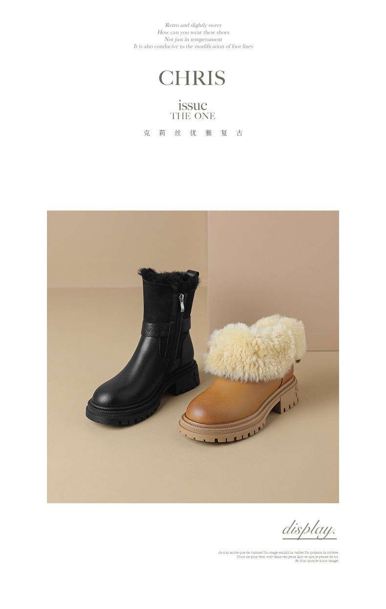 청두 수제 부츠 ~ 4cm 중간 힐 두꺼운 바닥 스노우 부츠 여성용 2024 겨울 벨트 버클 두꺼운 힐 짧은 부츠