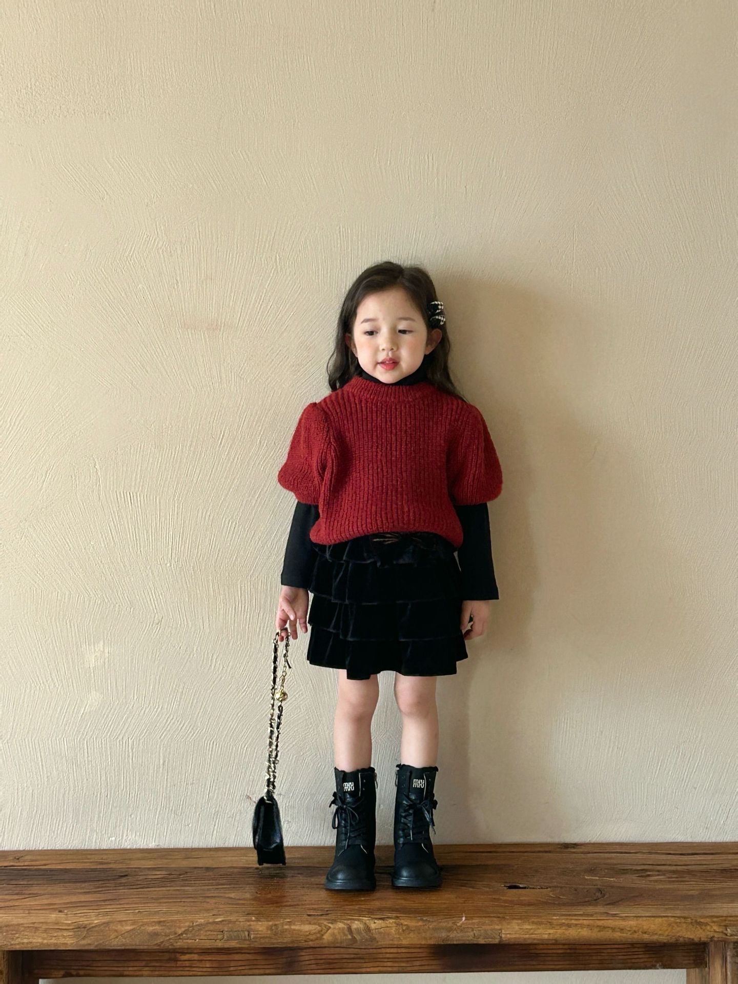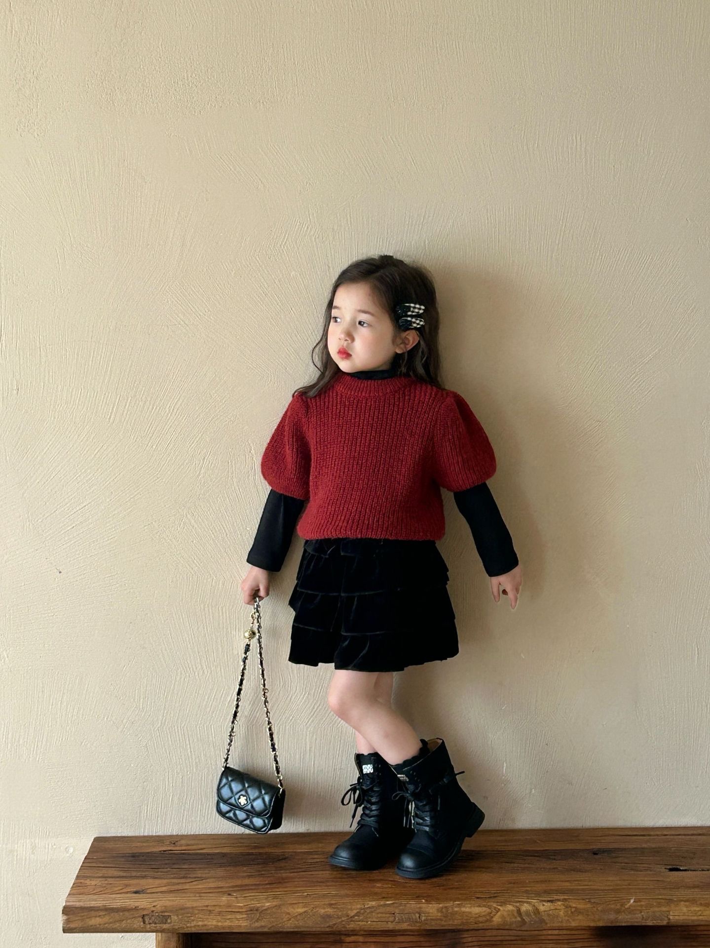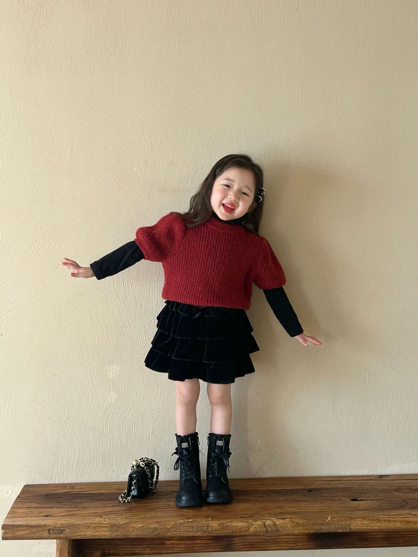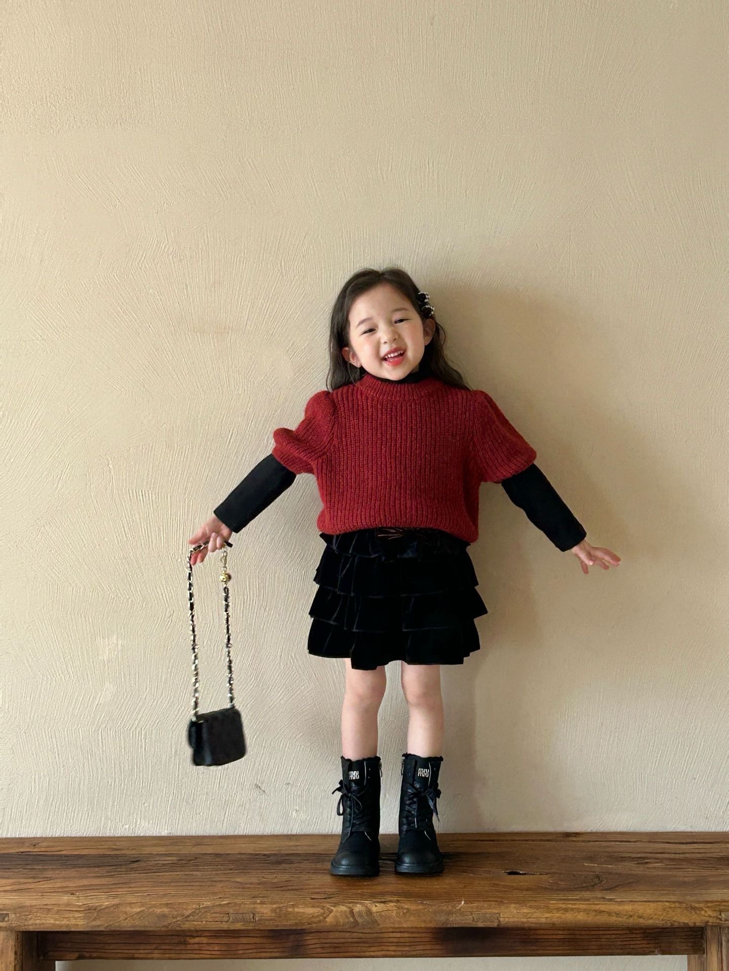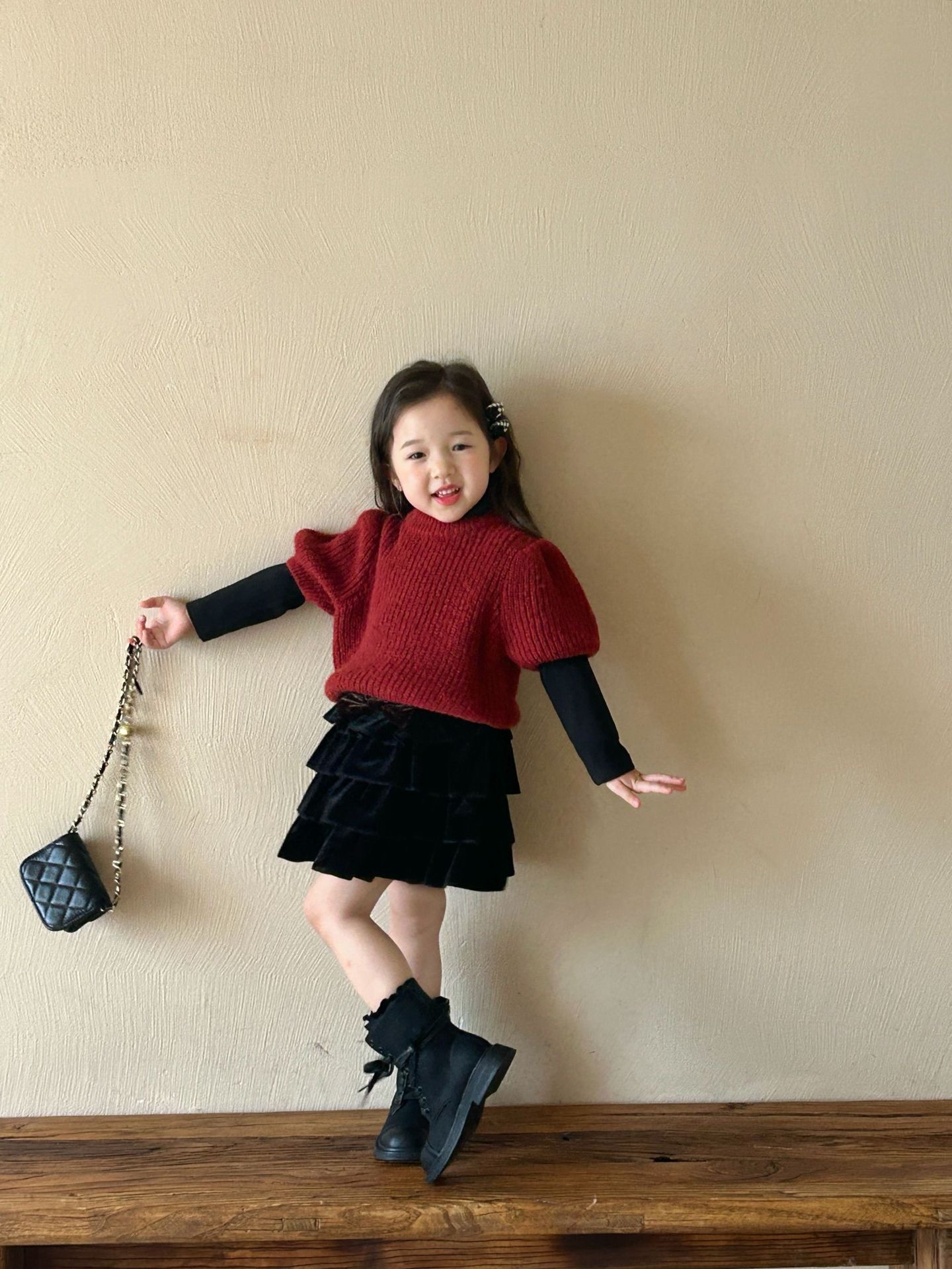 2024 년 겨울 새 아동복 한국식 아동복 소녀 신년 빨간 반팔 스웨터 서양식 퍼프 슬리브 스웨터