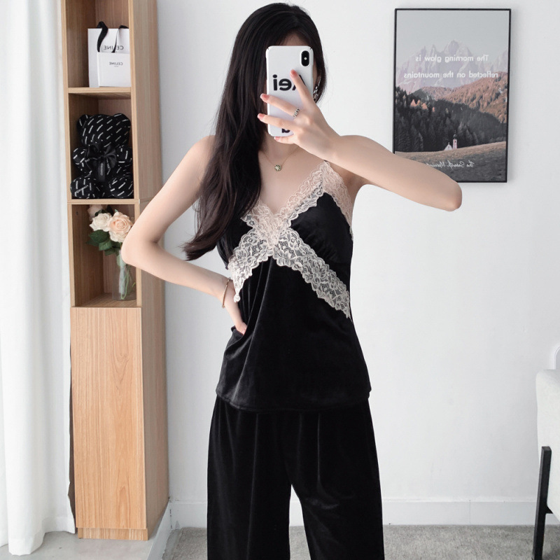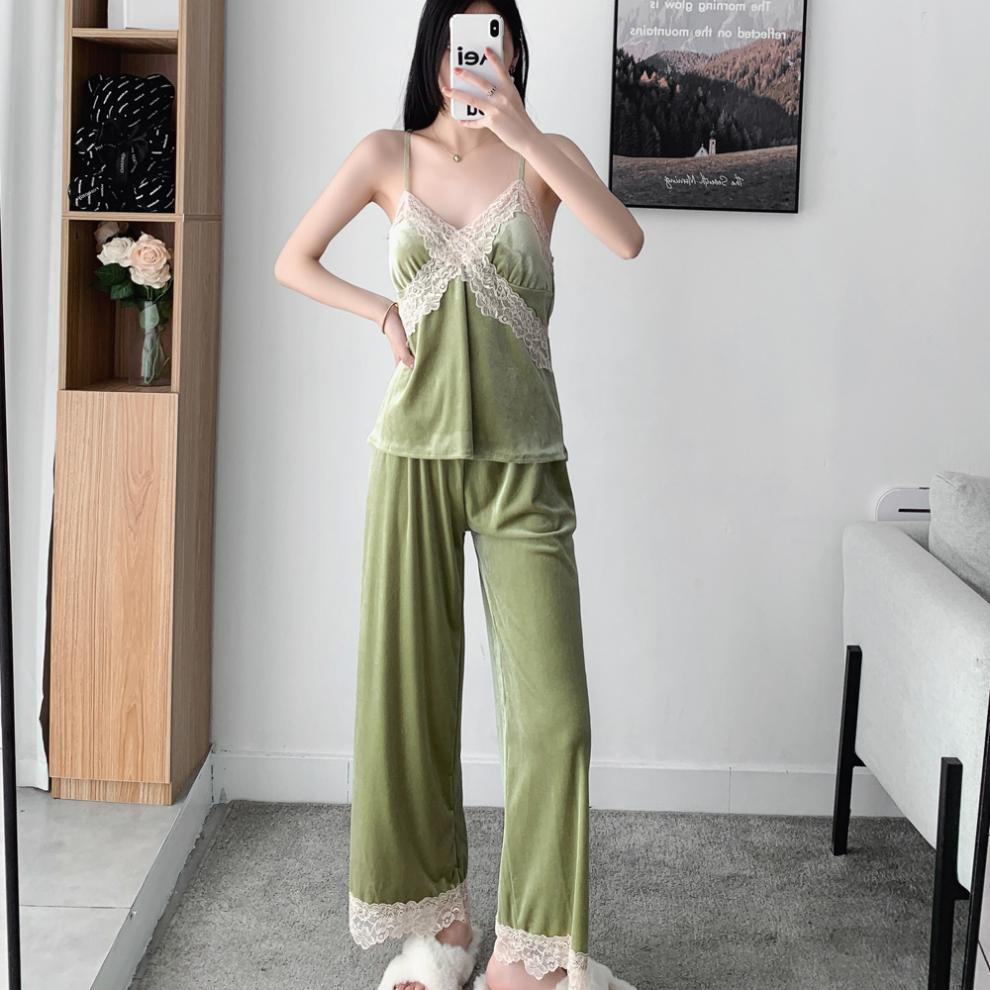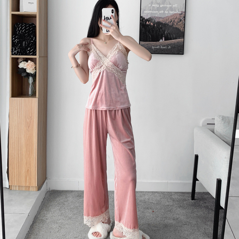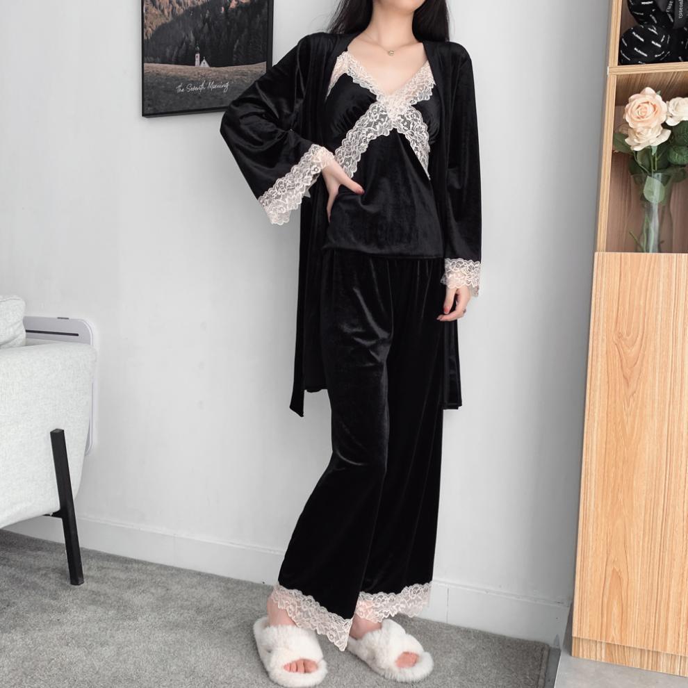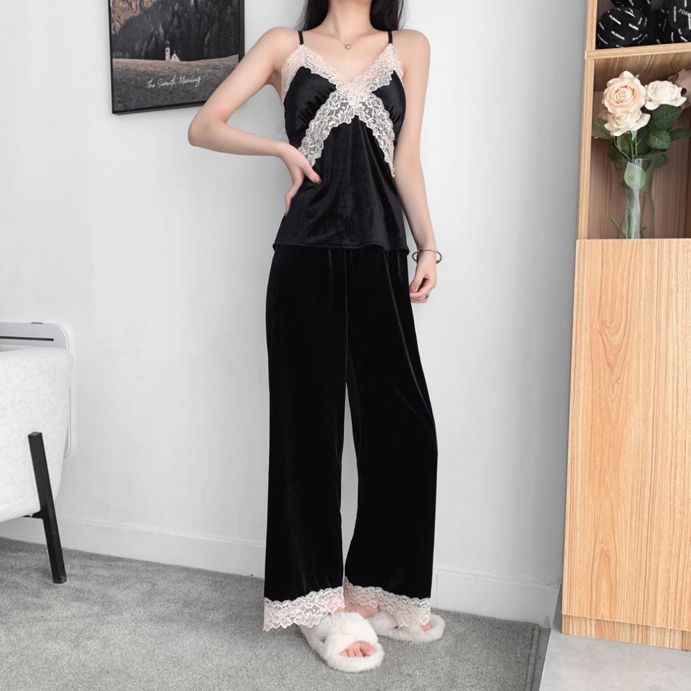 가을과 겨울 잠옷 여성의 섹시한 레이스 황금 벨벳 따뜻한 집 옷 침낭 느슨한 기숙사 복장스토어 가기