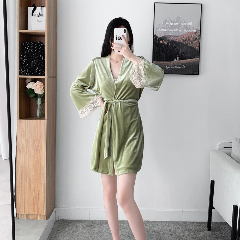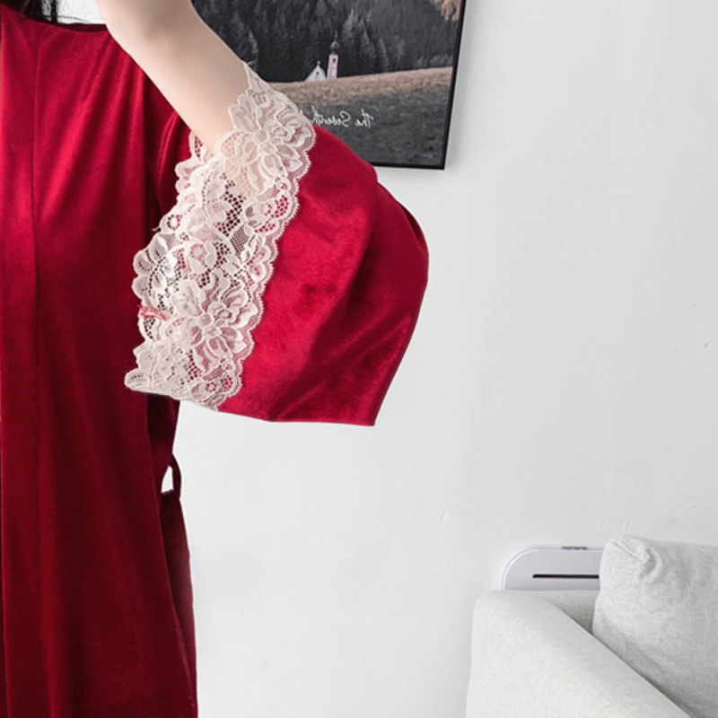 가을과 겨울 잠옷 여성의 섹시한 레이스 황금 벨벳 따뜻한 집 옷 침낭 느슨한 기숙사 복장