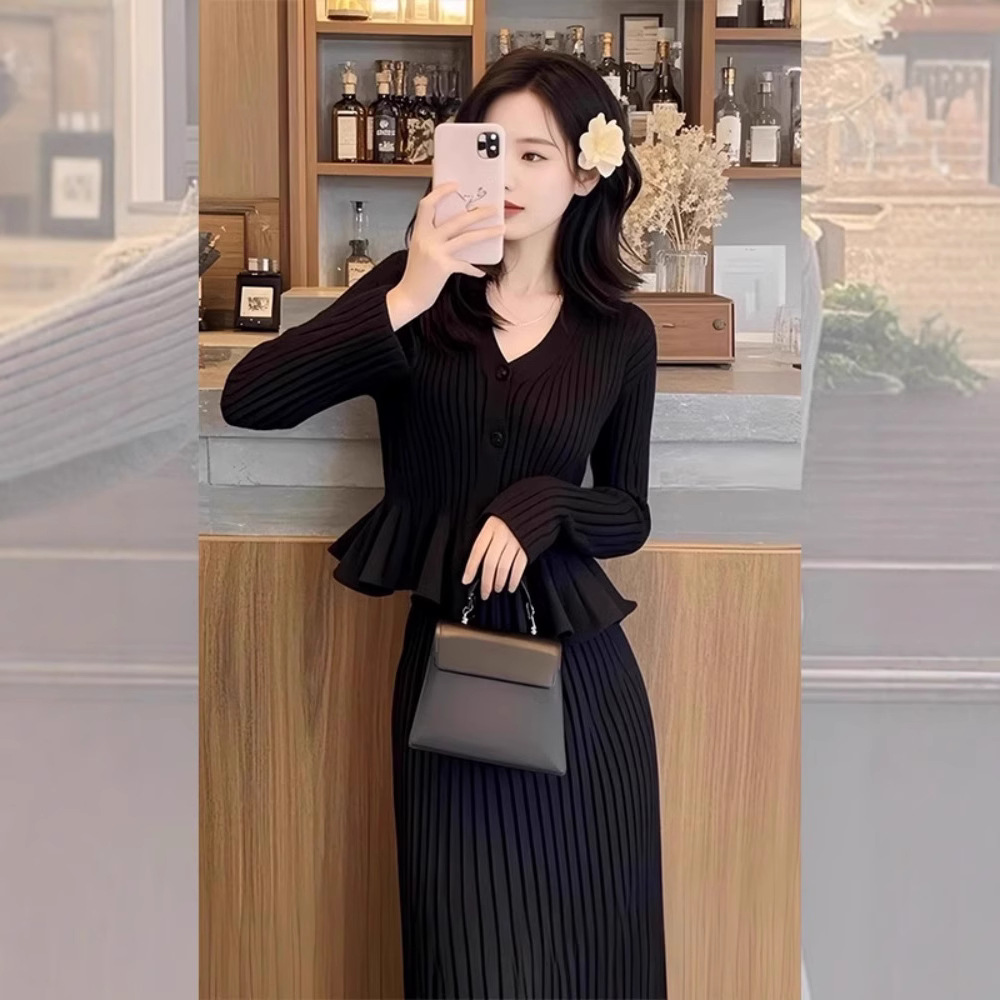 플러스 사이즈 여성 스웨터 세트 2025 초가을 새로운 다목적 작은 향기로운 스타일 v 넥 스웨터 스커트 투피스 세트