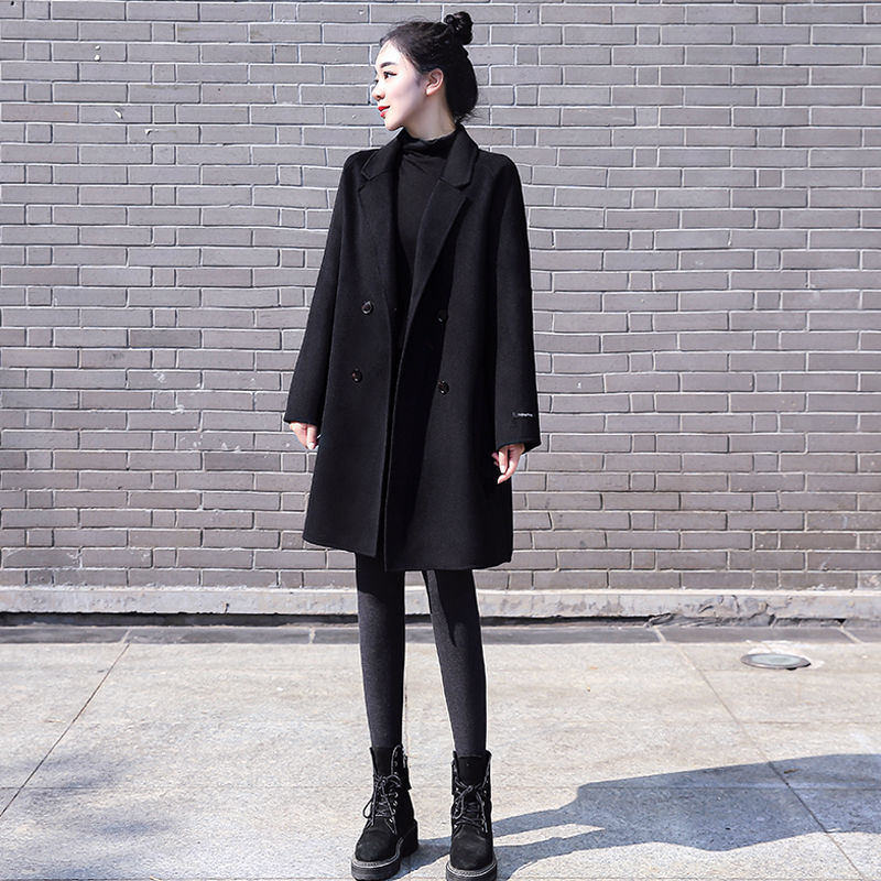 2024 새로운 한국 스타일 작은 가을/겨울 모직 코트 블랙 루즈 슬리밍 더블 브레스트 플러스 사이즈 모직 코트스토어 가기