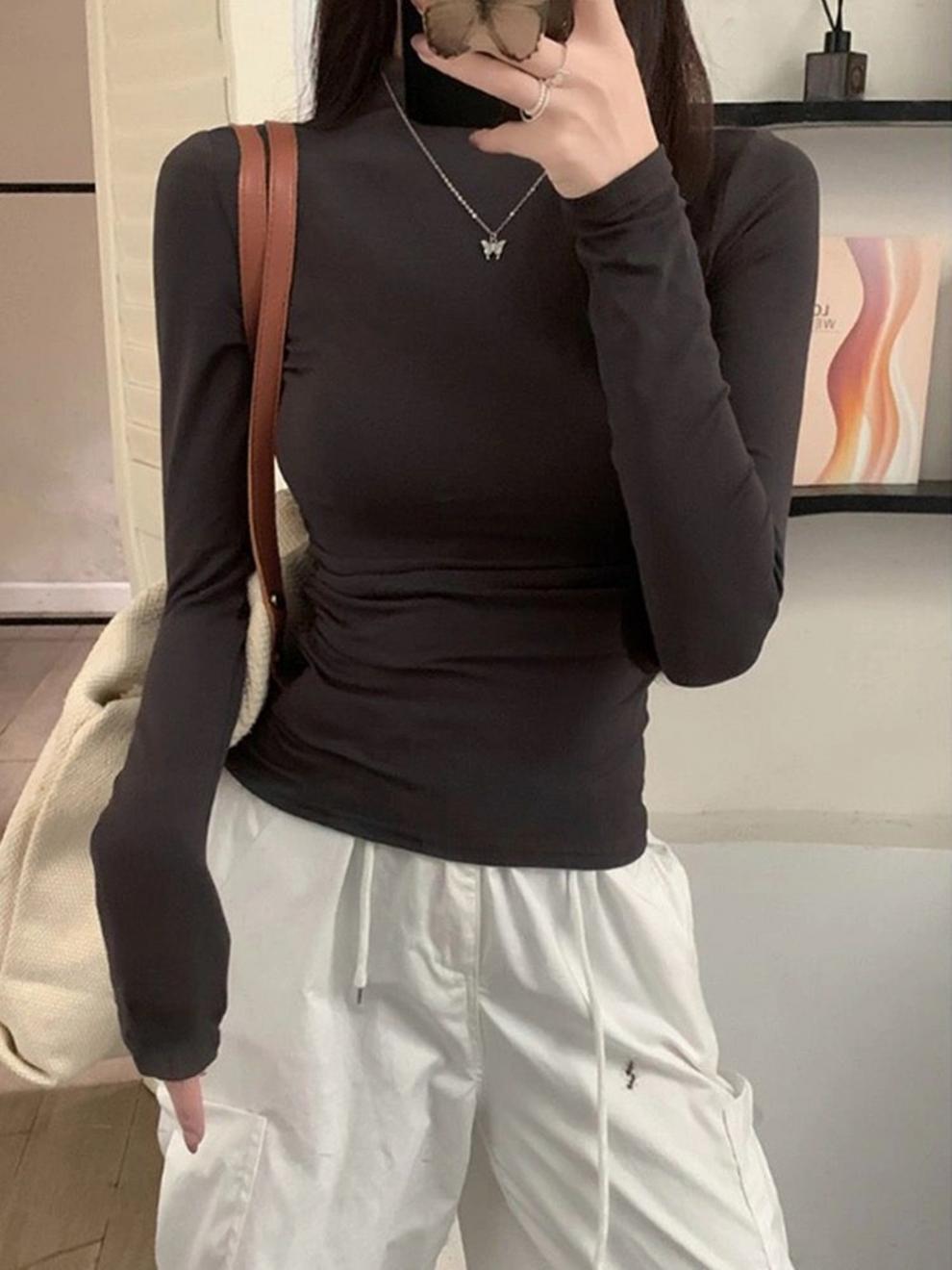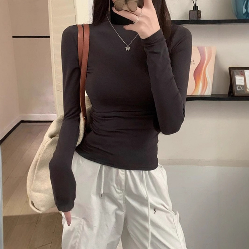 반하이넥 슬림핏 주름 긴팔 티셔츠 여성용 가을 신상 섹시 슬림핏 이너웨어 보온 베이스 레이어 탑