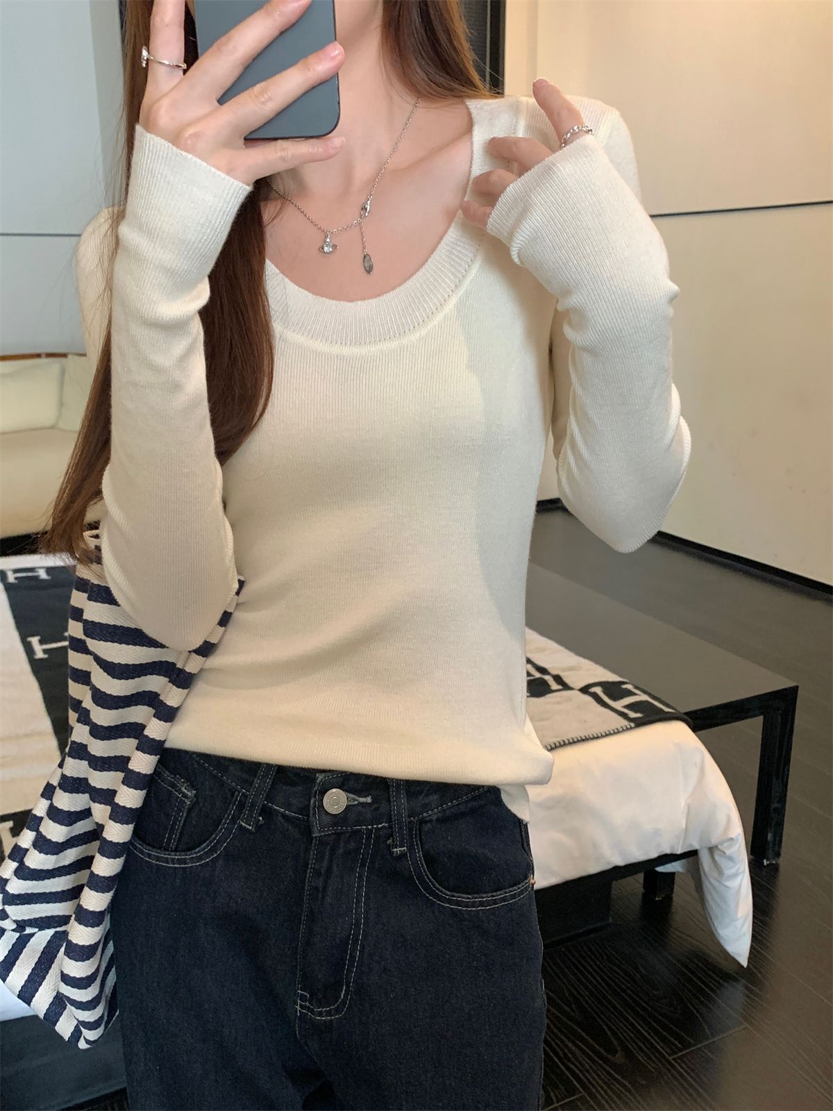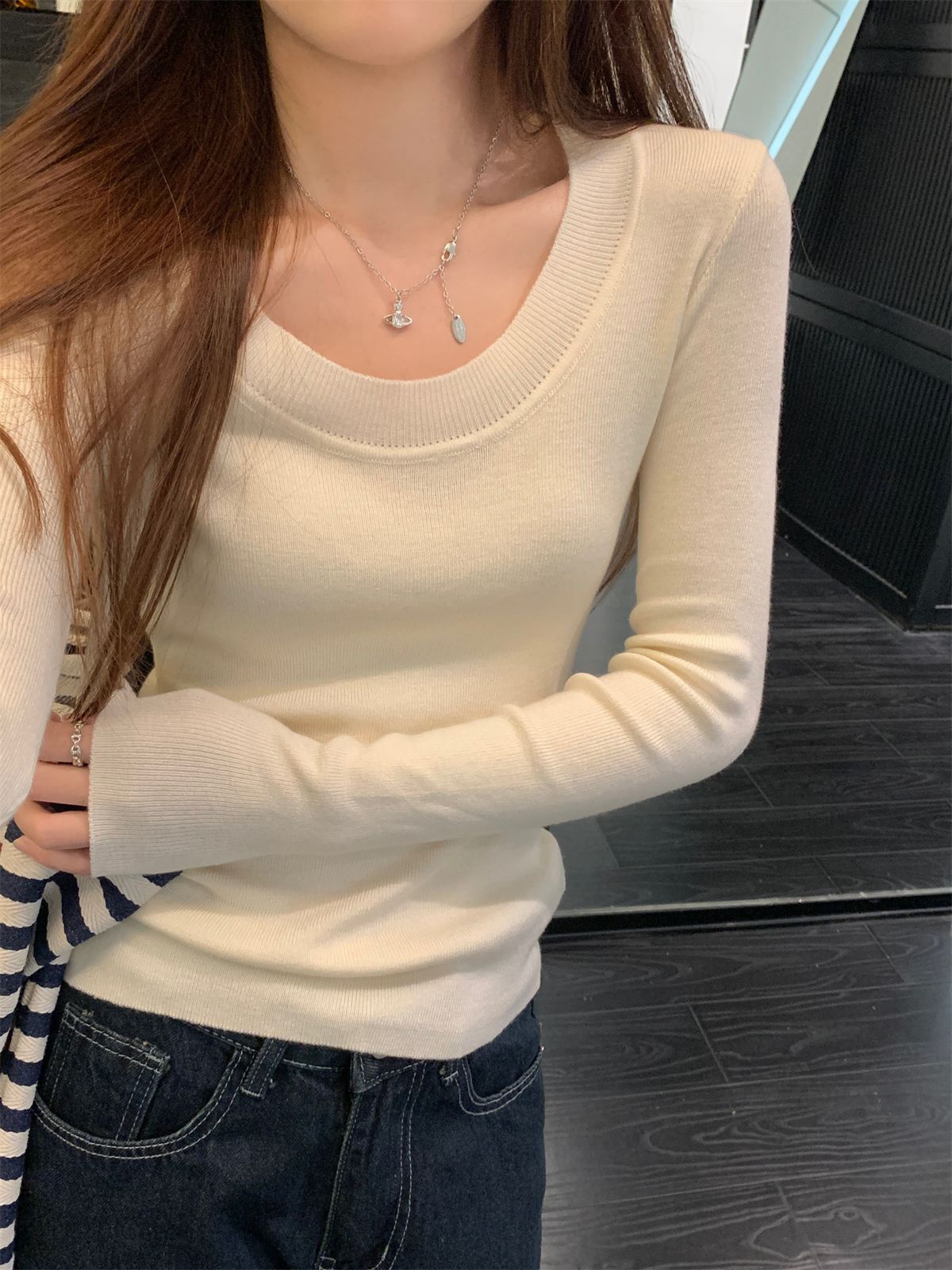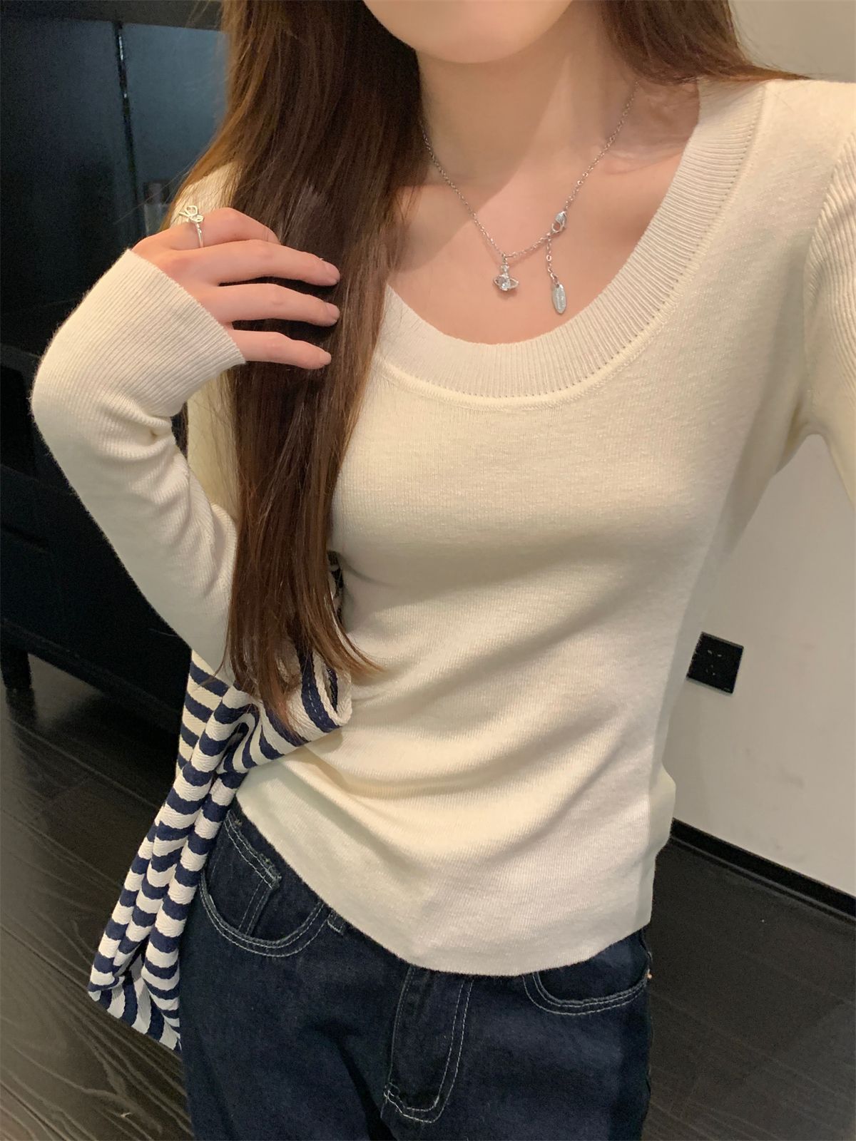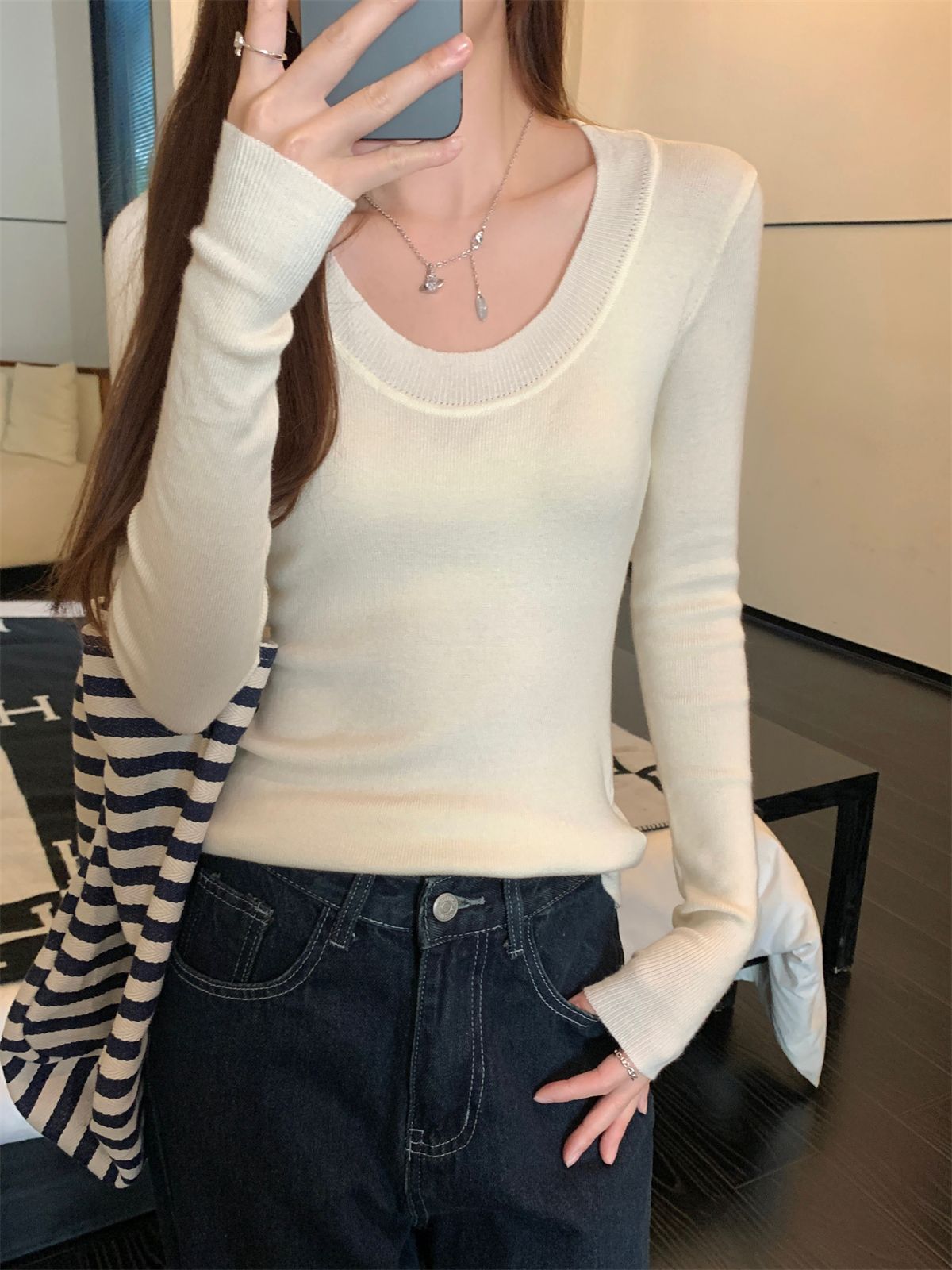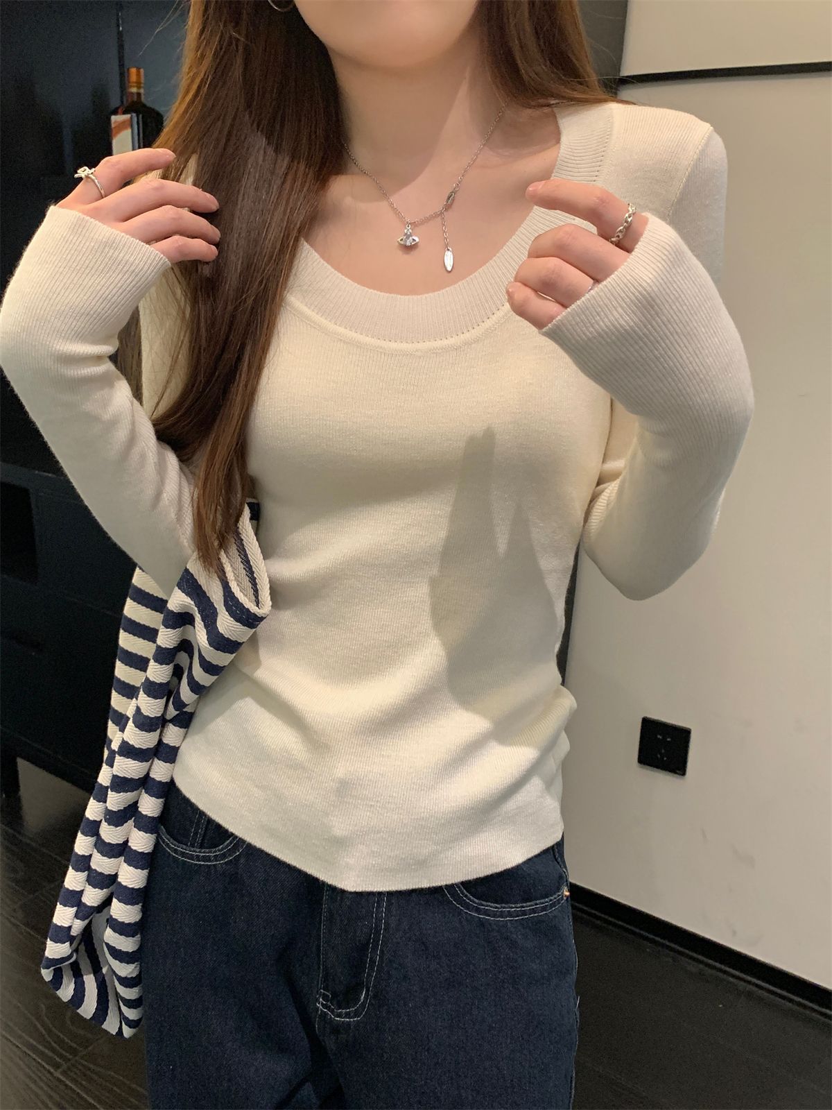 한국식 슬림핏 U 칼라 우아한 슬림핏 긴팔 스웨터 여자 가을 · 겨울 새 유행 올매치 이너베이스 탑