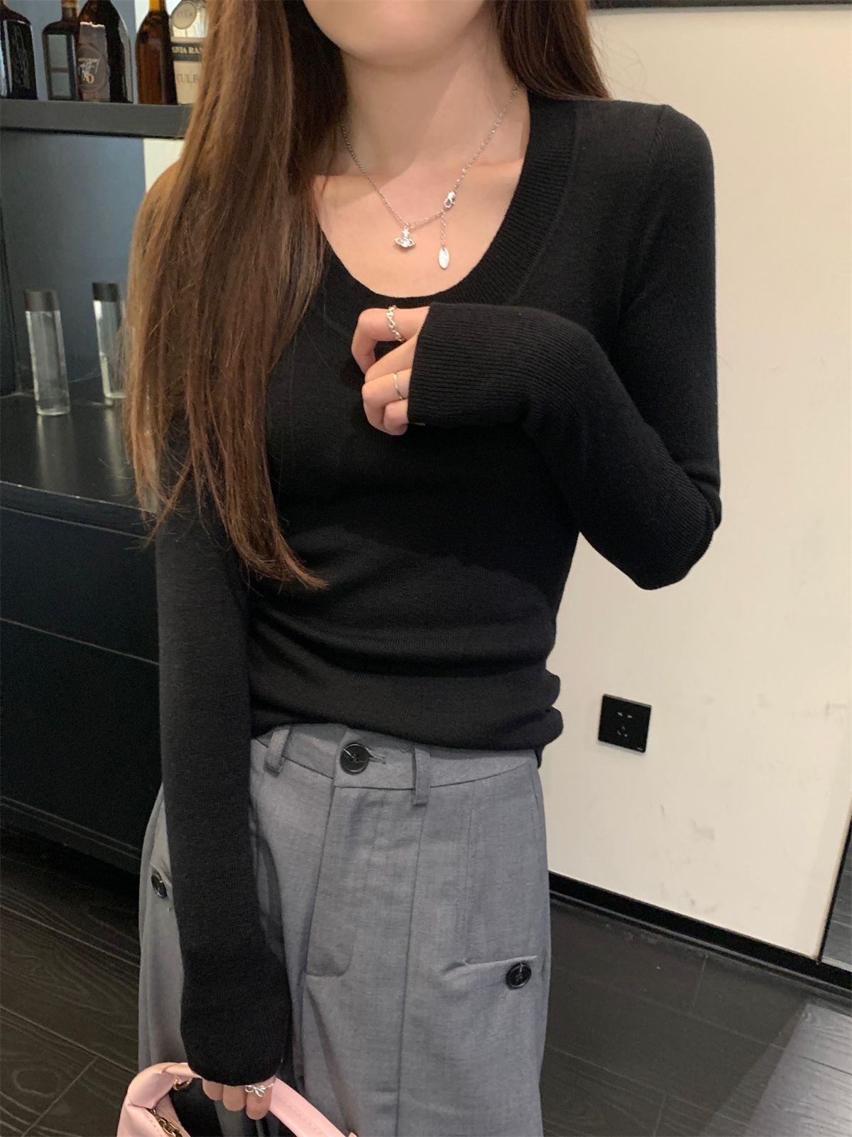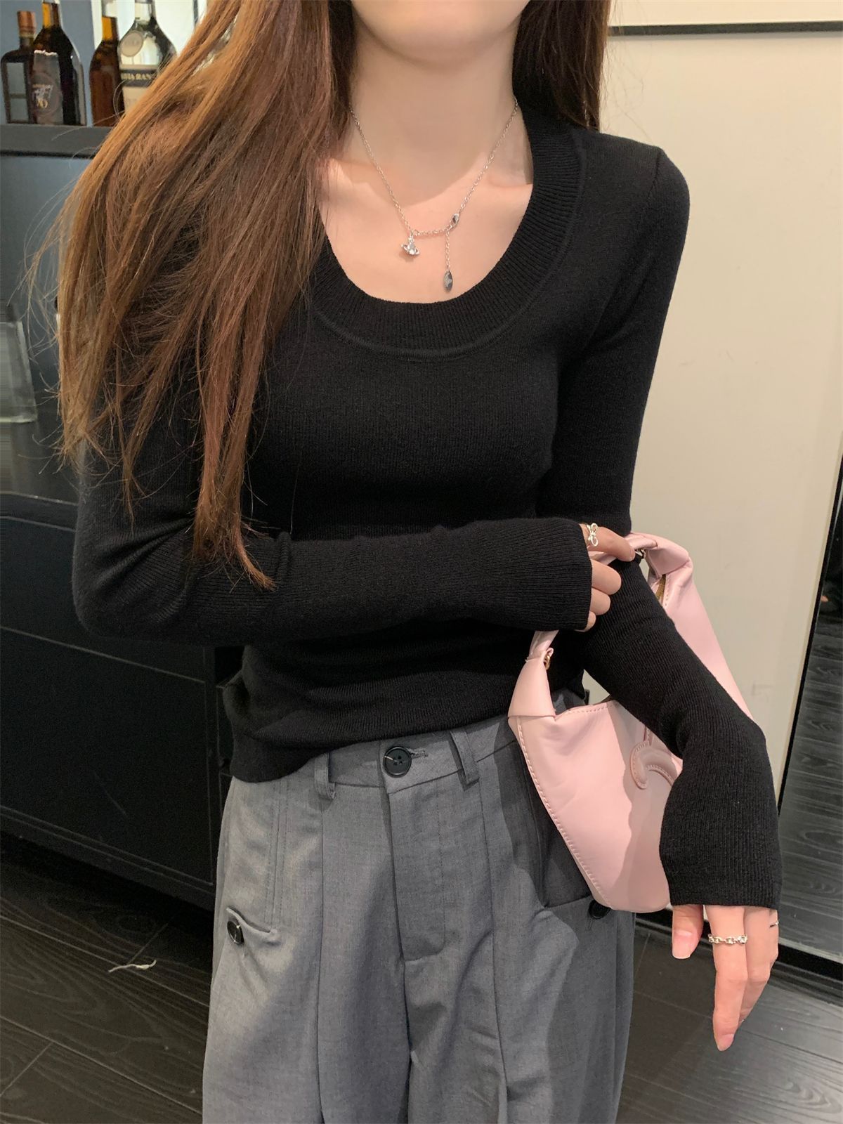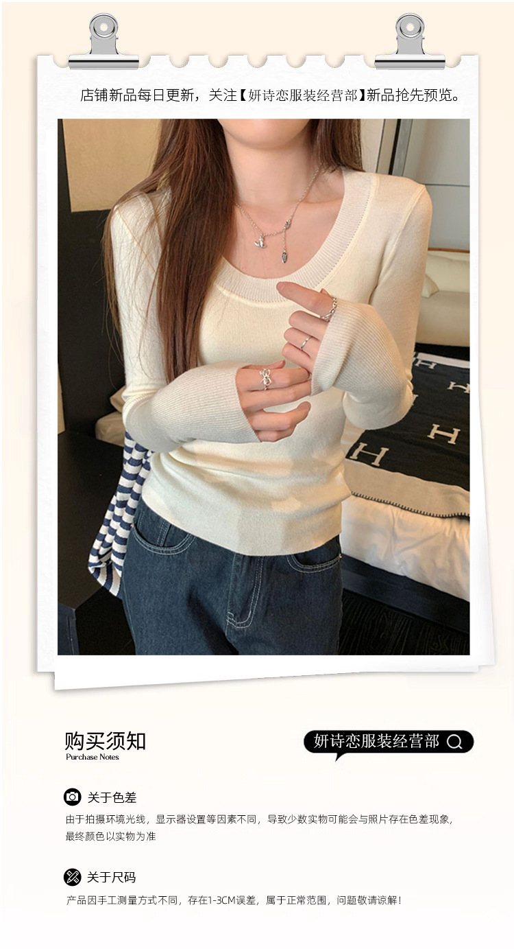 한국식 슬림핏 U 칼라 우아한 슬림핏 긴팔 스웨터 여자 가을 · 겨울 새 유행 올매치 이너베이스 탑스토어 가기