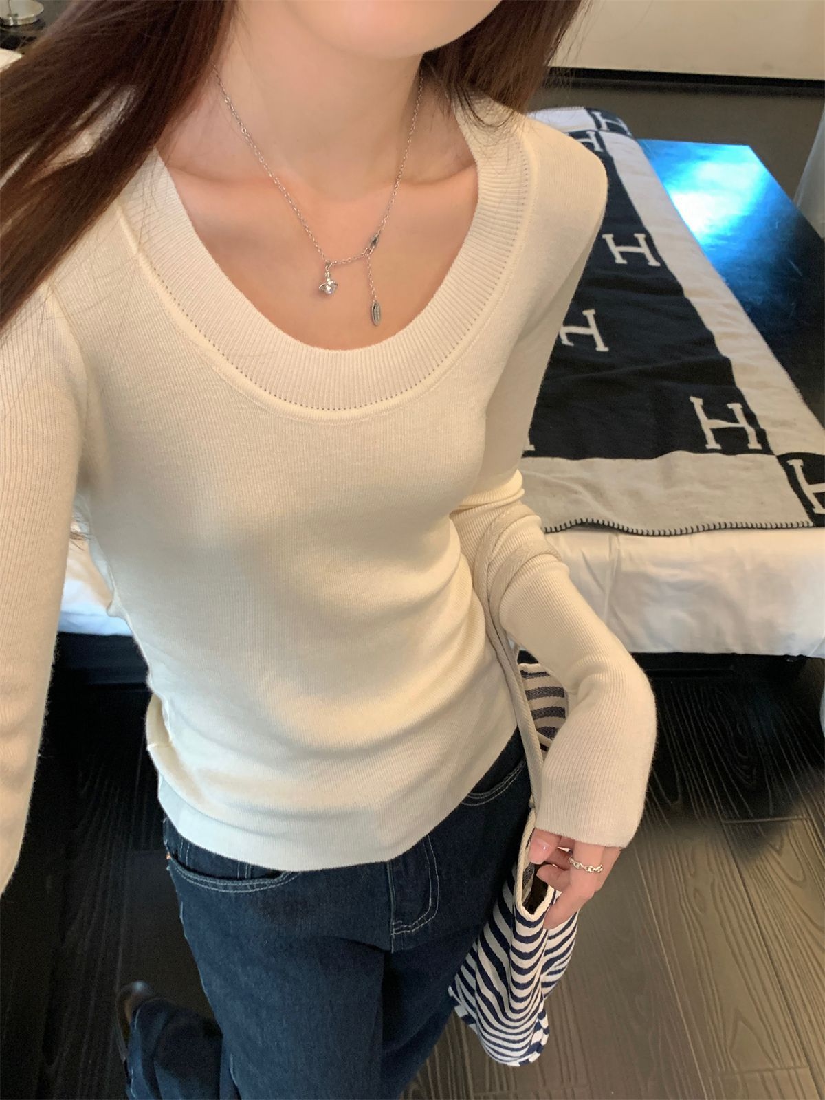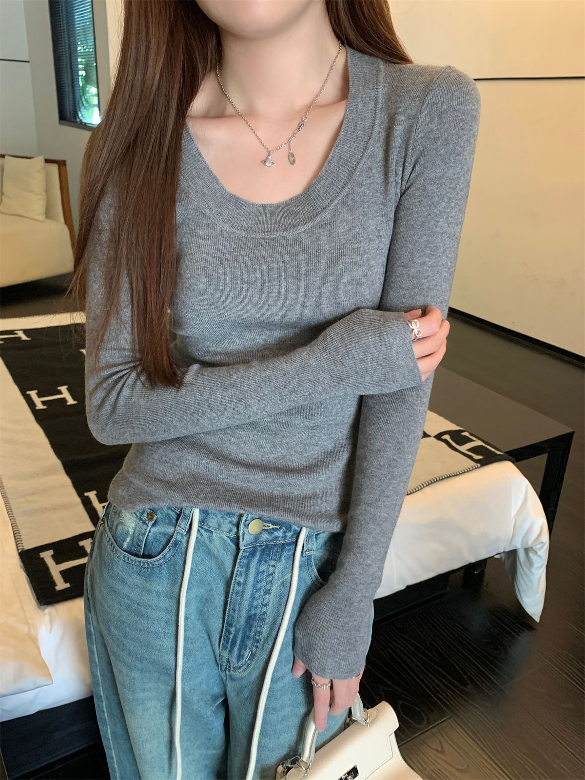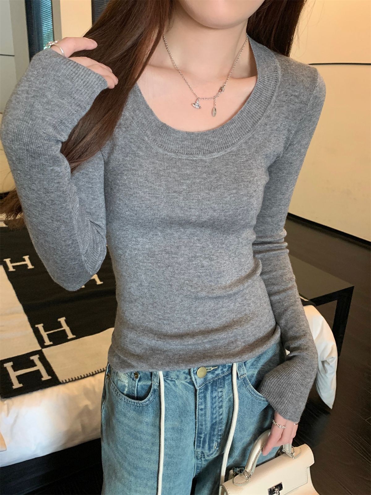 한국식 슬림핏 U 칼라 우아한 슬림핏 긴팔 스웨터 여자 가을 · 겨울 새 유행 올매치 이너베이스 탑스토어 가기