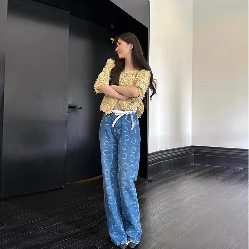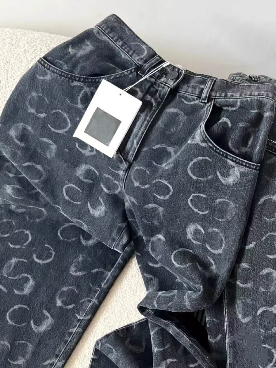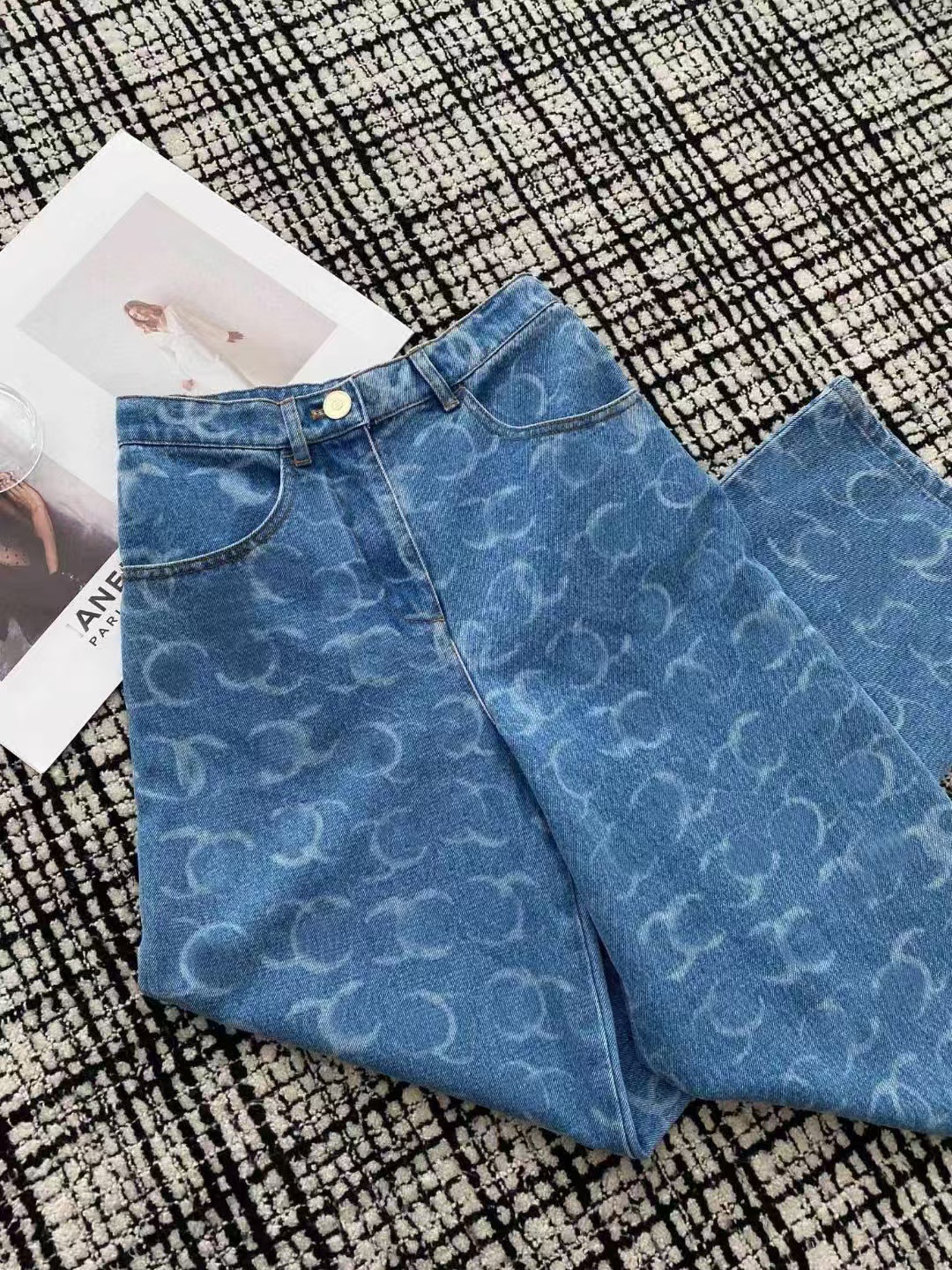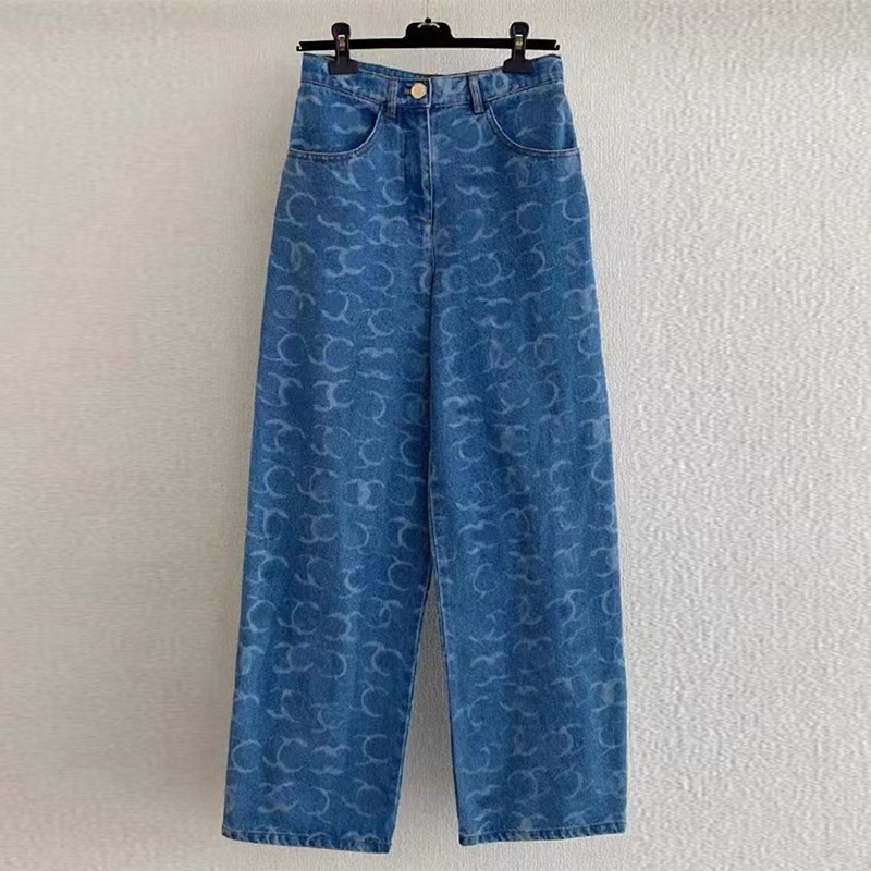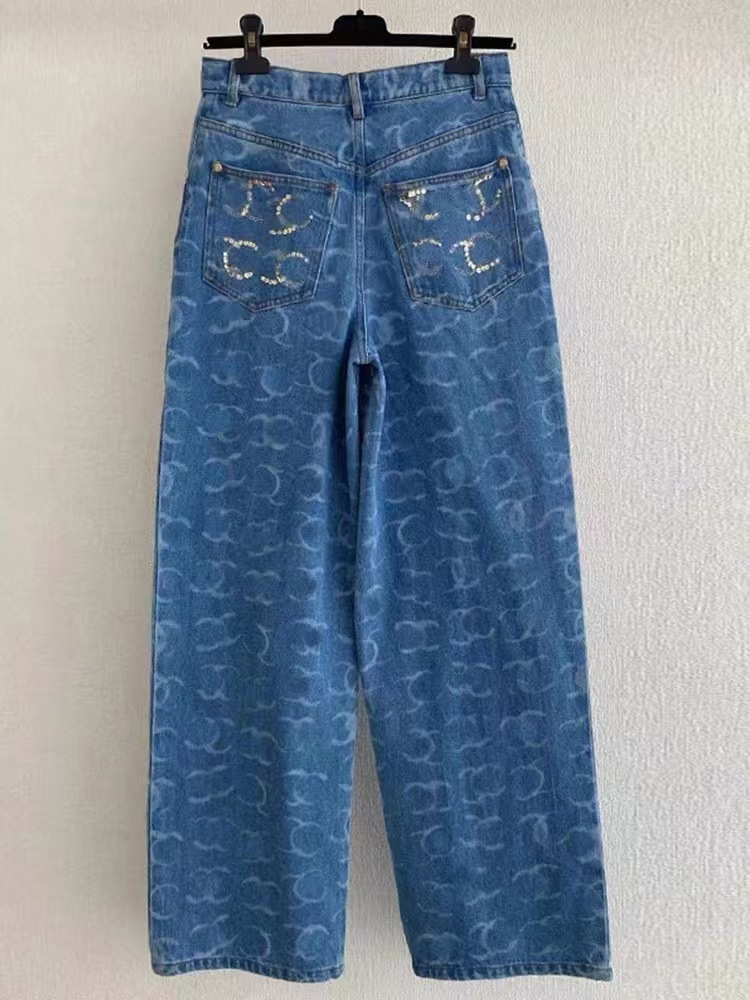 Nanyou 하이 엔드 여성 의류 2024 새로운 유럽 CH 작은 향기로운 스타일 로고 스팽글 높은 허리 스트레이트 다리 넓은 다리 청바지 여성스토어 가기