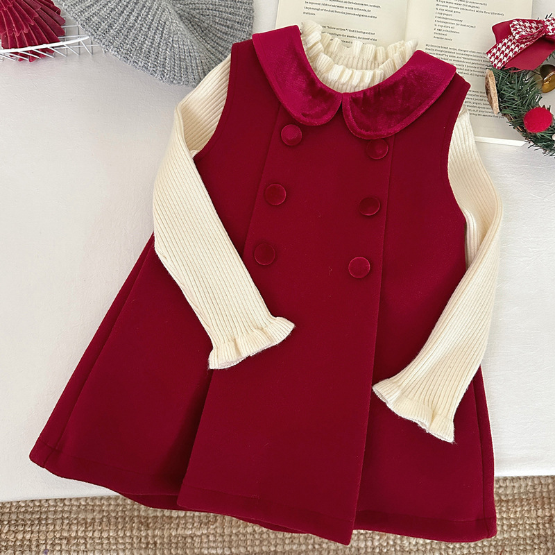 여아용 빨간색 모직 조끼 원피스 겨울 2025 신상 아기용 플리스 원피스 어린이용 두꺼운 새해 원피스