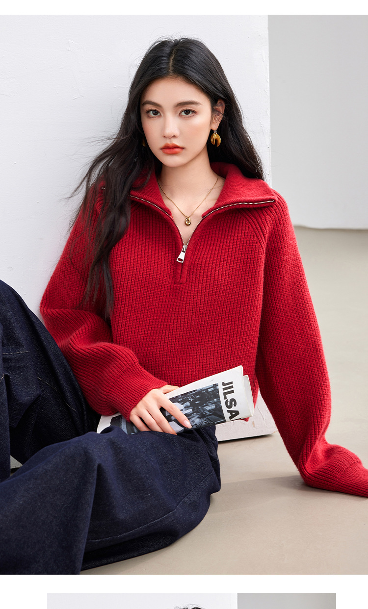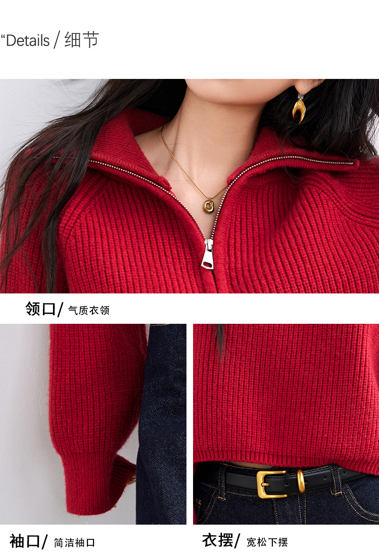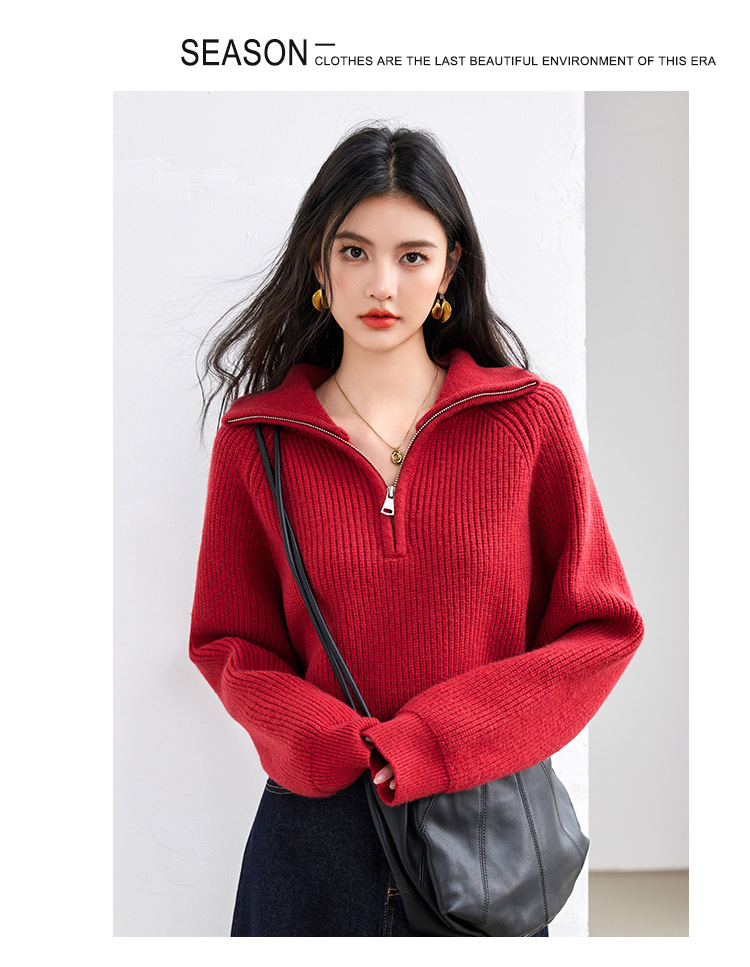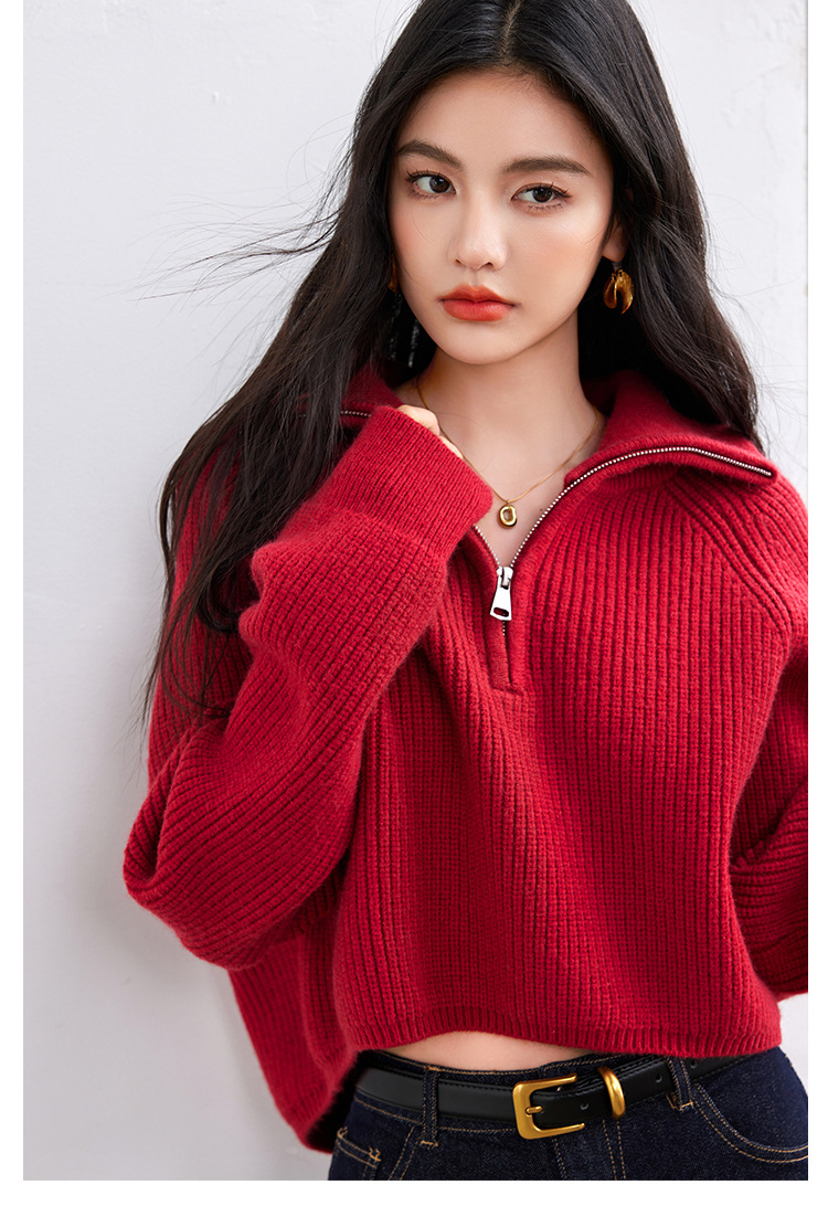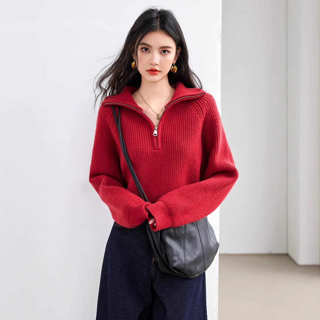 디자인 센스 하프 하이 넥 지퍼 레드 니트 스웨터 여성의 2024 가을과 겨울 새로운 두꺼운 짧은 풀오버 핏 스웨터