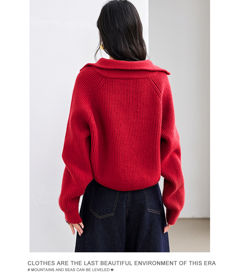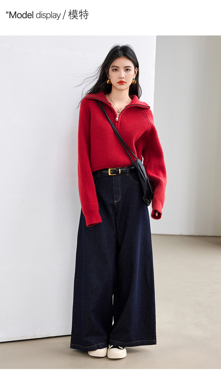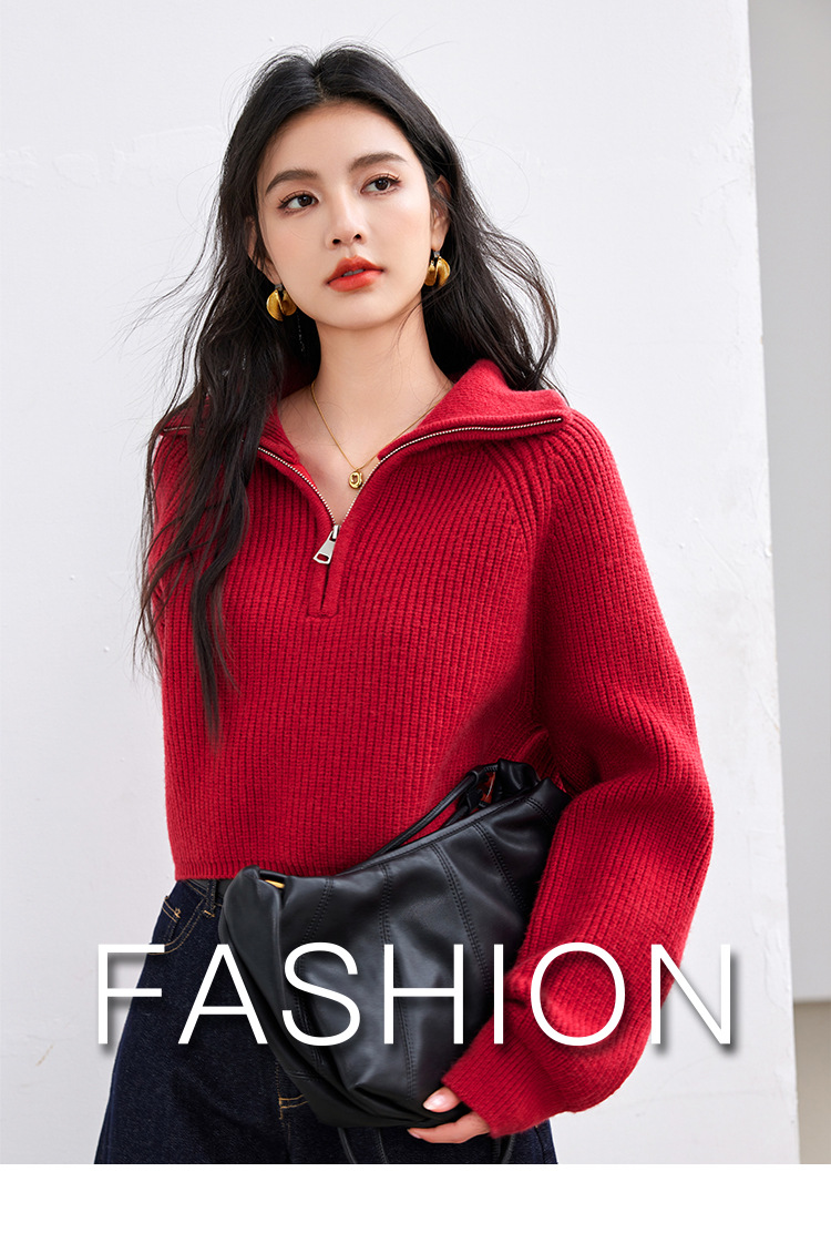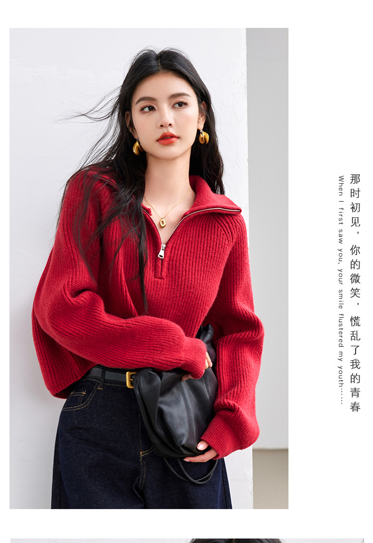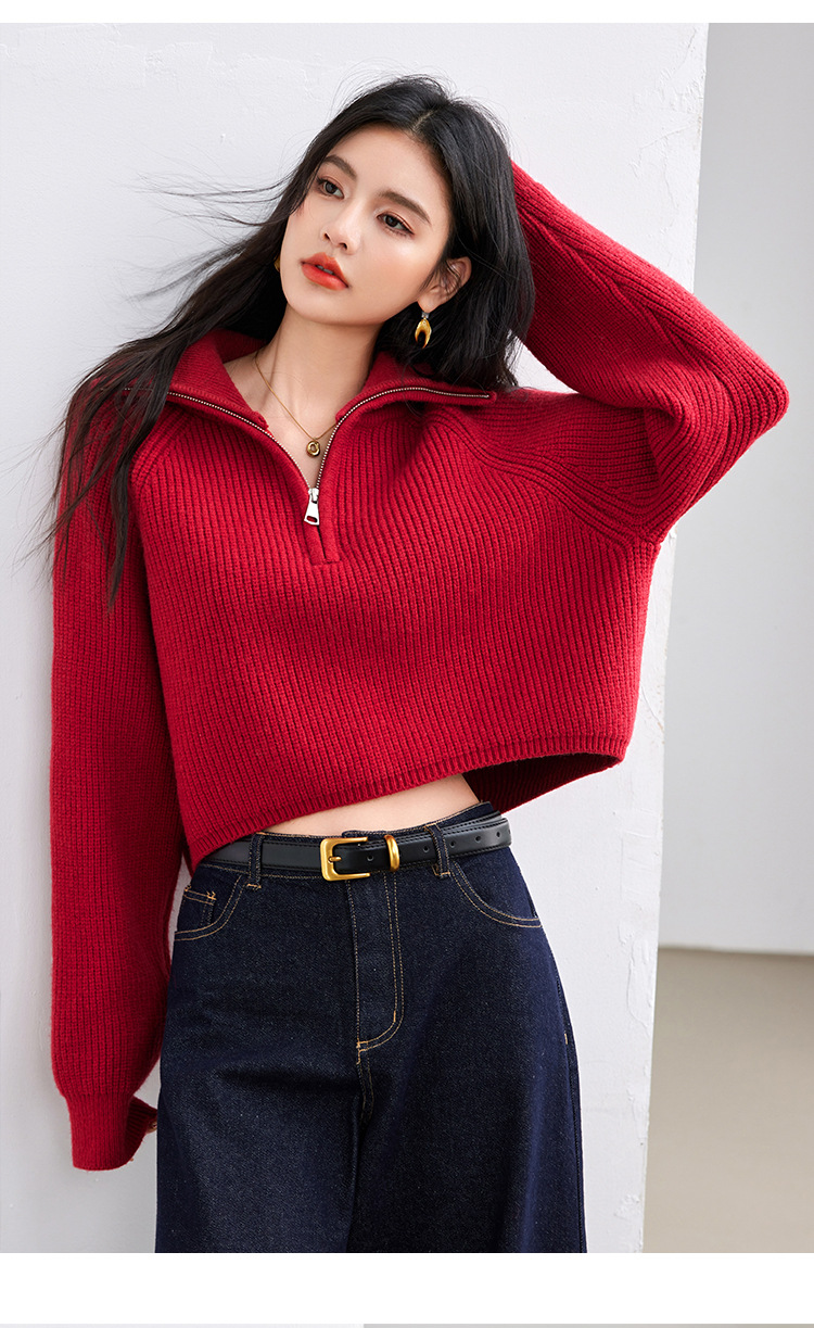 디자인 센스 하프 하이 넥 지퍼 레드 니트 스웨터 여성의 2024 가을과 겨울 새로운 두꺼운 짧은 풀오버 핏 스웨터