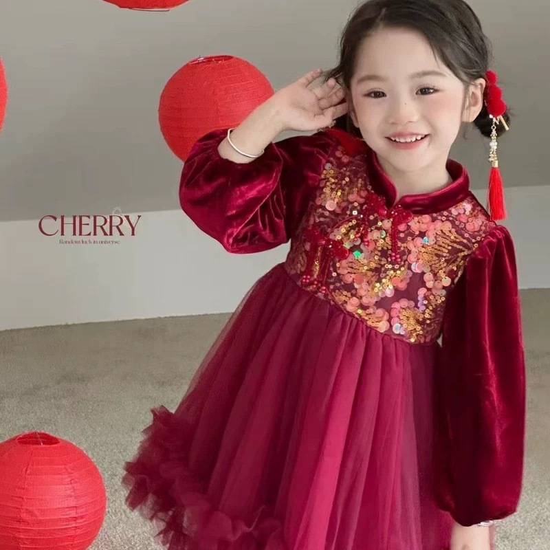 소녀와 어린이의 새로운 기모 긴 소매 원피스 국가 스타일 메쉬 스티칭 공주 원피스 가을과 겨울 2024스토어 가기