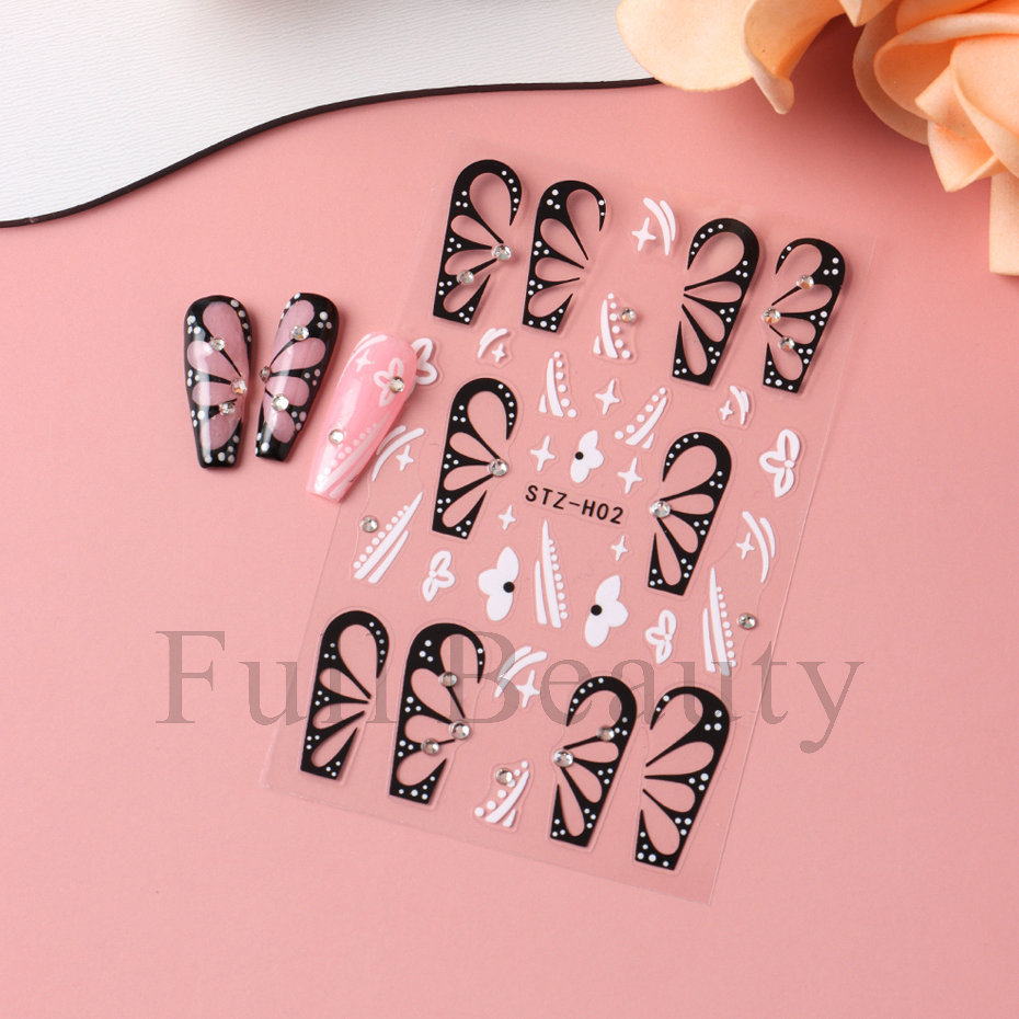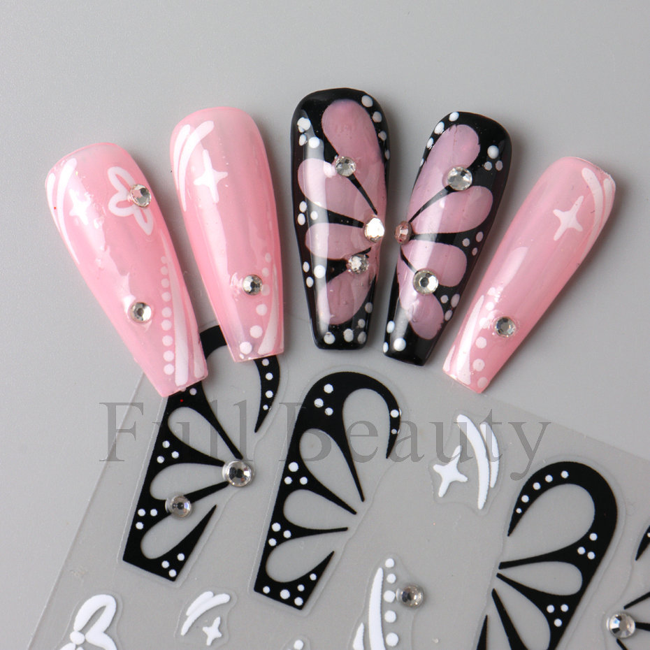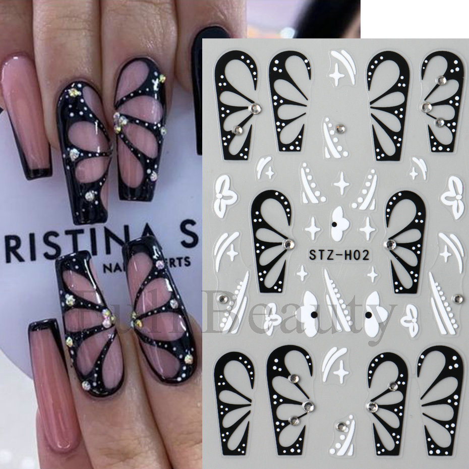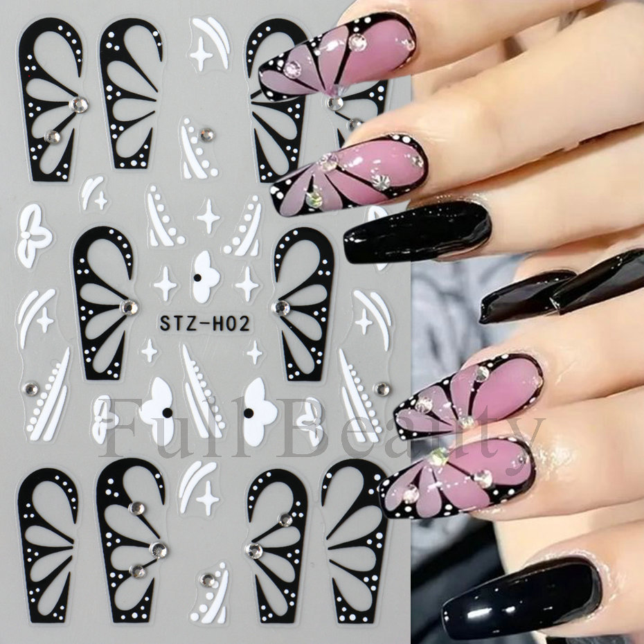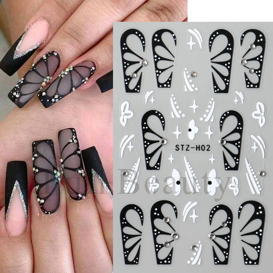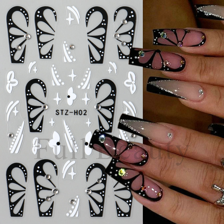 다이아몬드 플라워 라인 네일 스티커가있는 고급 센스 블랙 할로우 나비 날개스토어 가기