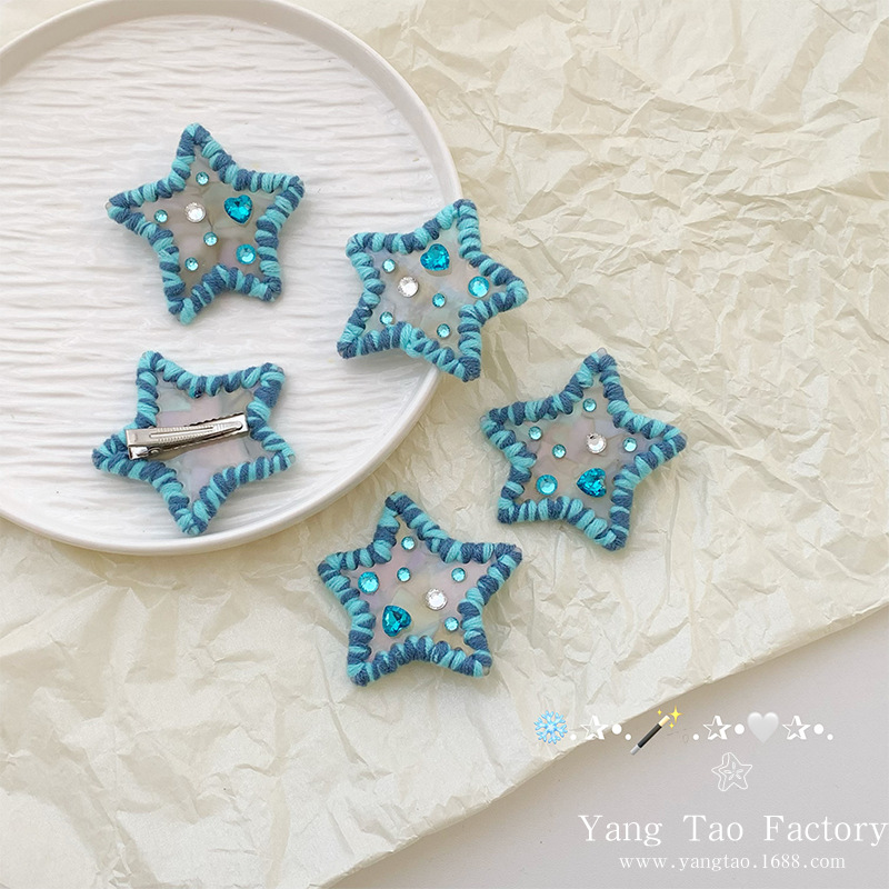 Shen Yue 같은 블루 스타 대조 컬러 울 사이드 클립 Acetic Acid 헤어핀 귀여운 사이드 헤어핀 Bangs 클립 헤드웨어스토어 가기