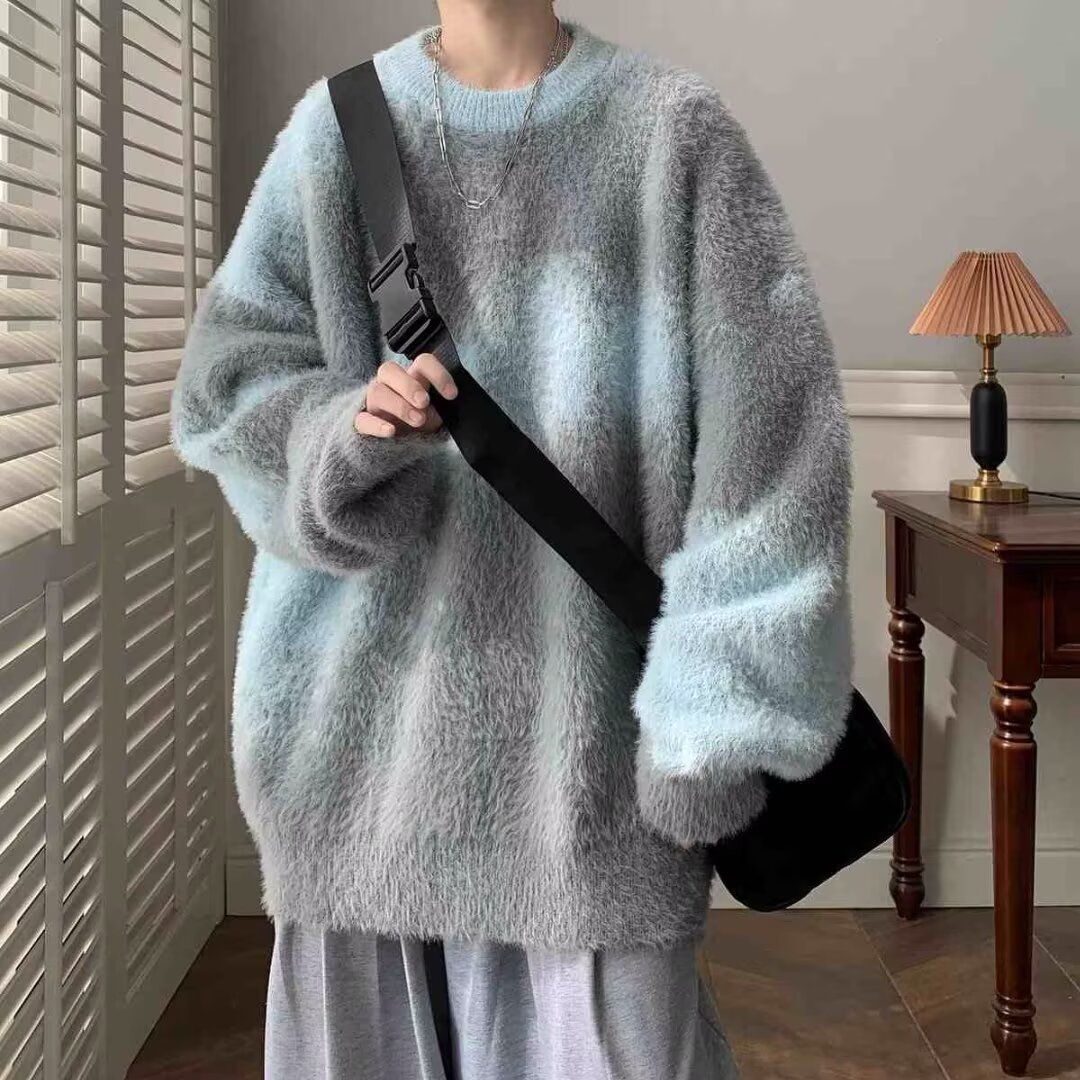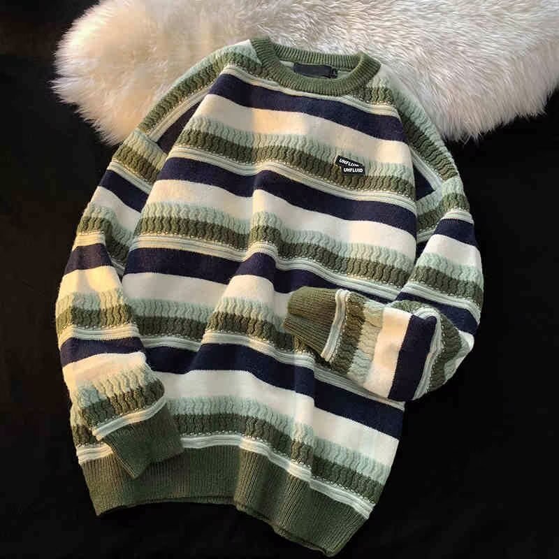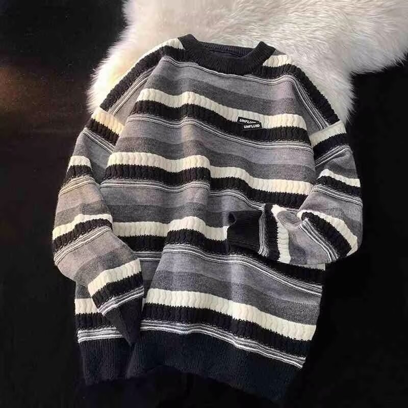 스트라이프 크루 넥 스웨터 남자의 겨울 디자인 센스 니쉬 일본 풀오버 스웨터 루즈 트렌디베이스 스웨터