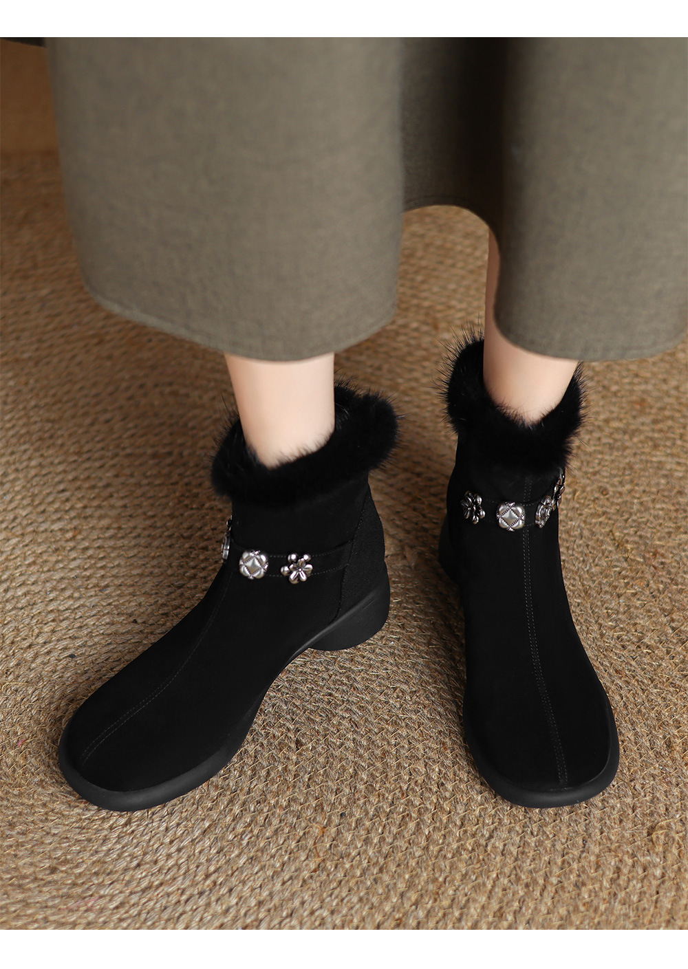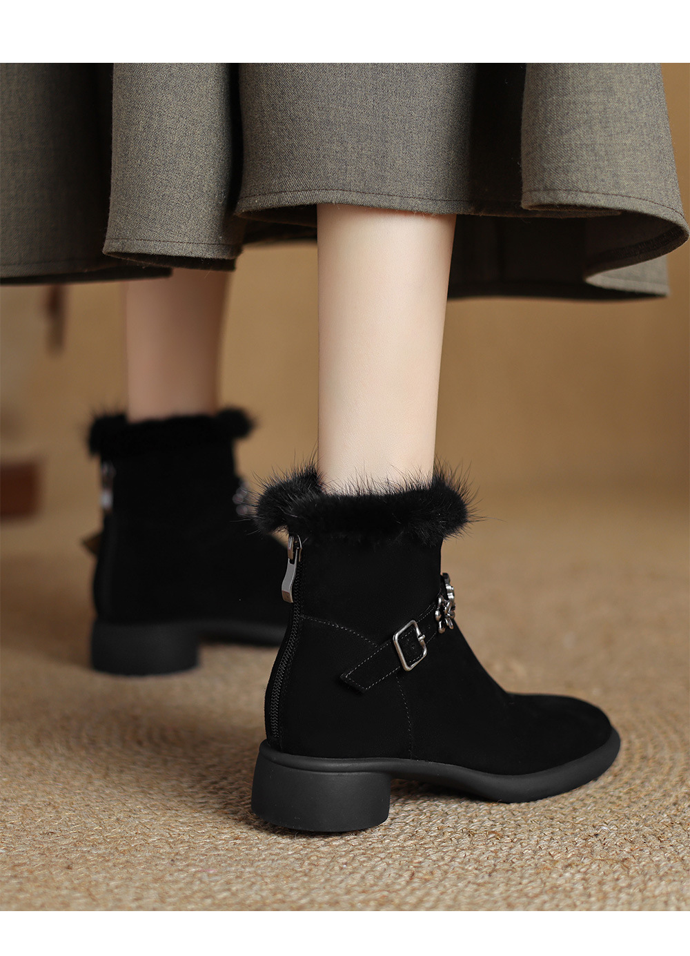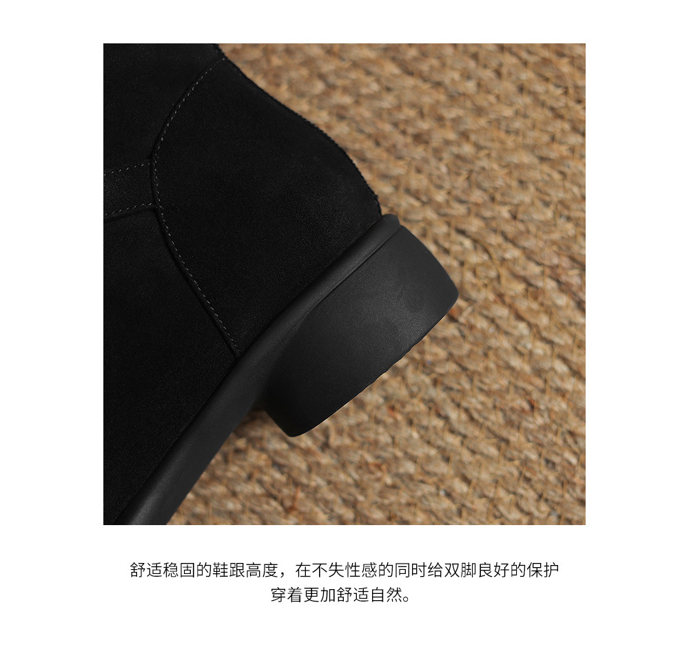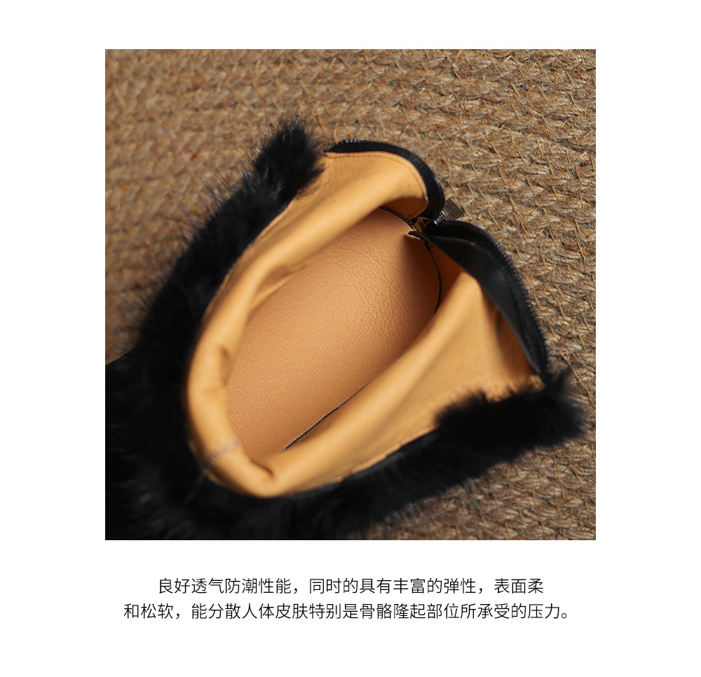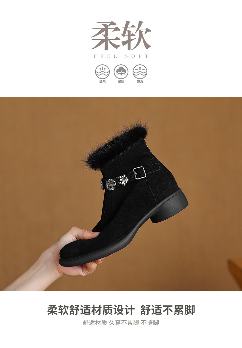 모피 쇼트 부츠 여성 봄과 가을 싱글 부츠 2024 새로운 라운드 발가락 미들 두꺼운 힐 가죽 라인스톤 프로스트 기모 두꺼운 바닥스토어 가기