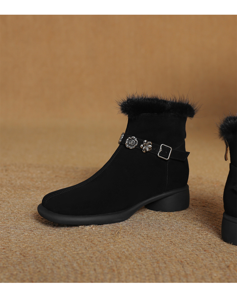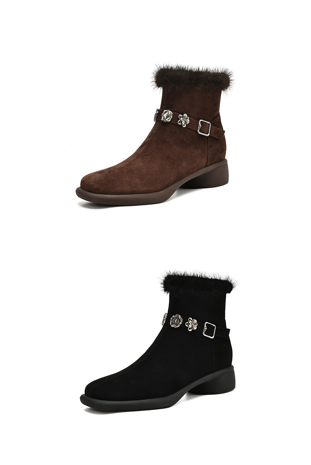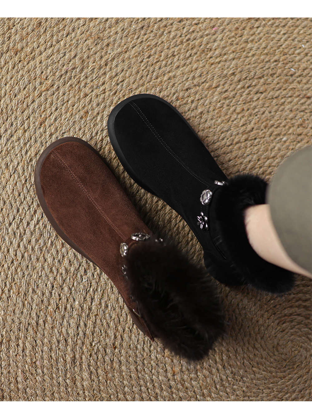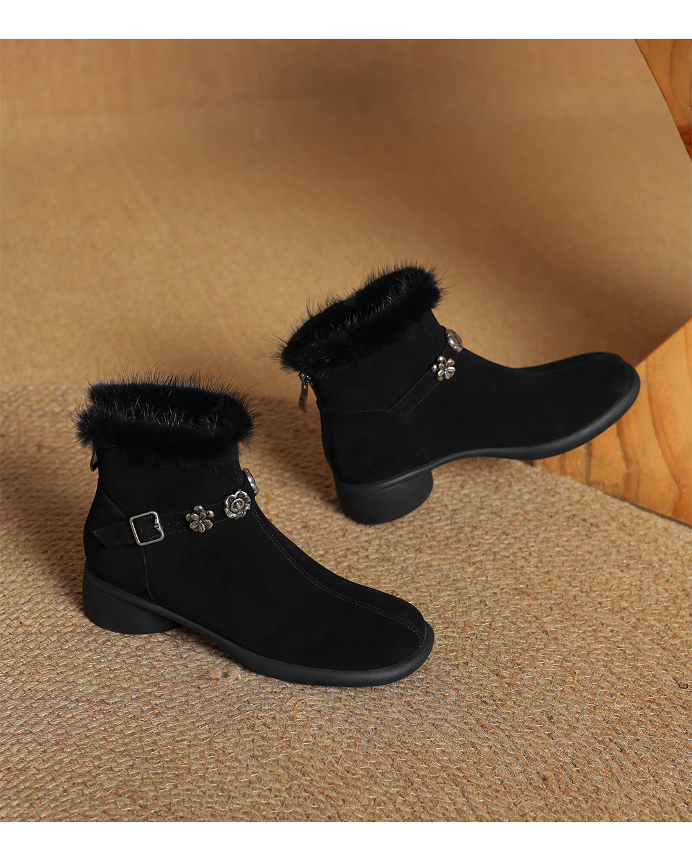 모피 쇼트 부츠 여성 봄과 가을 싱글 부츠 2024 새로운 라운드 발가락 미들 두꺼운 힐 가죽 라인스톤 프로스트 기모 두꺼운 바닥스토어 가기