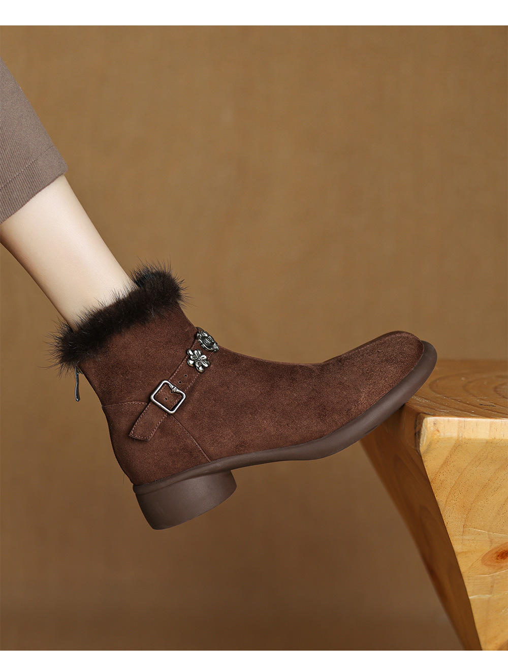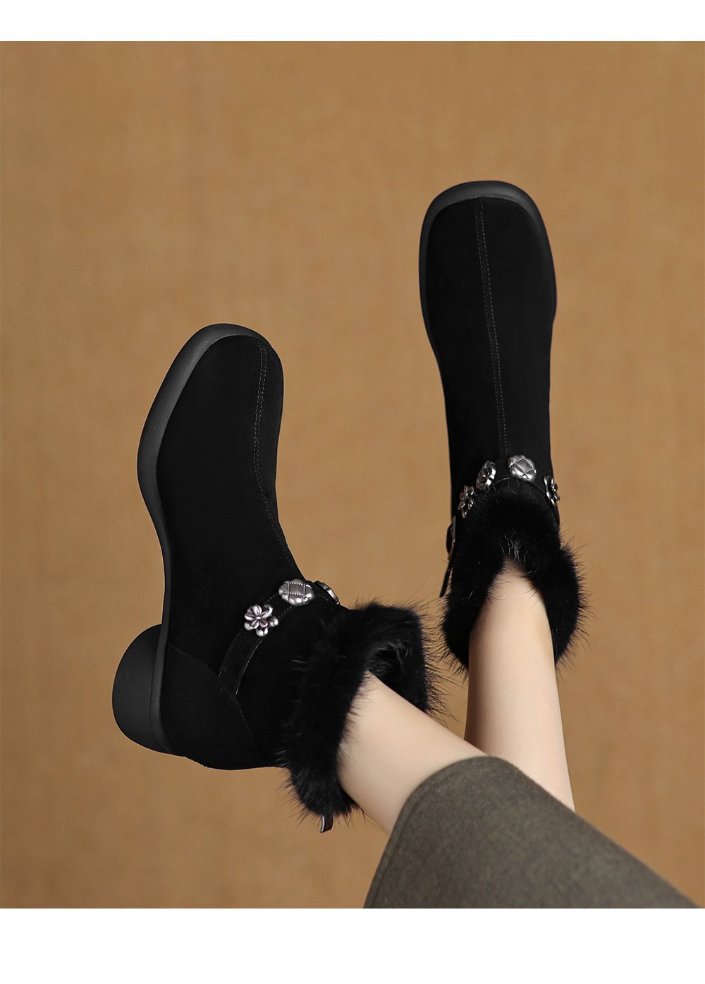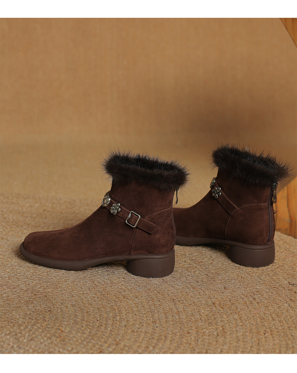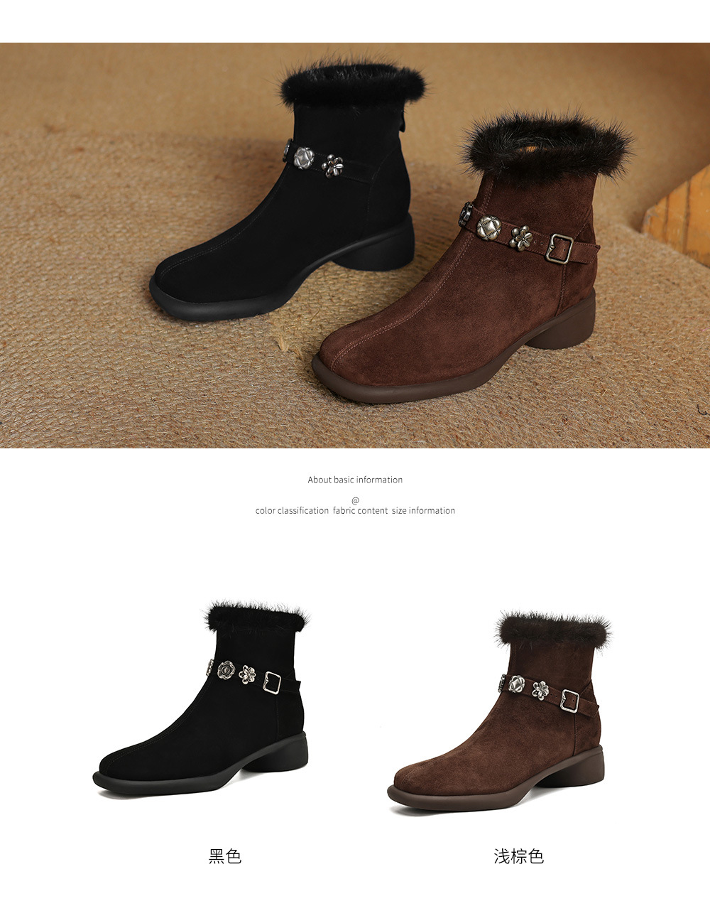 모피 쇼트 부츠 여성 봄과 가을 싱글 부츠 2024 새로운 라운드 발가락 미들 두꺼운 힐 가죽 라인스톤 프로스트 기모 두꺼운 바닥스토어 가기
