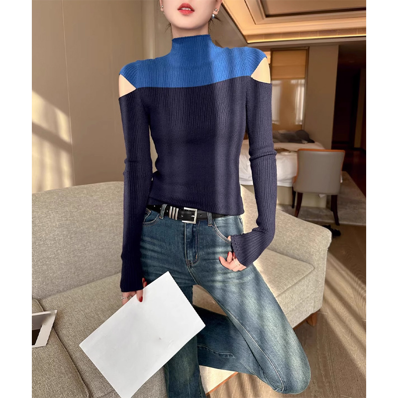 블루 컬러 매칭 세미 하이 칼라 긴팔 스웨터 여성의 가을 2024 새로운 중공 패션 외국 스타일 스웨터스토어 가기