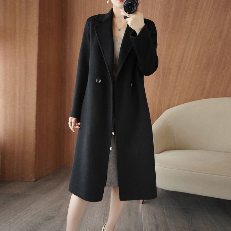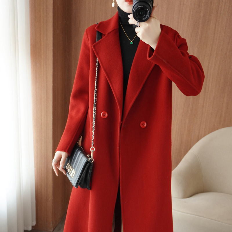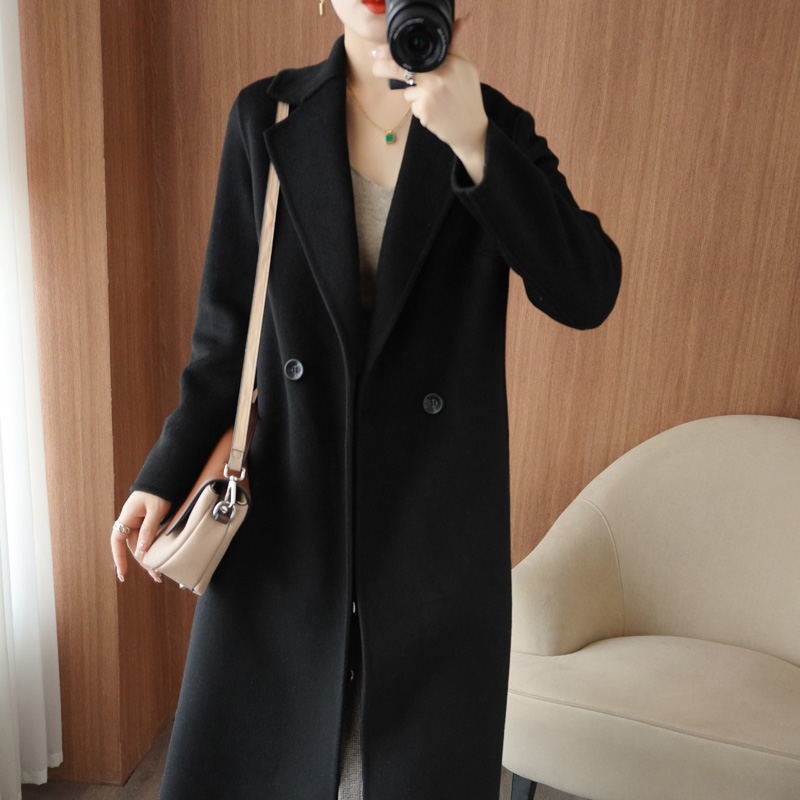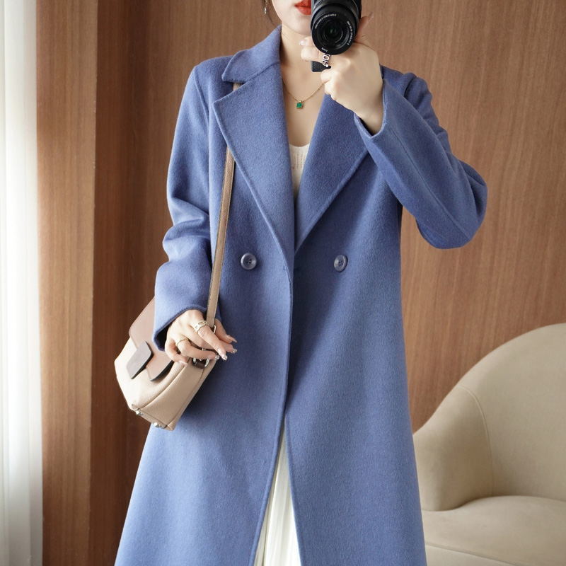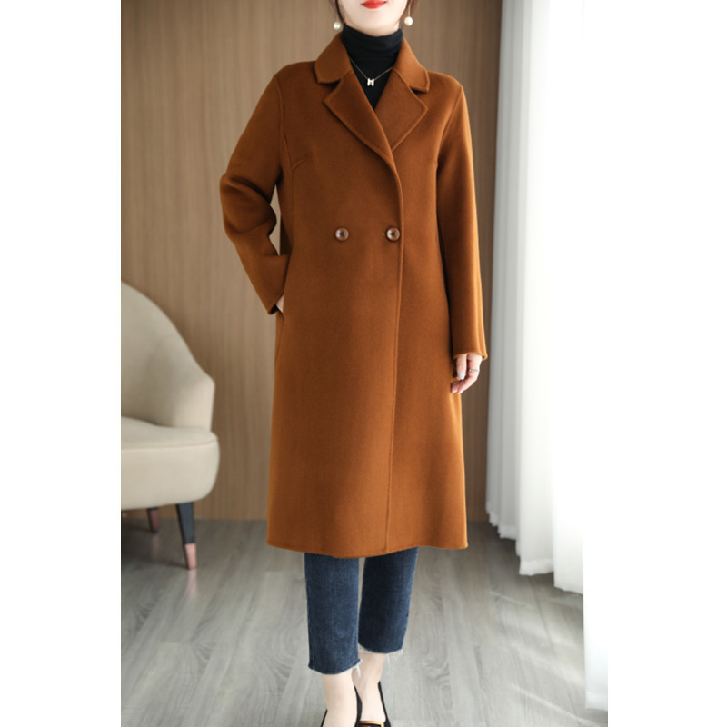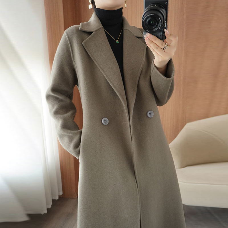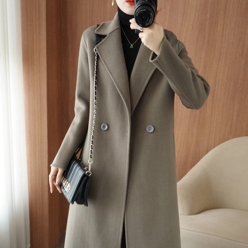 100 순수 양모 가을과 겨울 새로운 유능하고 아름다운 날카로운 Hepburn 여성을위한 수제 양면 트위드 중간 길이의 캐시미어 코트