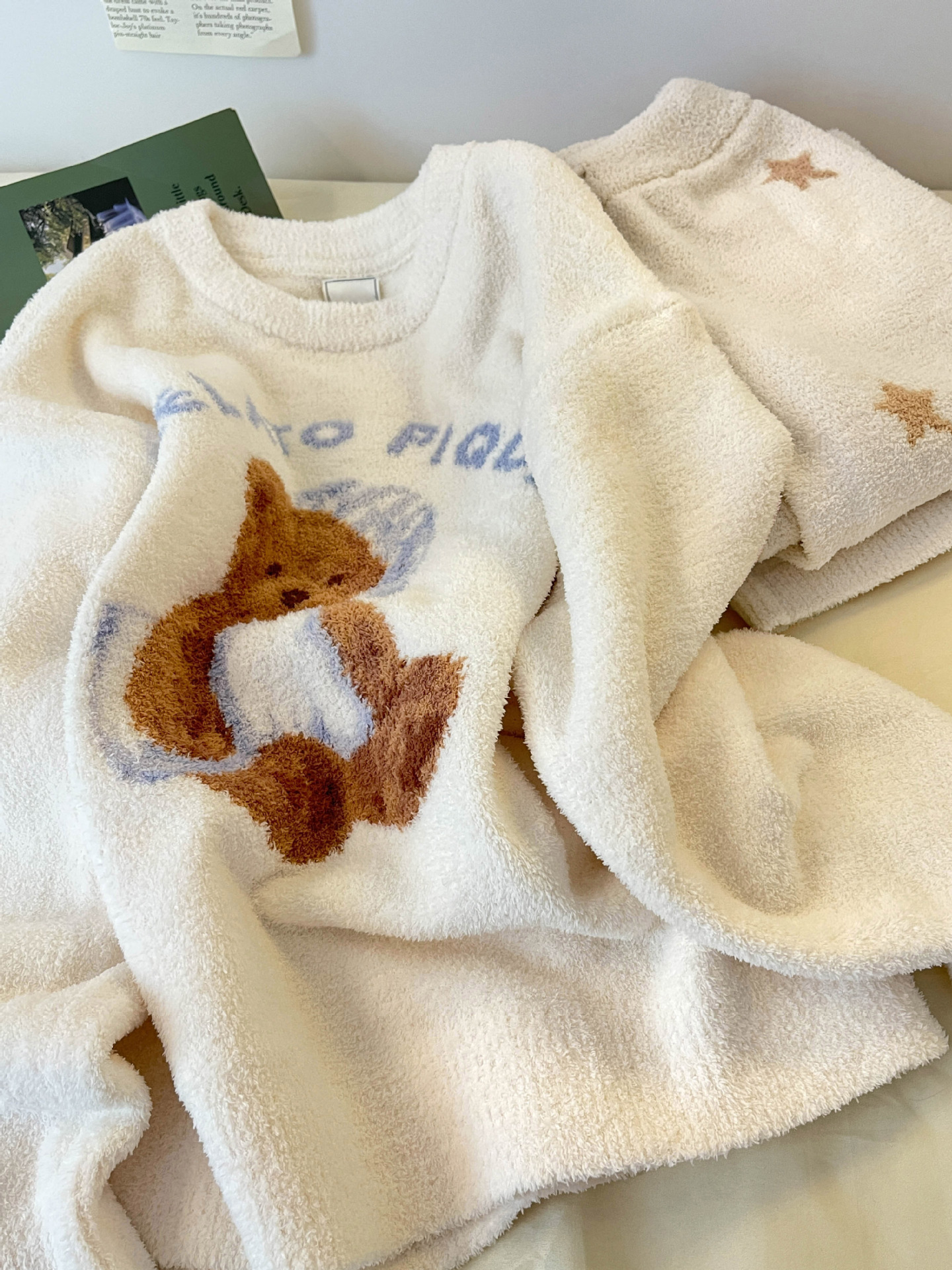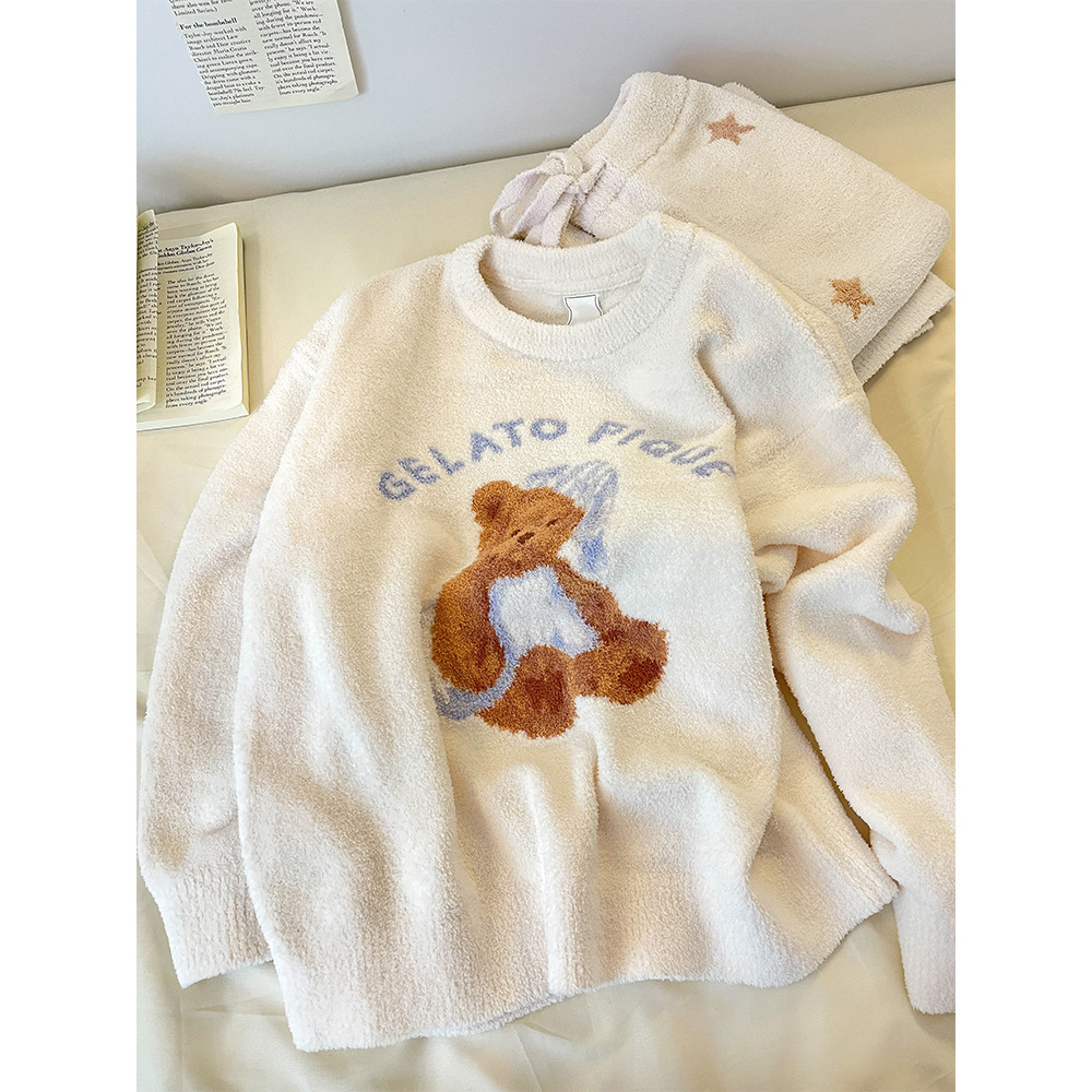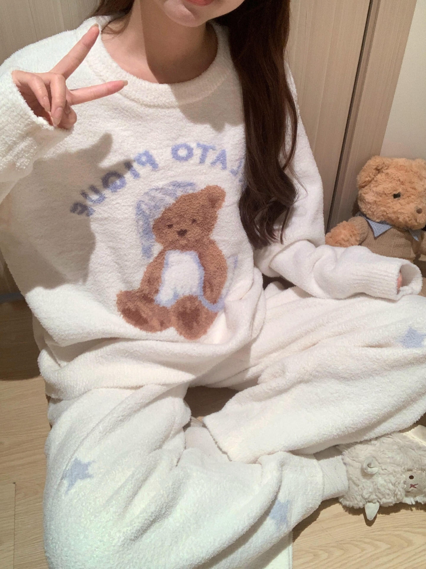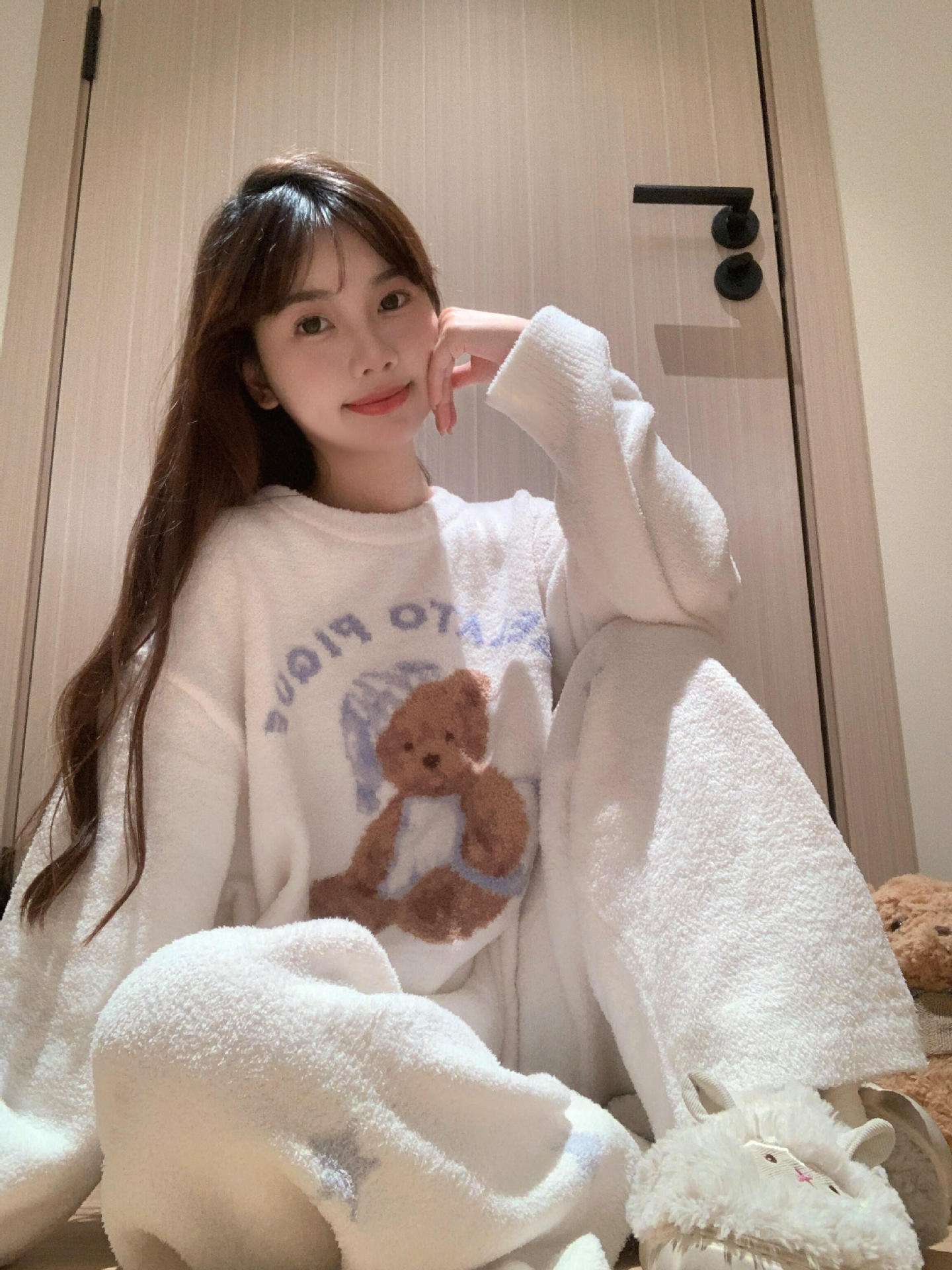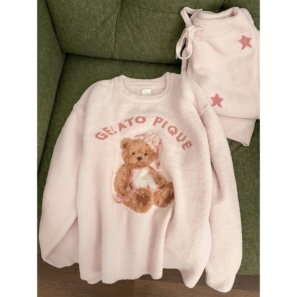 달콤한 핑크 만화 곰 니트 반 벨벳 잠옷 여성의 가을과 겨울 새로운 두꺼운 따뜻한 집 옷 세트