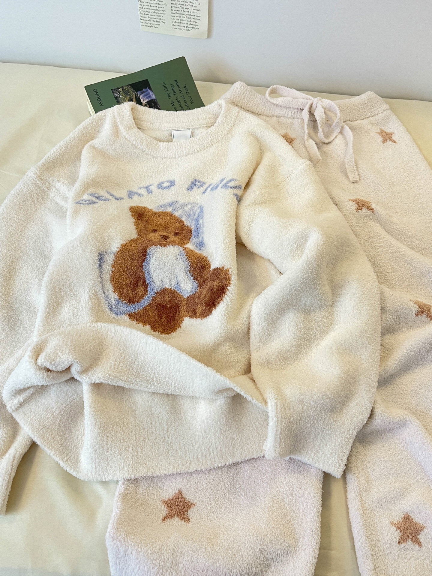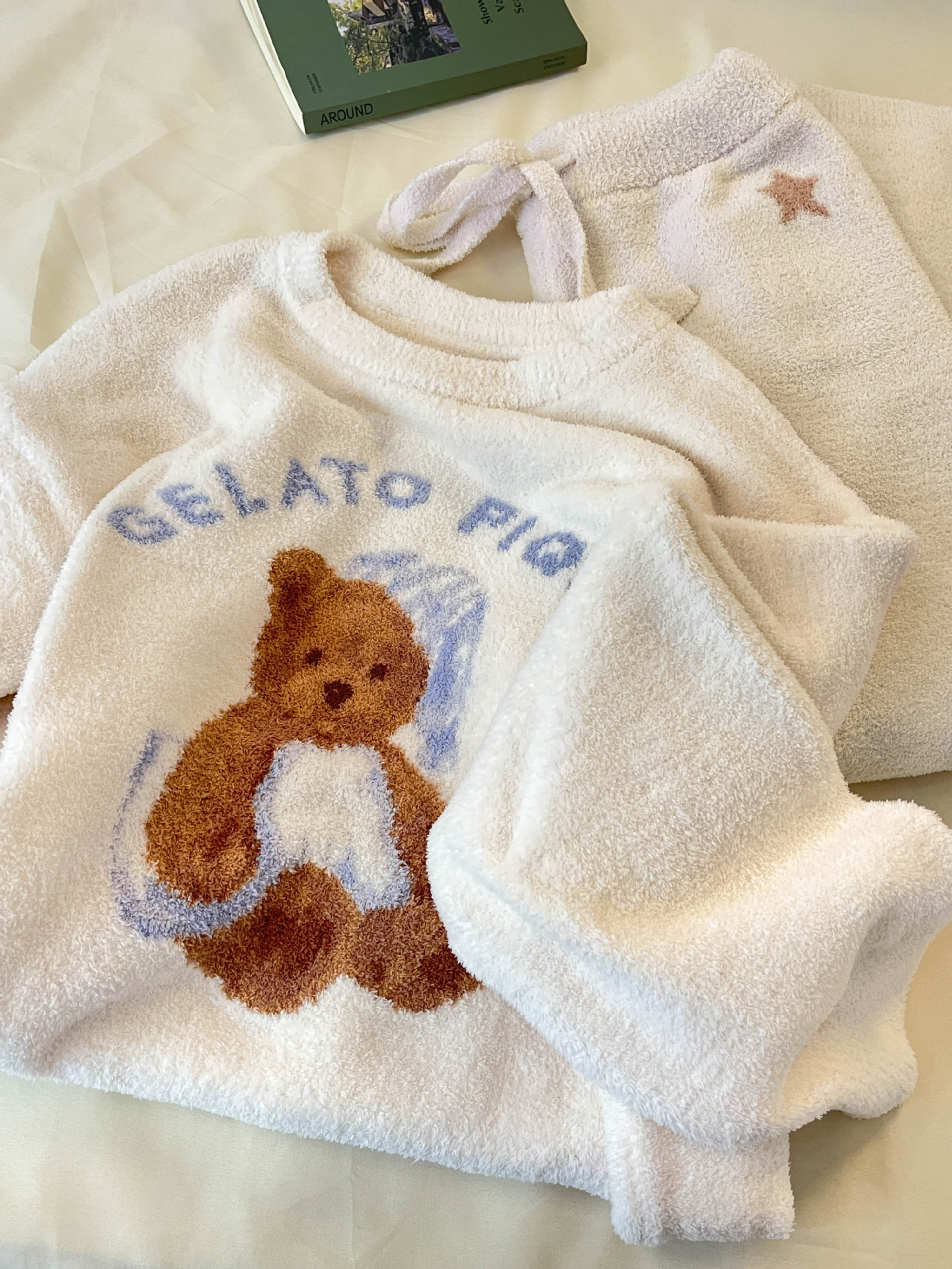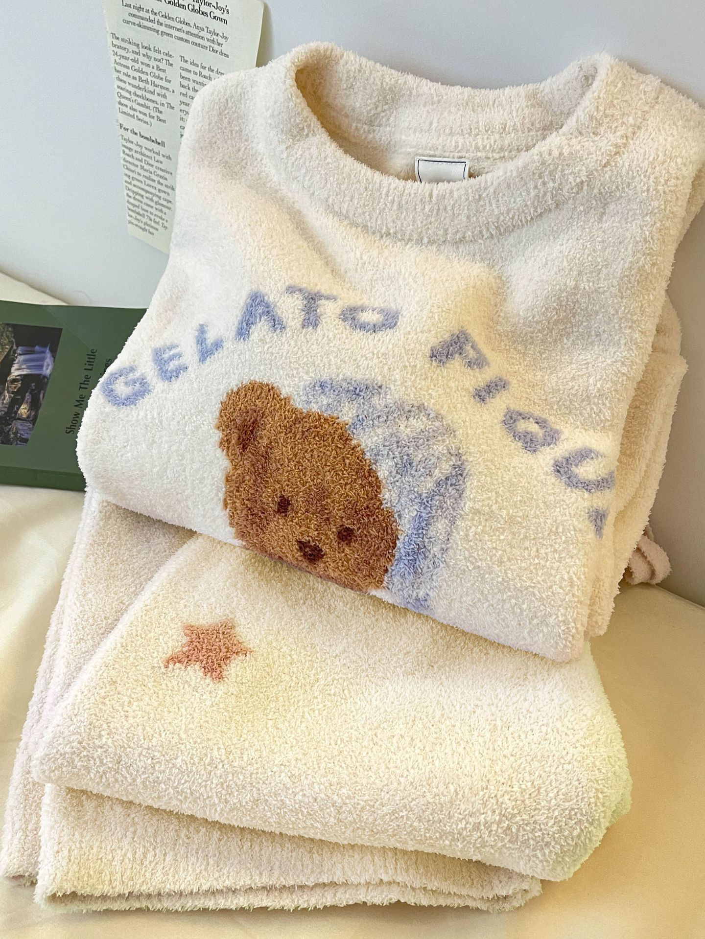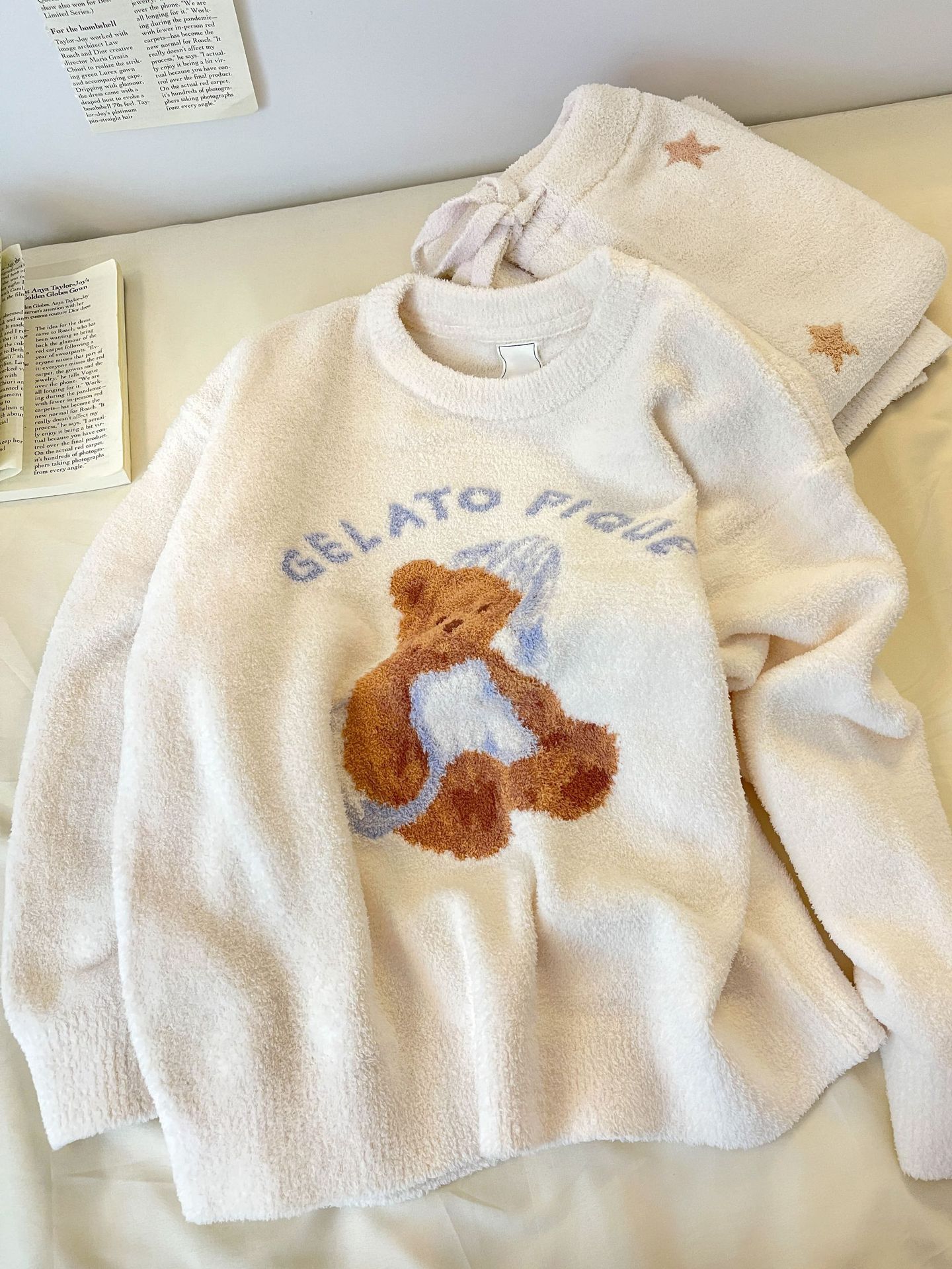 달콤한 핑크 만화 곰 니트 반 벨벳 잠옷 여성의 가을과 겨울 새로운 두꺼운 따뜻한 집 옷 세트