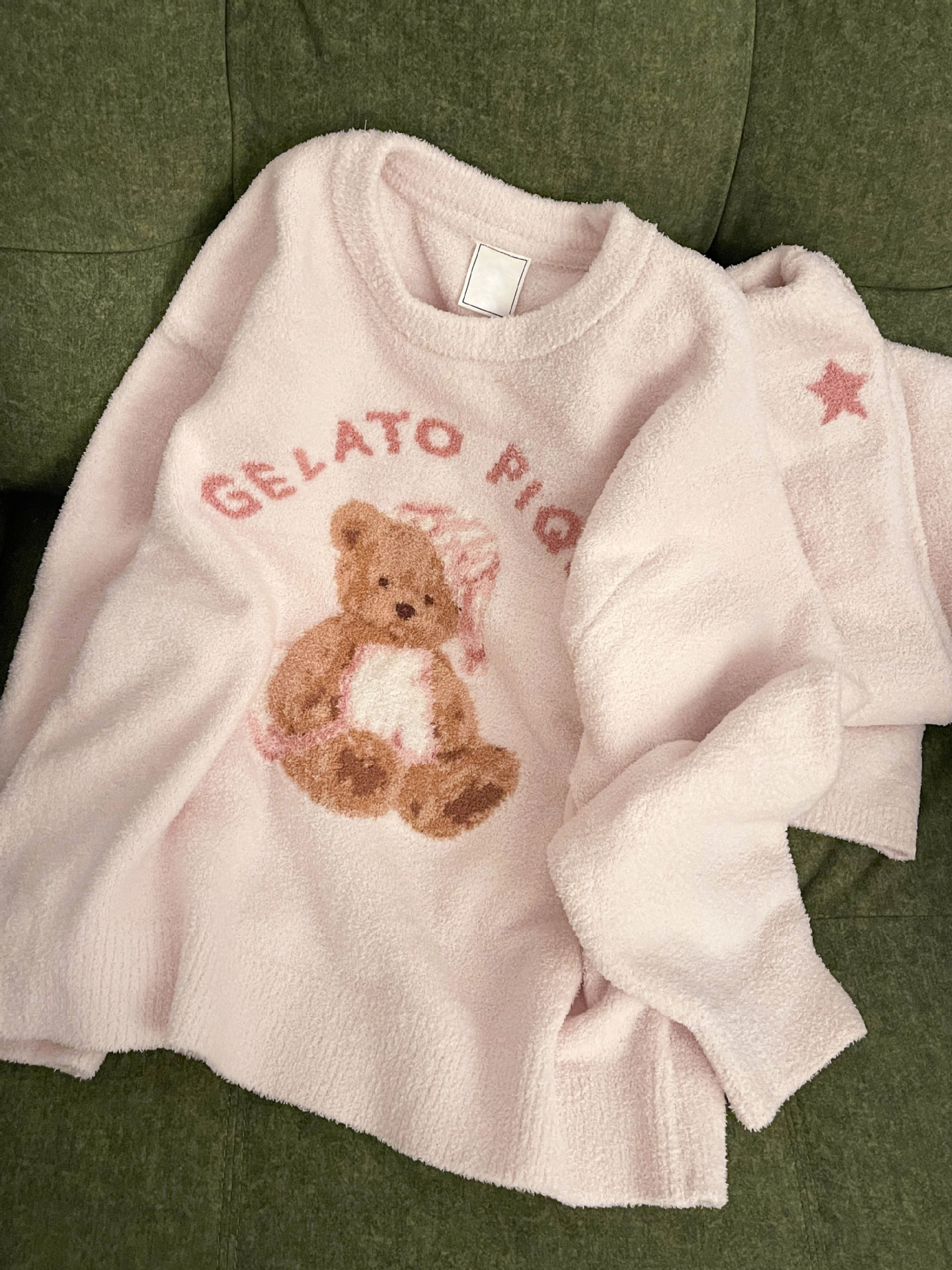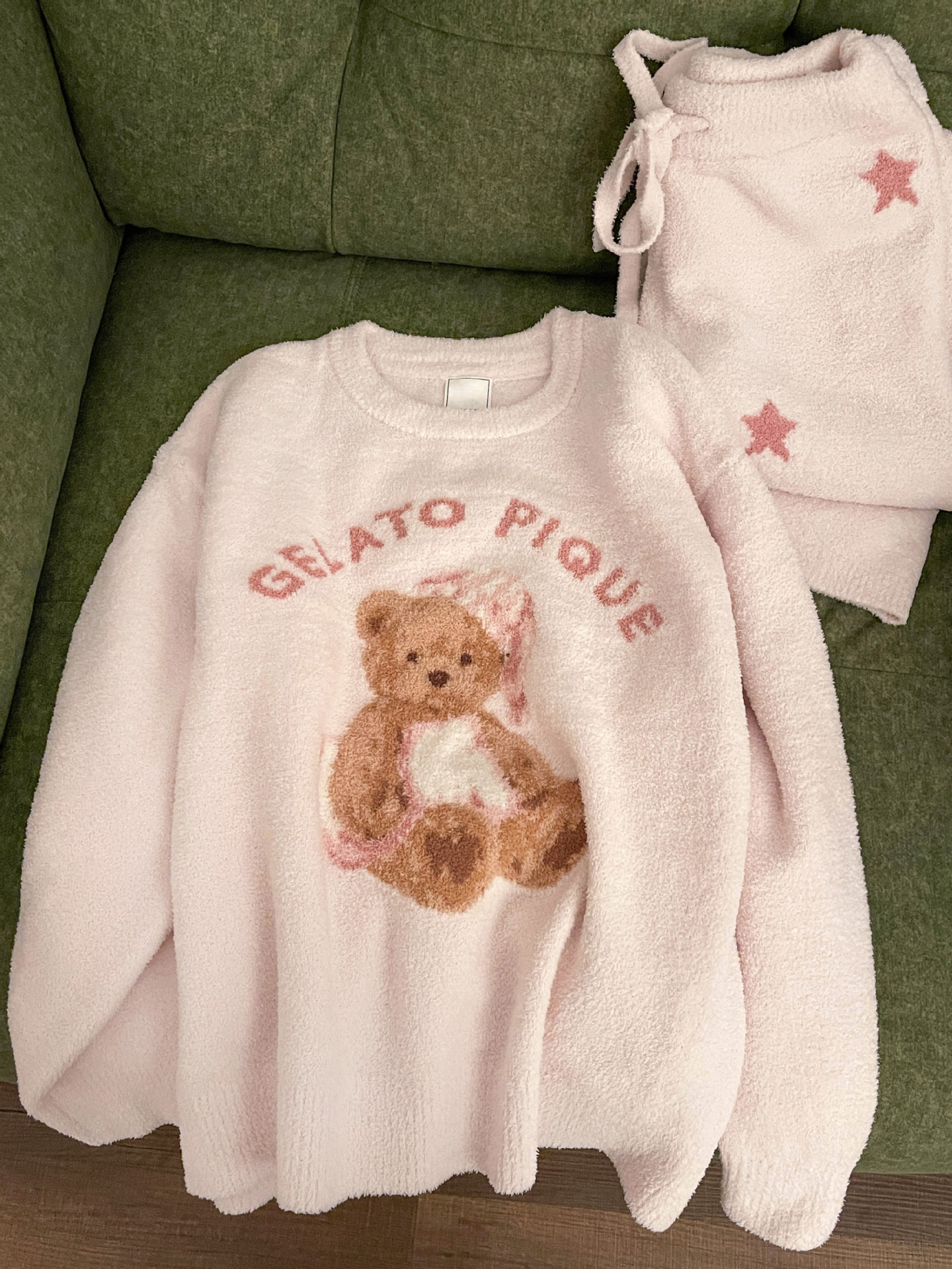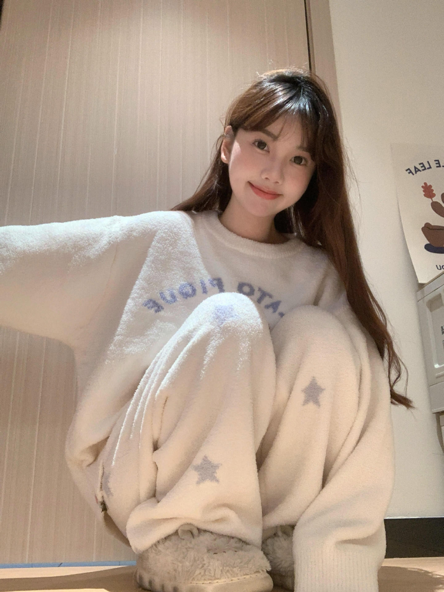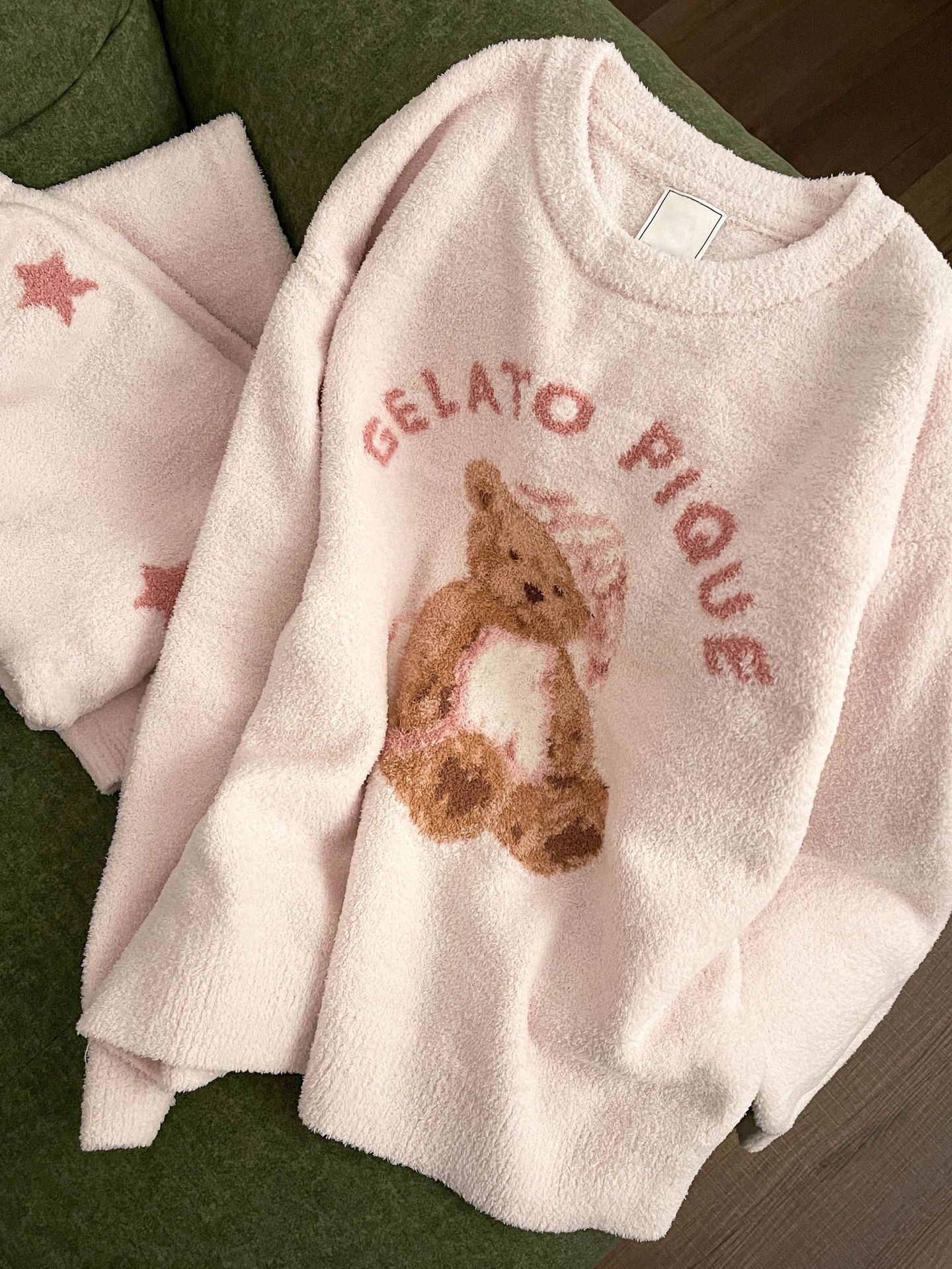달콤한 핑크 만화 곰 니트 반 벨벳 잠옷 여성의 가을과 겨울 새로운 두꺼운 따뜻한 집 옷 세트